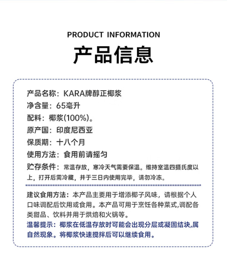 KARA brand pure and thick coconut milk 65ml*12 bottles Jiale refuses to add raw coconut latte in milk tea shop