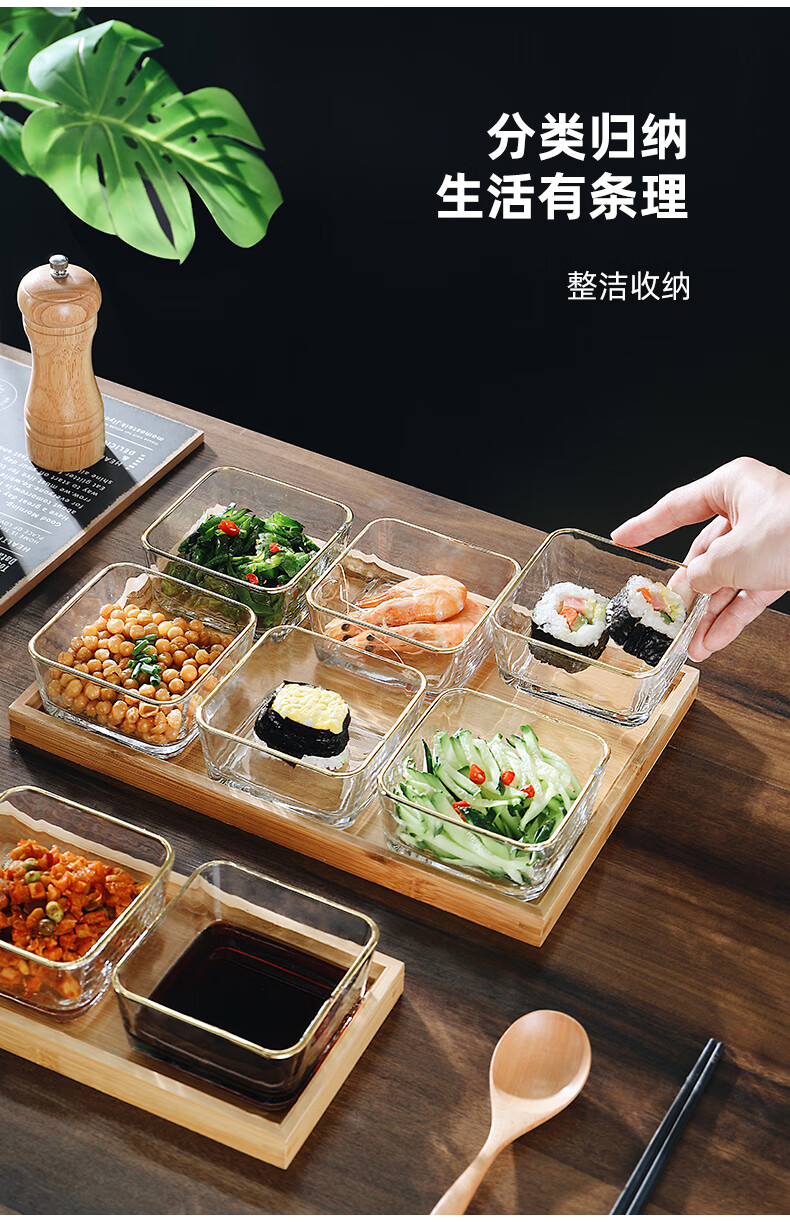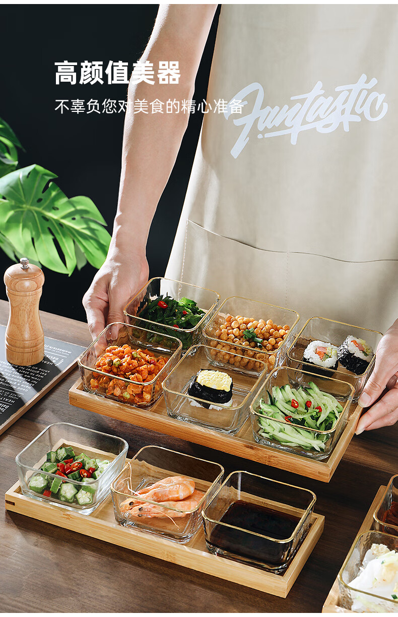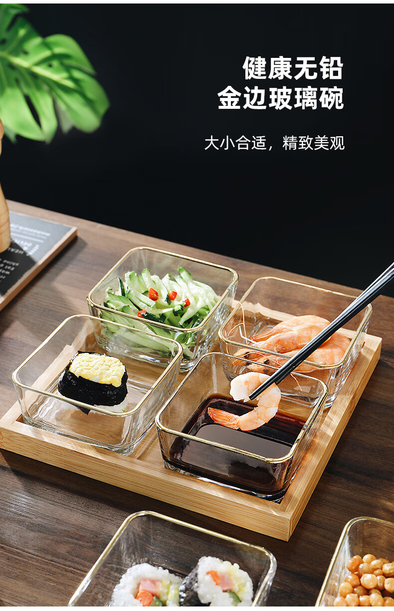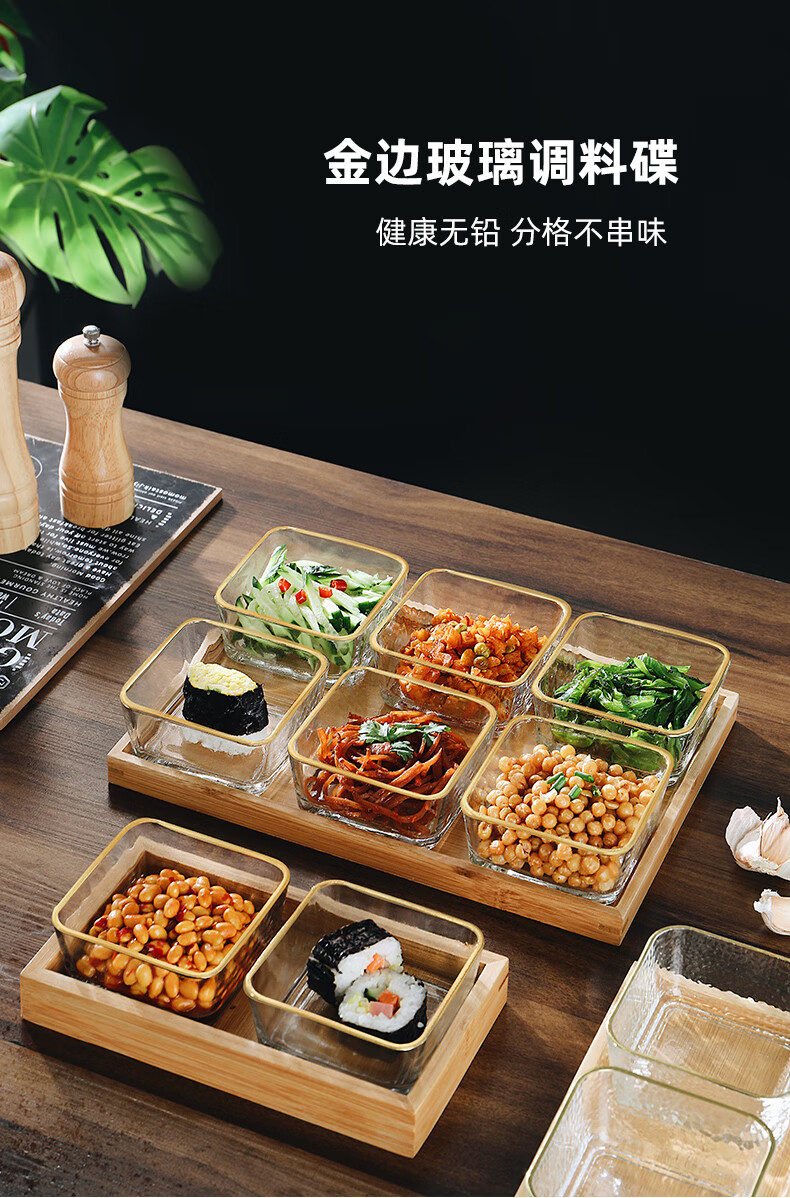 Genasi divided dipping dish, snack platter, household dish, hot pot sauce dish, seasoning dish, oil dish, vinegar dish with tray, 6 gold-rimmed glass bowls + six-grid bamboo plate