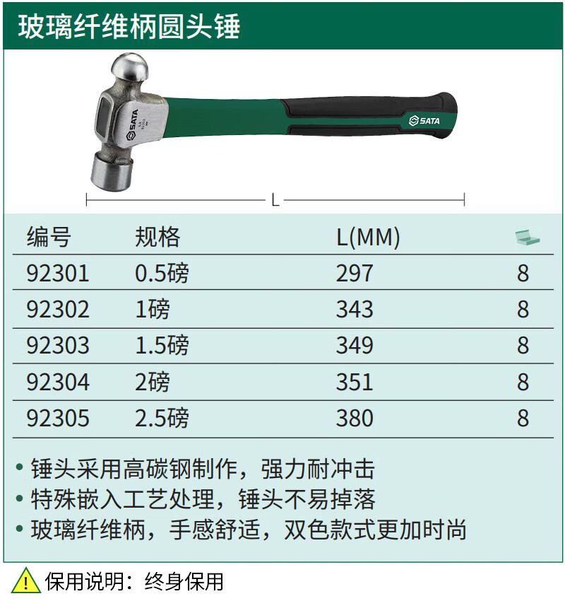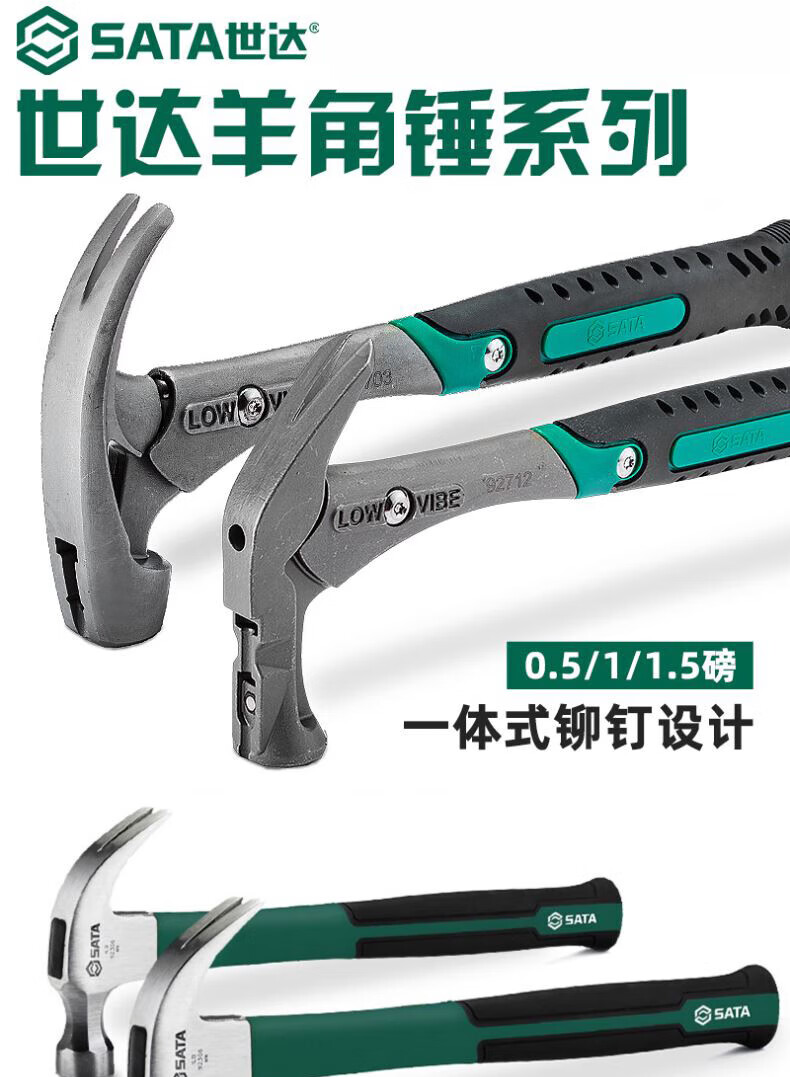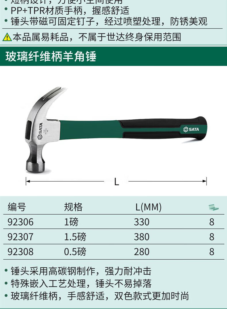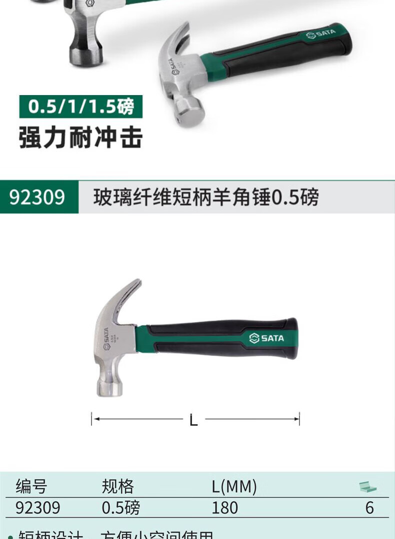 SATA 92309 Fiberglass Short Handle Claw Hammer 0.5 lbs.
