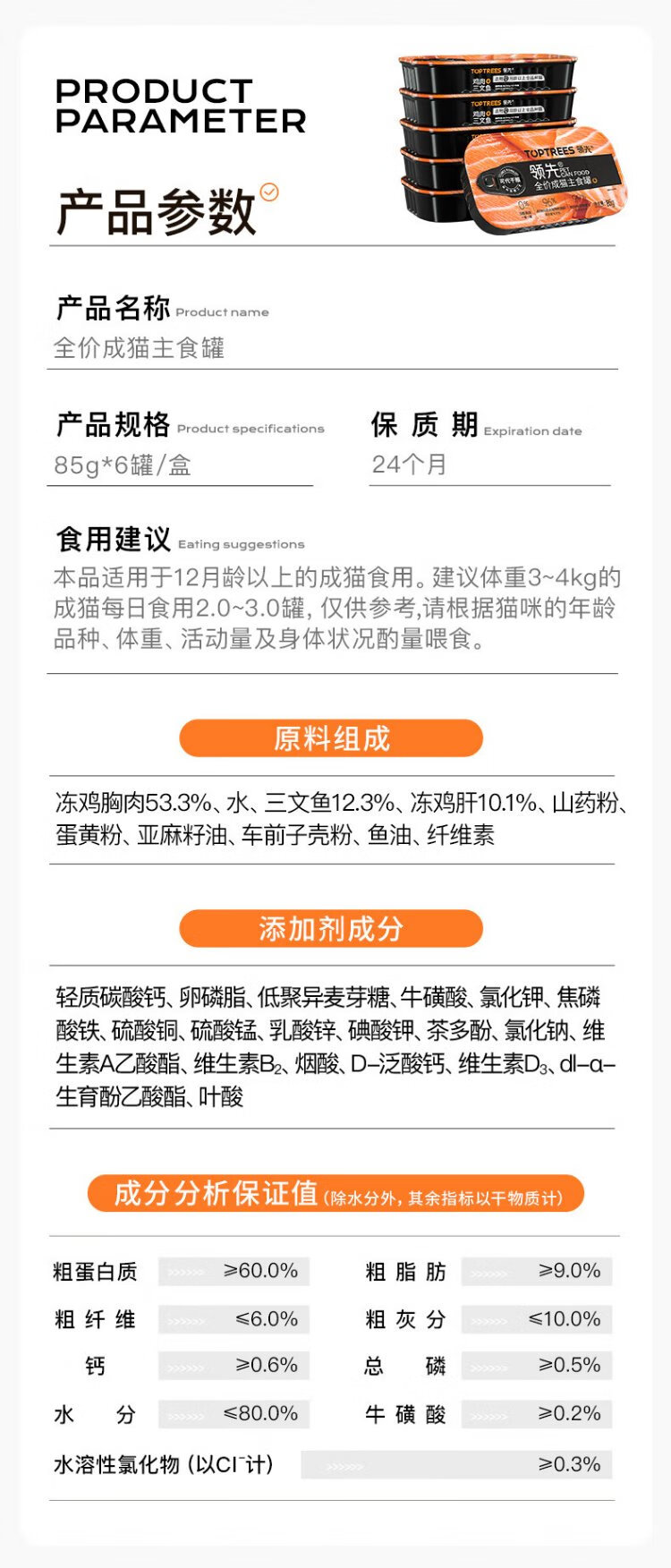 Leading adult cat staple food canned chicken salmon staple food grade full price cat snacks wet food 85g*6 cans with transparent raw materials
