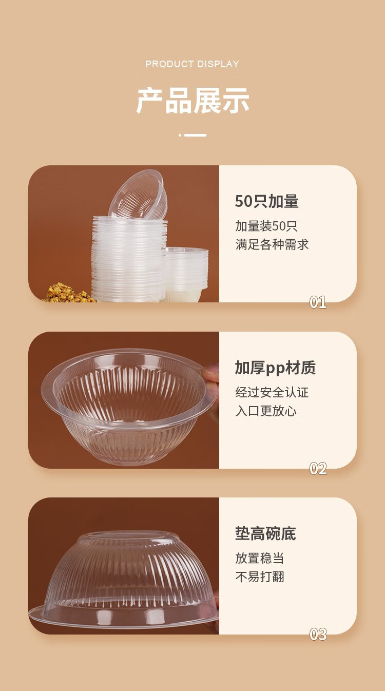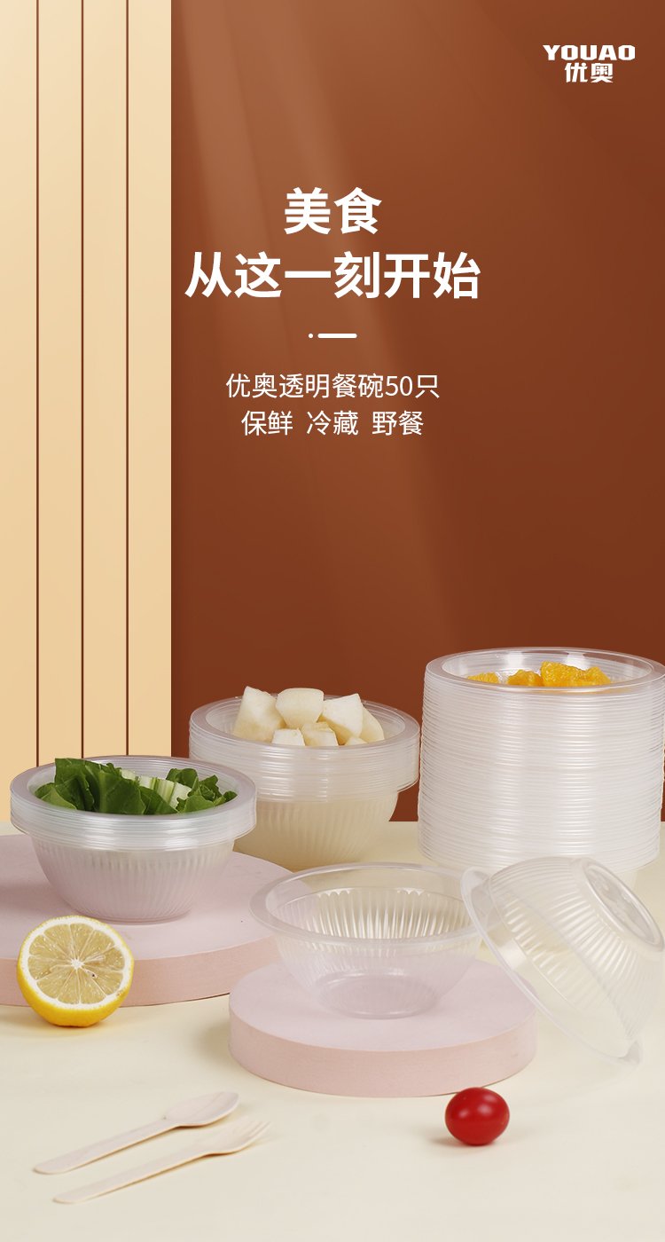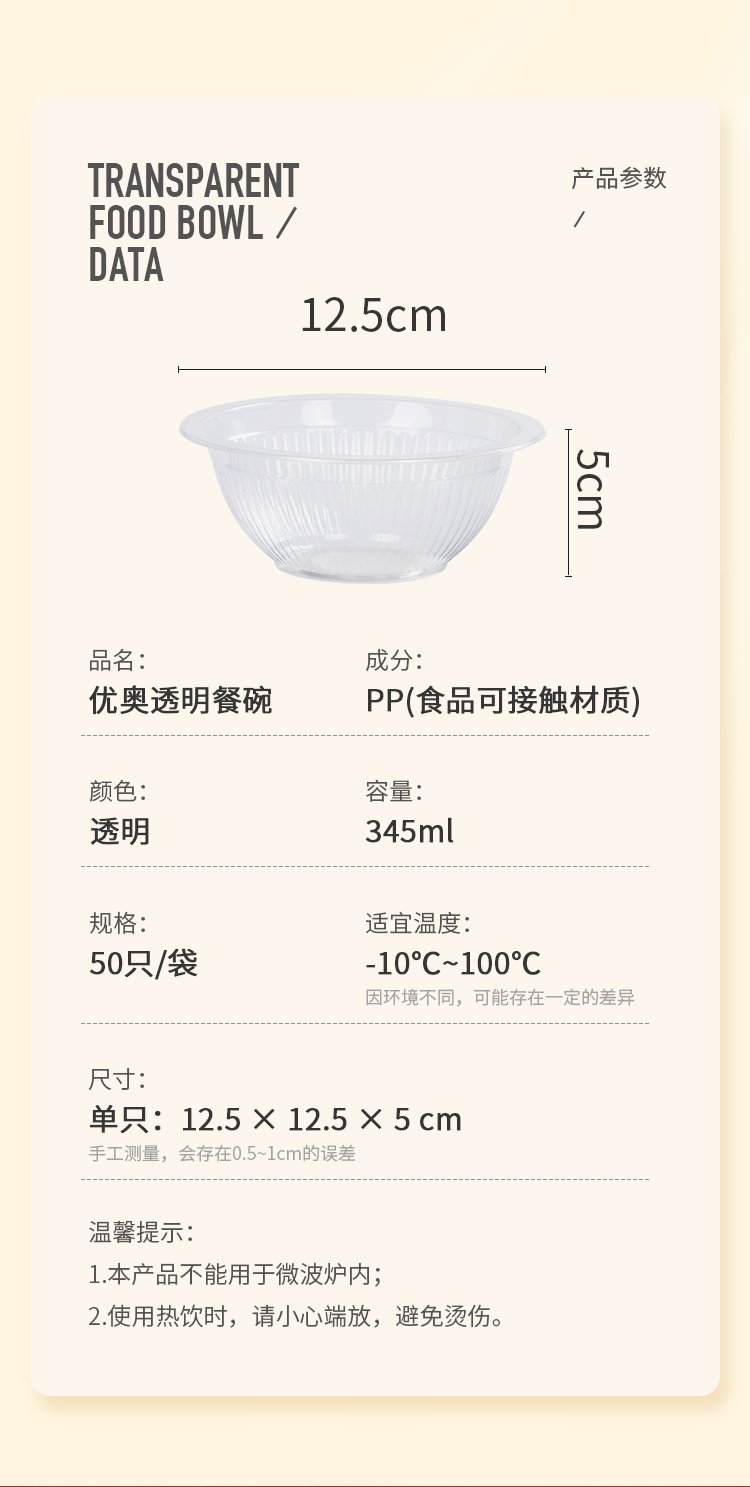Youao disposable bowl 345ml*50 thick transparent dumplings and glutinous rice balls soup bowl outdoor picnic camping tableware no wash