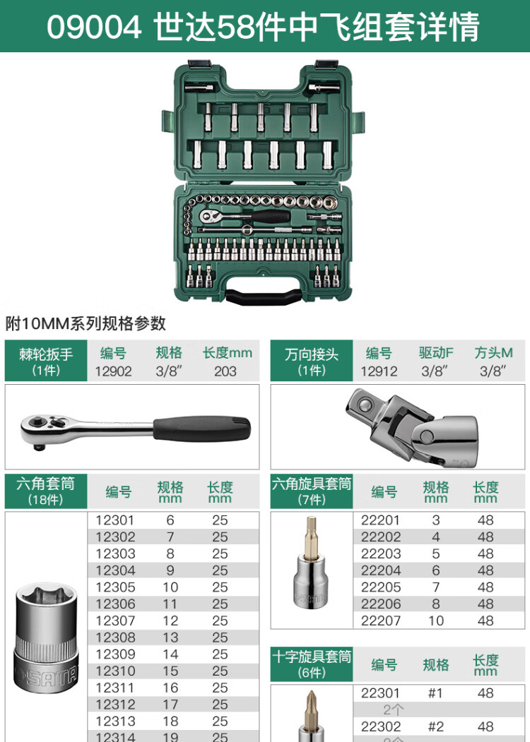 SATA 60-piece set 10MM ratchet wrench socket set auto repair and maintenance set Zhongfei ratchet wrench set 09004