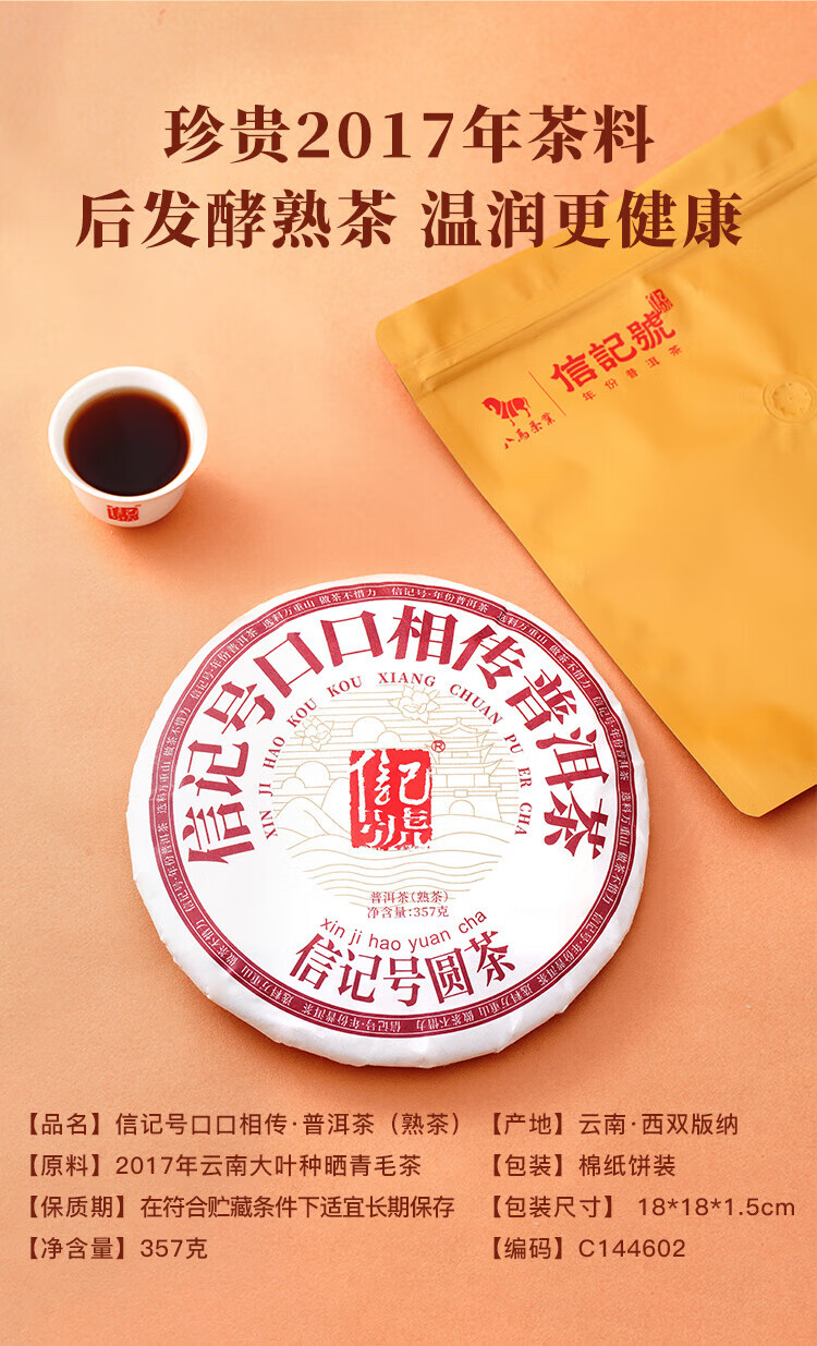 Bama Tea Industry Signature Chinese Time-honored Brand Pu'er Tea Xishuangbanna Ripe Pu'er Tea 357g 2017 Cake Tea