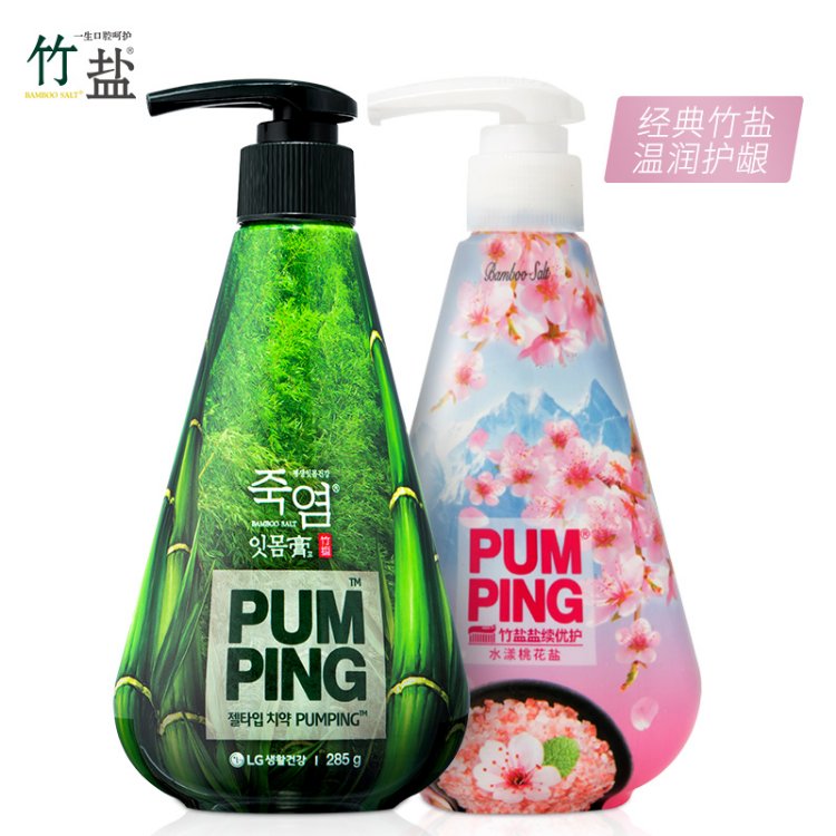 Bamboo salt LG Paibin push-on toothpaste 285g*2 bottles set (fresh mint + peach blossom salt) cleans the mouth with light tooth stains