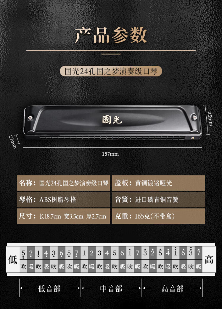 Guoguang 24-hole #D key Guozhimeng performance-grade specially tuned polyphonic harmonica (Athens black, with playing instructions) #D key