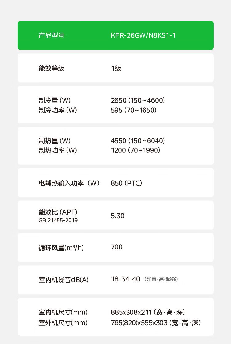Midea air conditioner, cool and energy-saving, large 1 horse, new level of energy efficiency, frequency conversion for heating and cooling the bedroom, double row copper tube evaporator, air conditioner hang-up state subsidy KFR-26GW/N8KS1-1