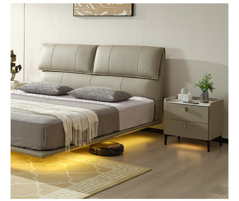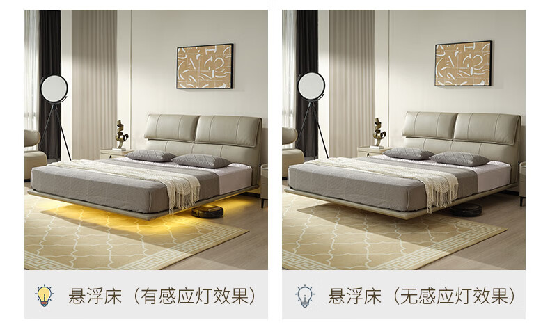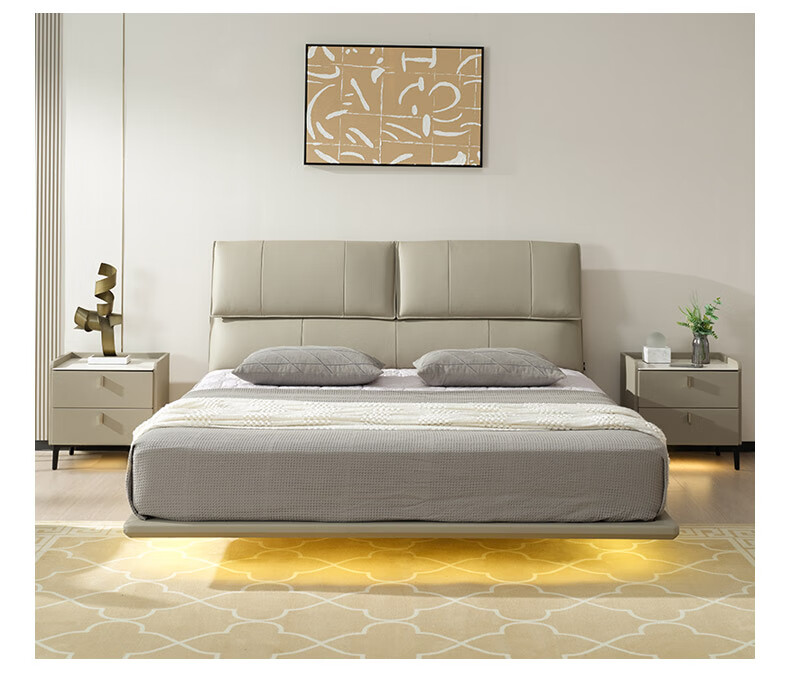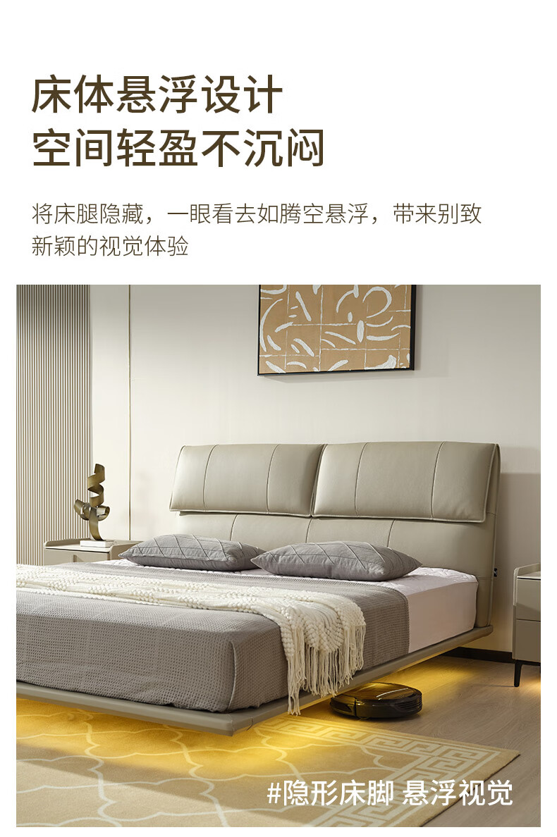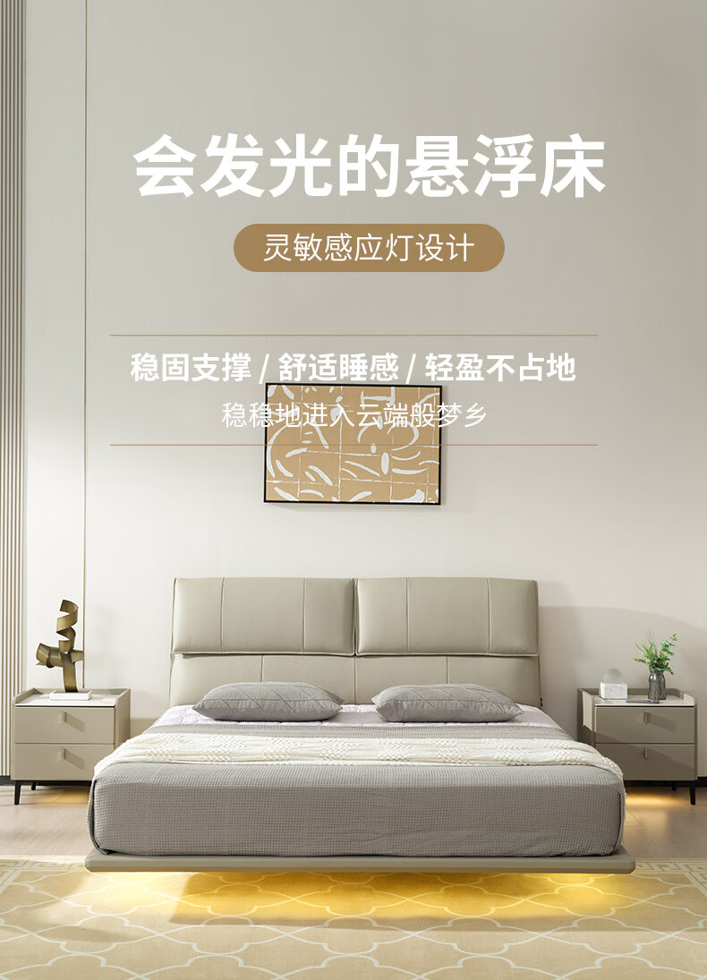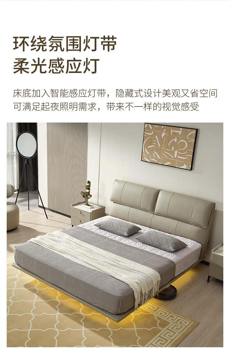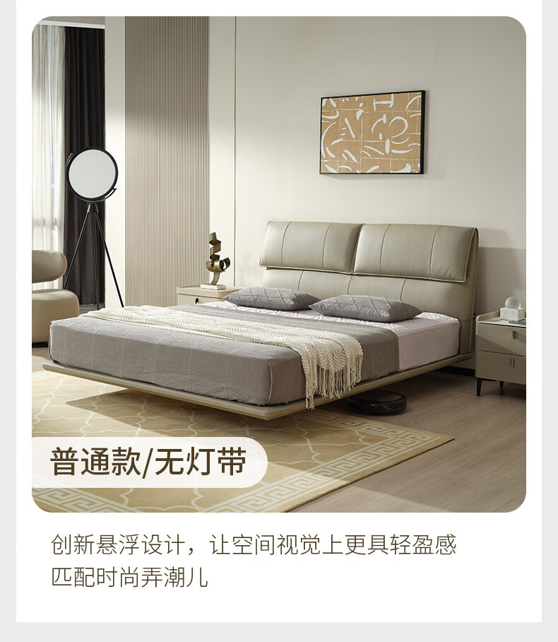 Mousse (de RUCCI) Leather Bed Suspended Bed Double Master Bedroom Queen Marriage Bed Dark Gray Suspended Bed-Light Strip Style 1.8*2m