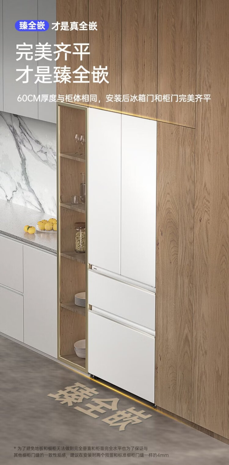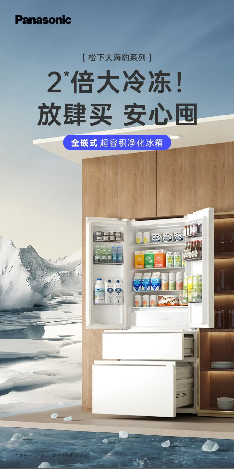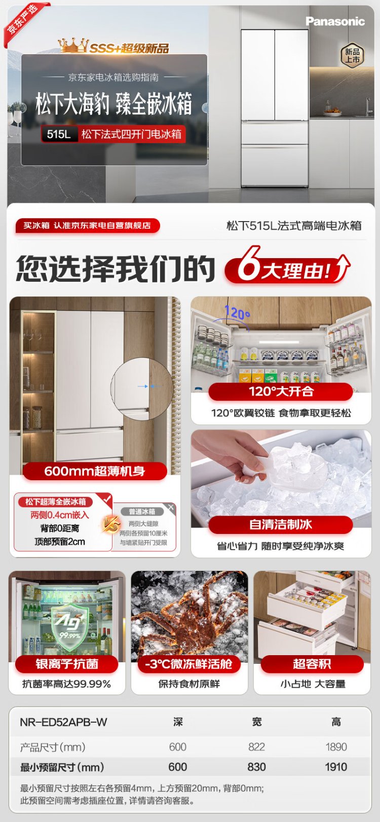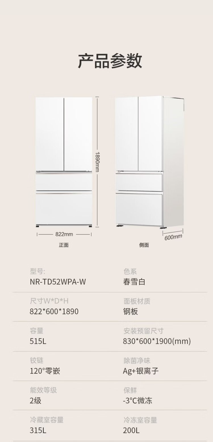Panasonic 515L French multi-door four-door refrigerator 60CM ultra-thin zero-embedded automatic ice making double circulation air duct large freezer NR-TD52WPA-W large seal spring snow white