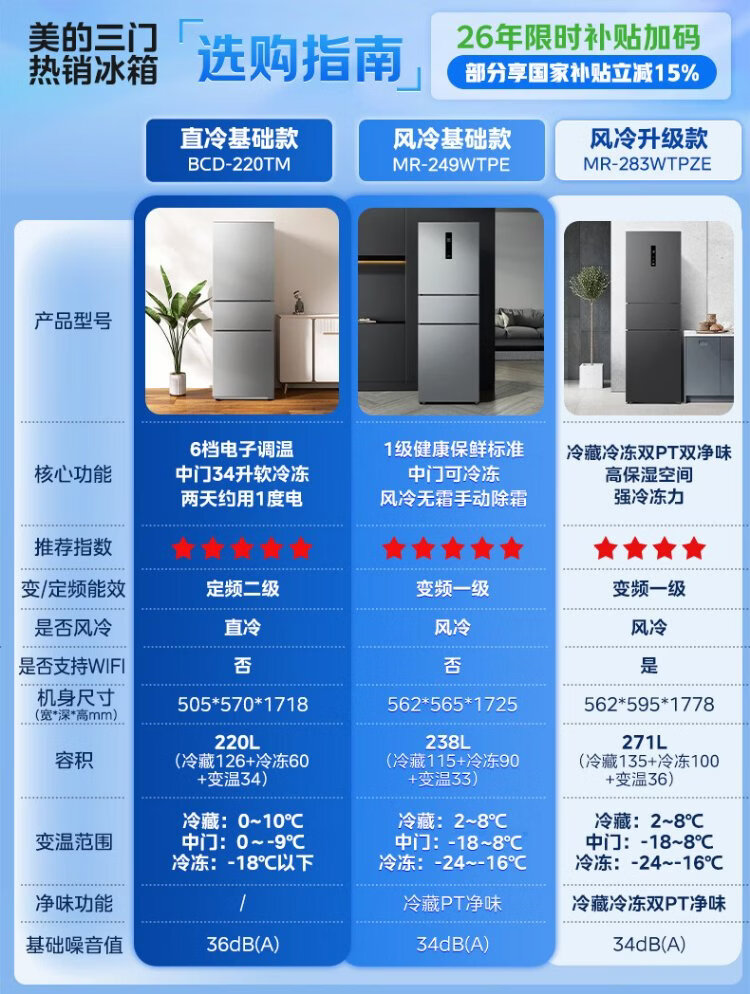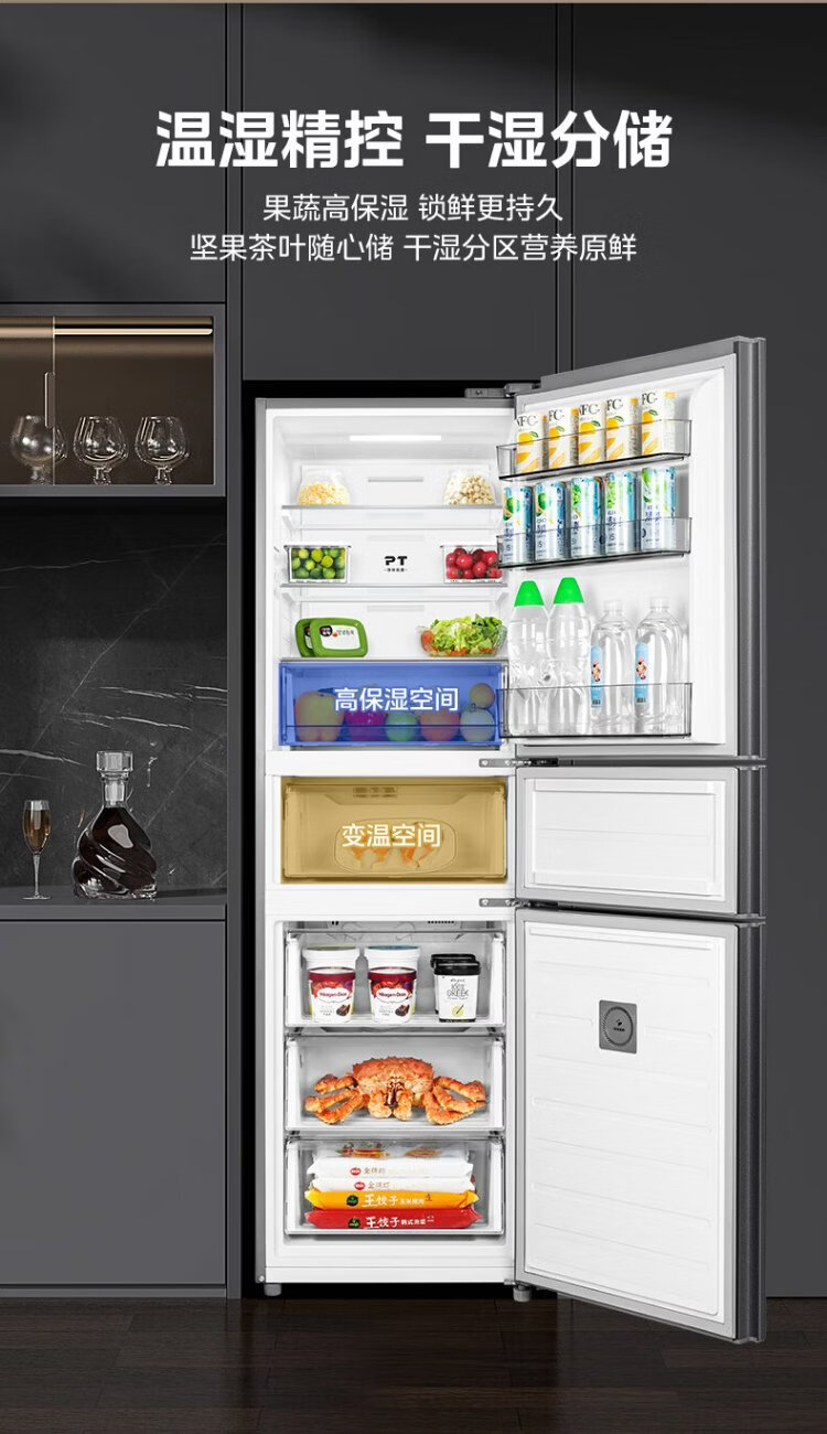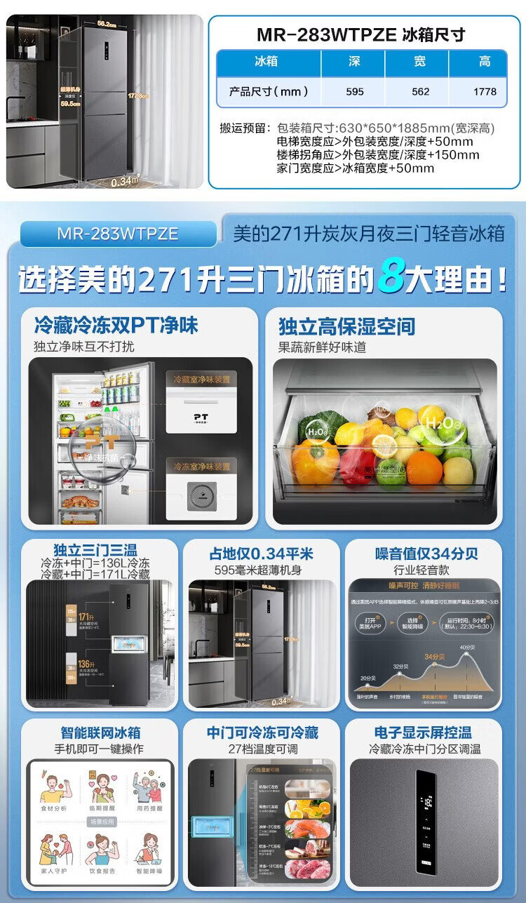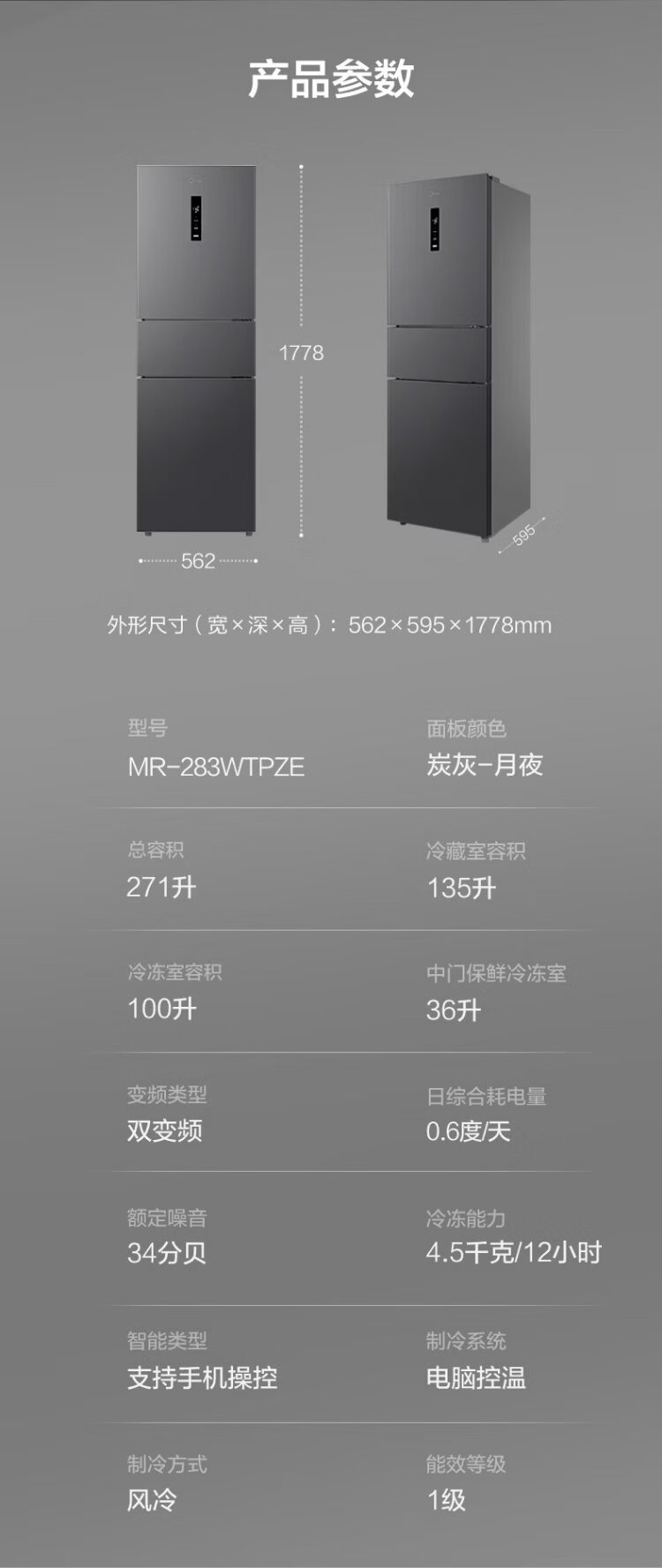 Midea 271 liter three-door refrigerator gray small refrigerator three-door first-class energy efficiency energy-saving air-cooled frost-free double purification home rental MR-283WTPZE national subsidy