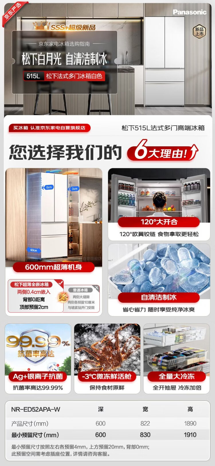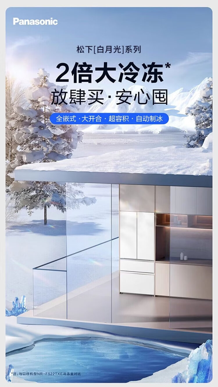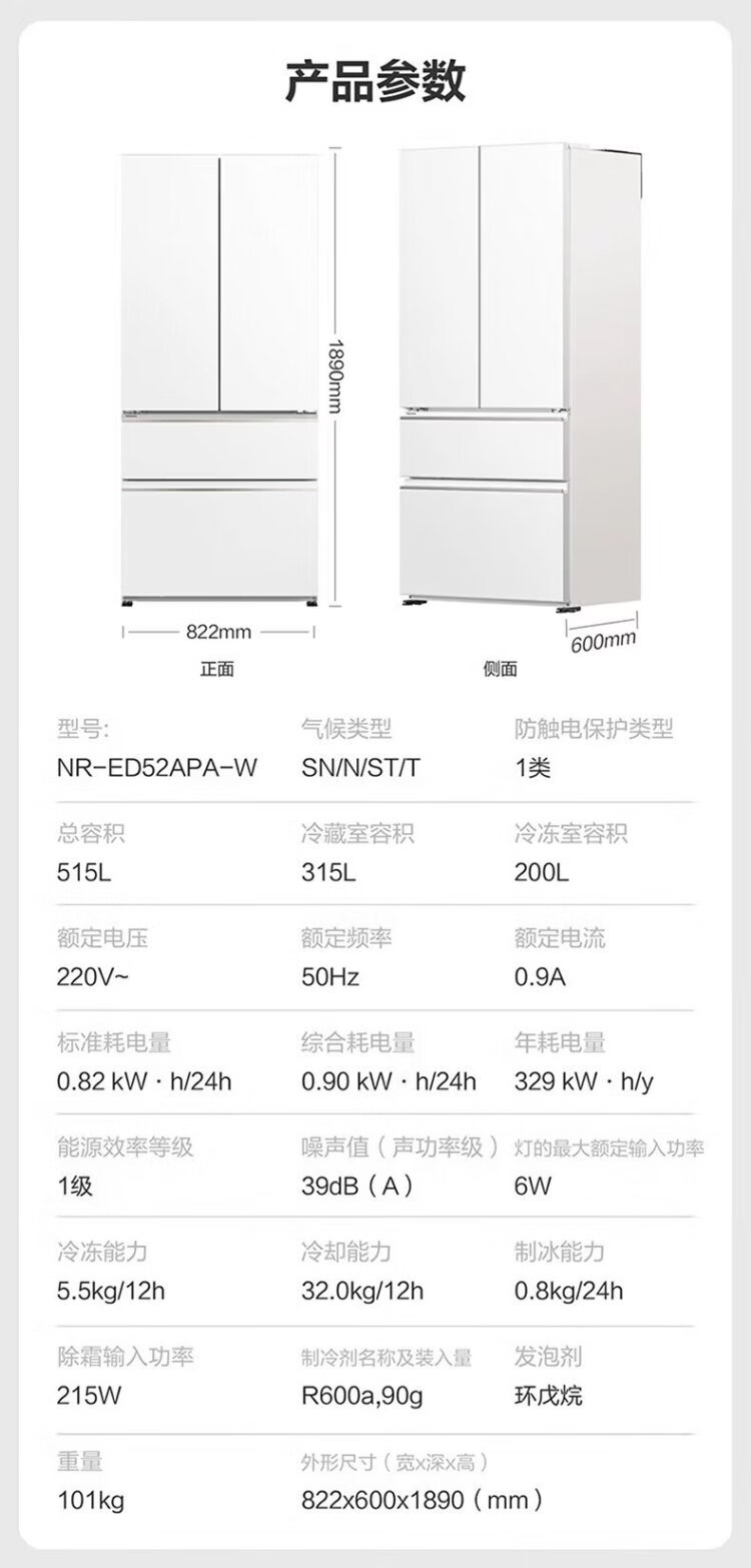 Panasonic Golden List White Moonlight 515L French style multi-door ultra-thin zero-embedded automatic ice making level 1 NR-ED52APA-W