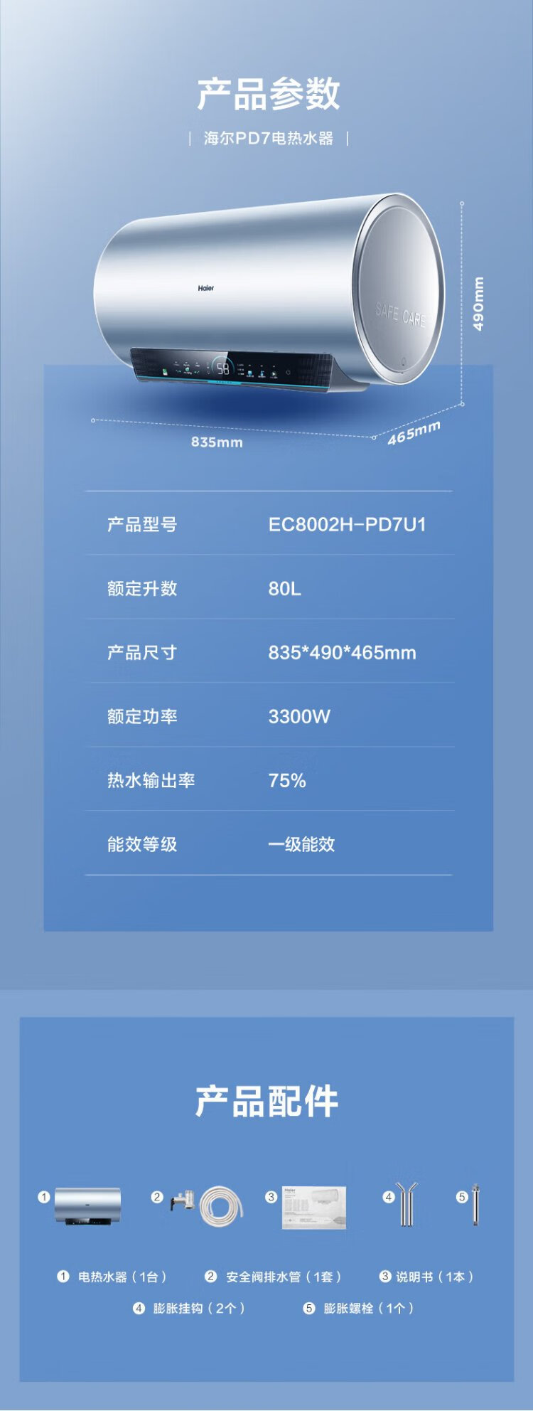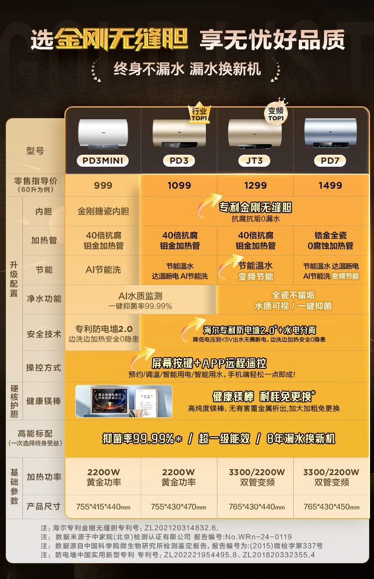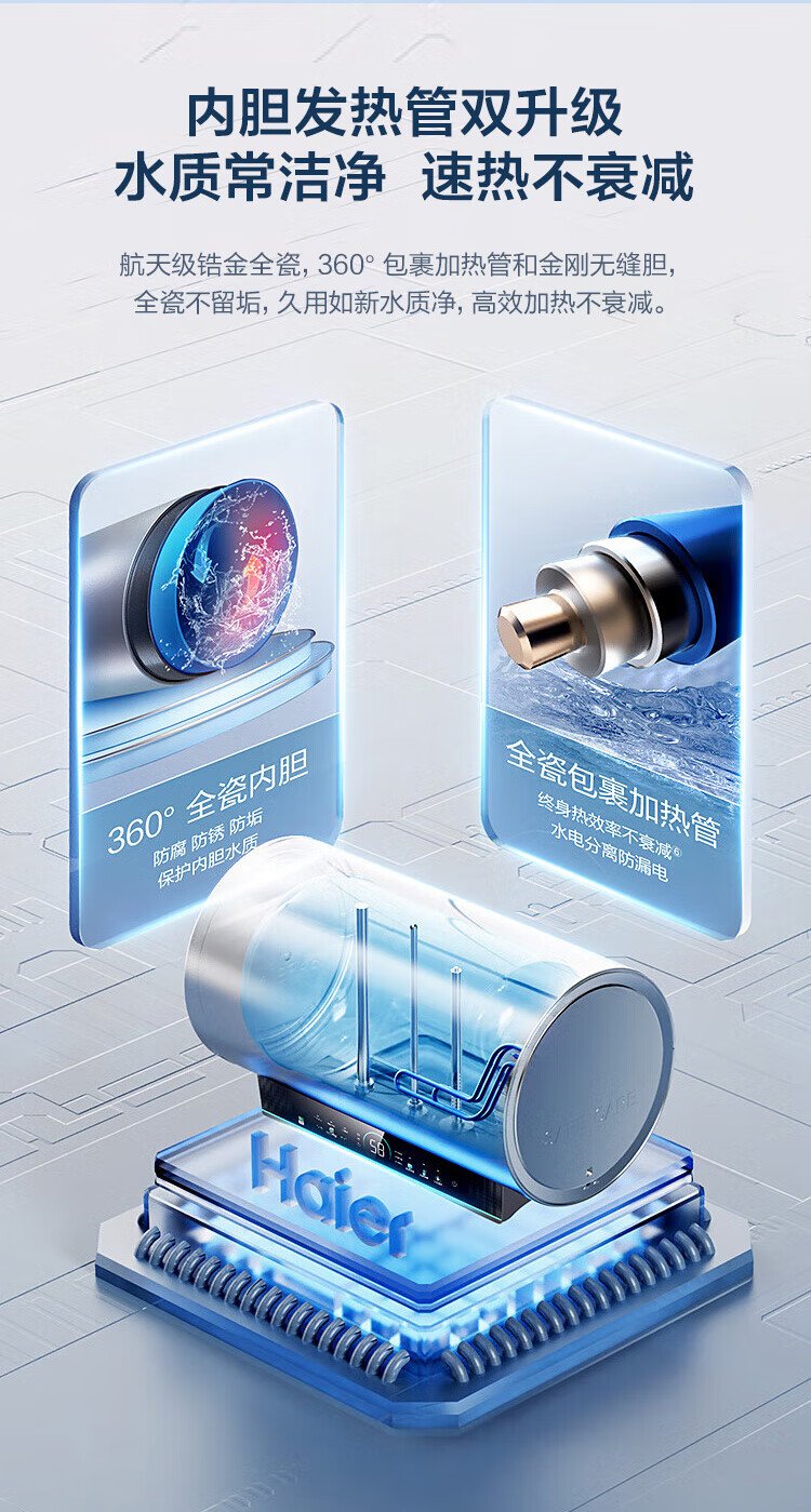 Haier (Haier) state-subsidized electric water heater 80 liters PD7 King Kong seamless bladder water and electricity separation 3300W variable frequency fast heating first-class energy efficiency lifetime no need to replace magnesium rod household water storage type
