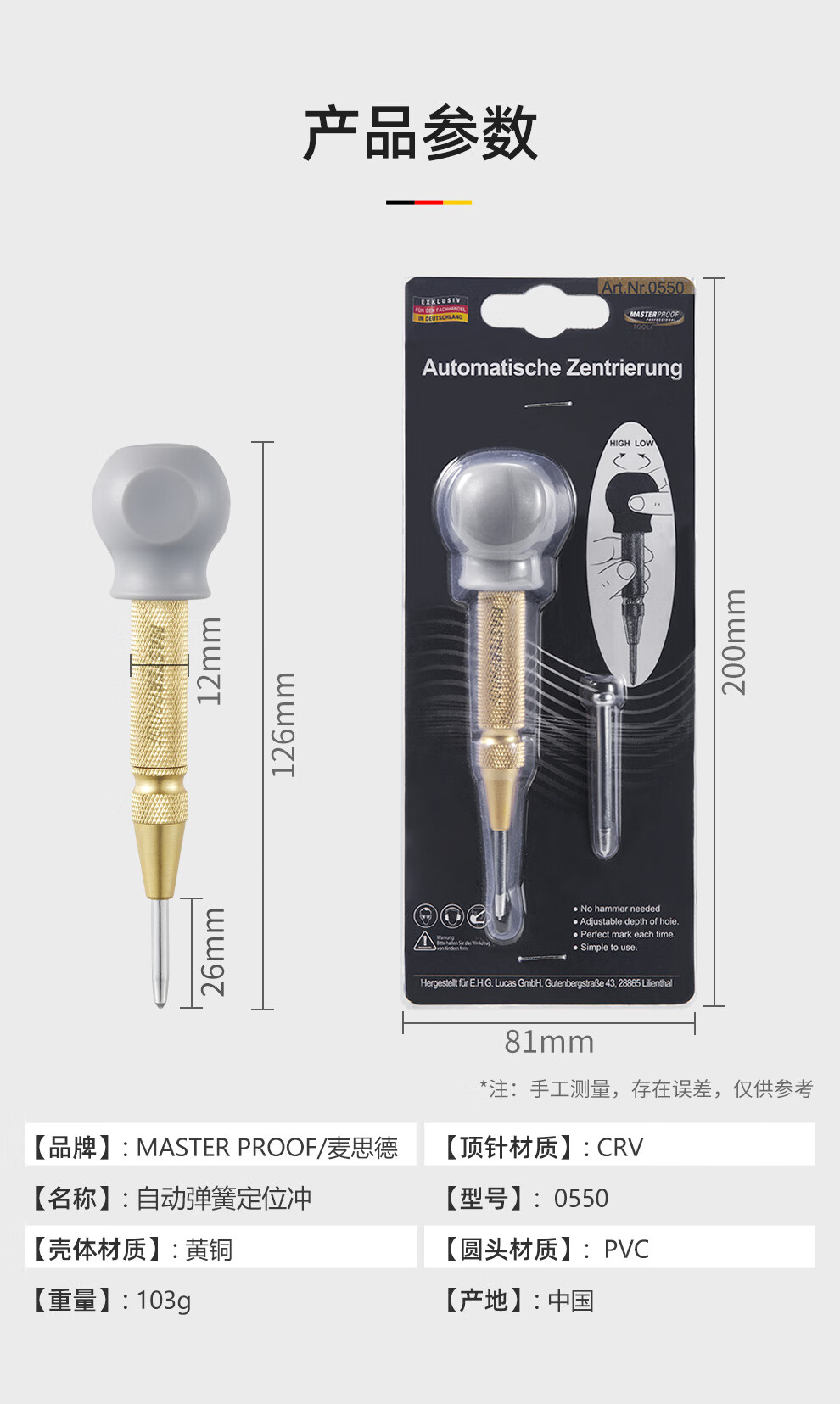 MASTERPROOF automatic positioning punch, high hardness drill bit, center positioning punch, spring positioning punch with spare needle