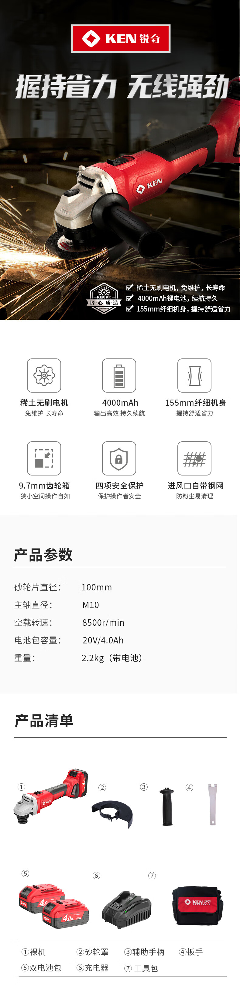 Ruiqi (KEN) lithium electric angle grinder brushless grinding and polishing machine grinder 20V lithium electric cutting machine 100 type 9120-40C
