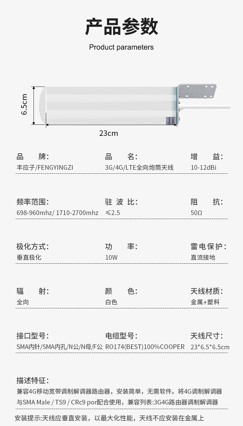 Fengyingzi 3G/4G/LTE barrel antenna mobile phone signal amplifier enhanced receiving antenna universal for three networks SMA inner pin interface 1 meter FYZ-PT1114