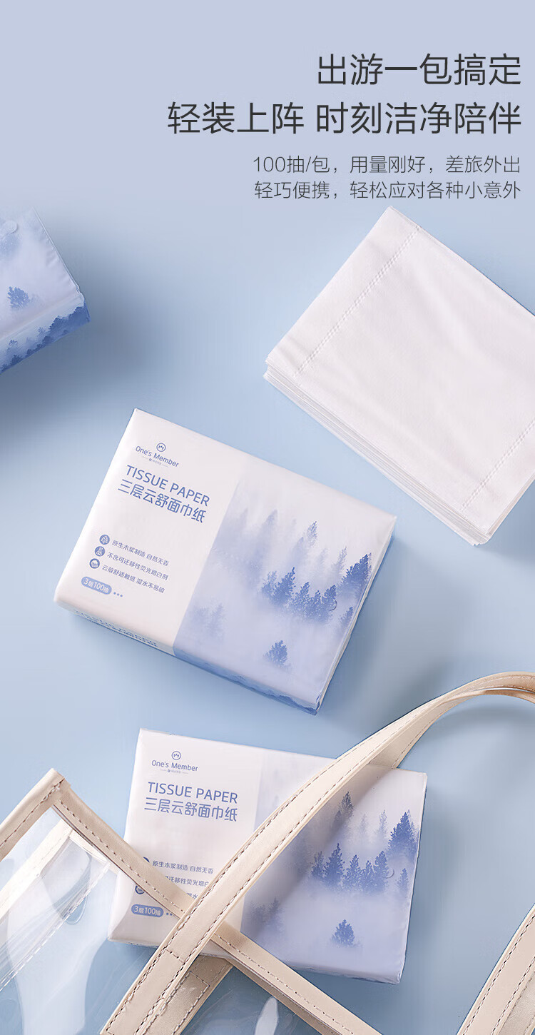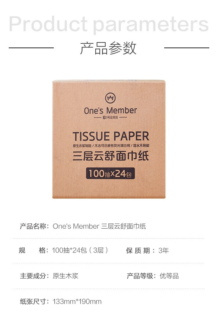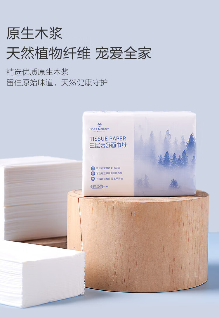 One s Member three-layer Yunshu facial tissue flexible virgin wood pulp paper napkins S size 100*24 pack family pack