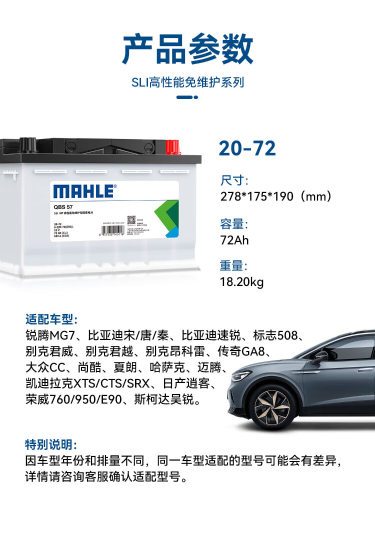 MAHLE car battery 20-72 is suitable for BYD Qin Pro Song 1.5 Song MAX Song PLU Song Pro