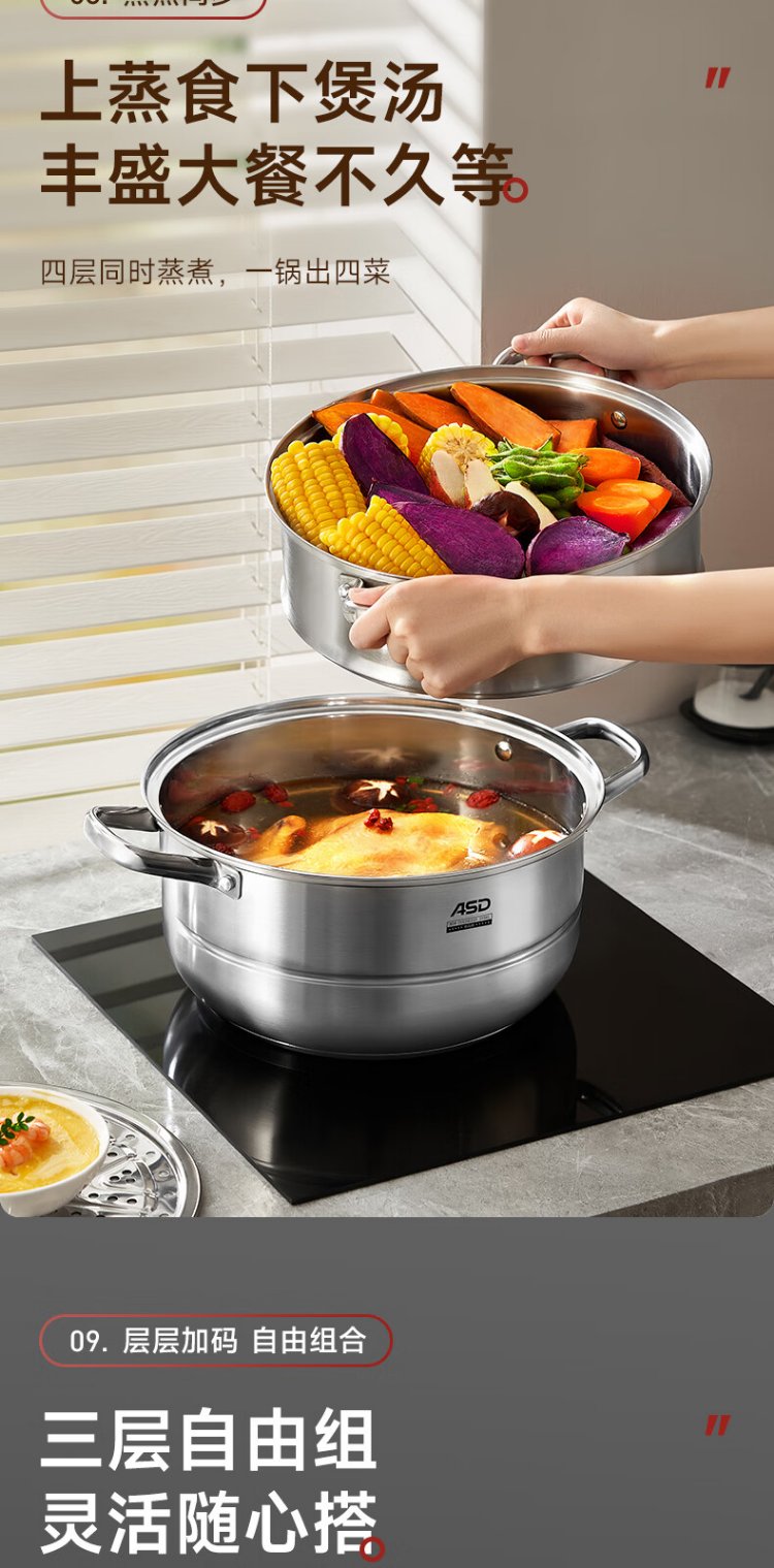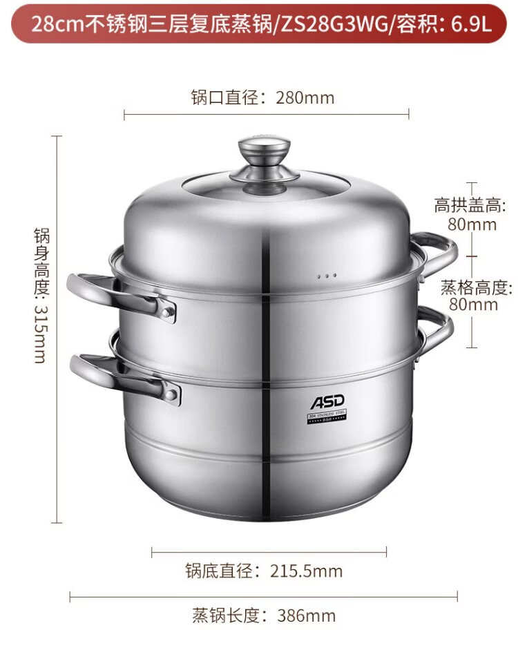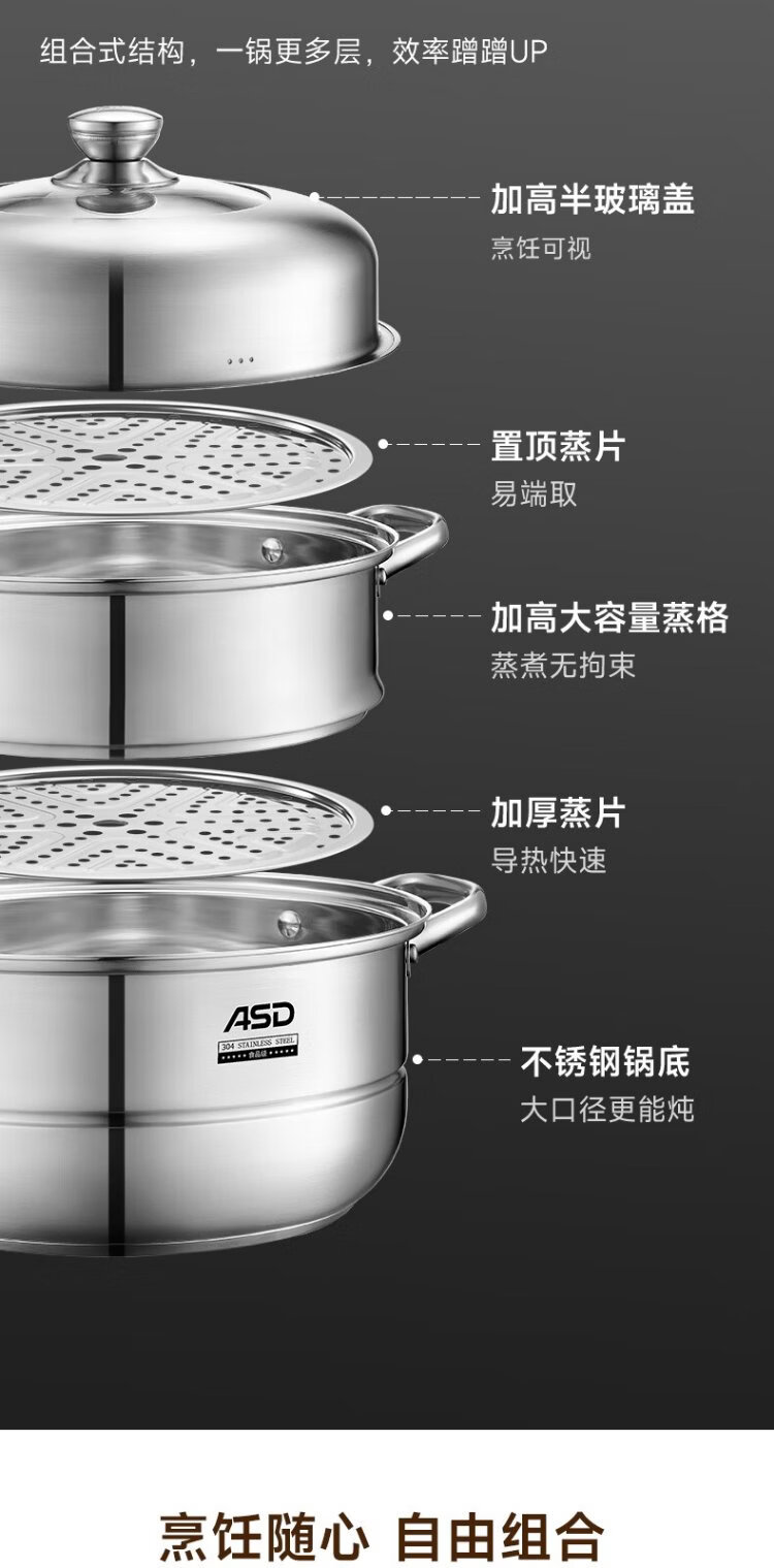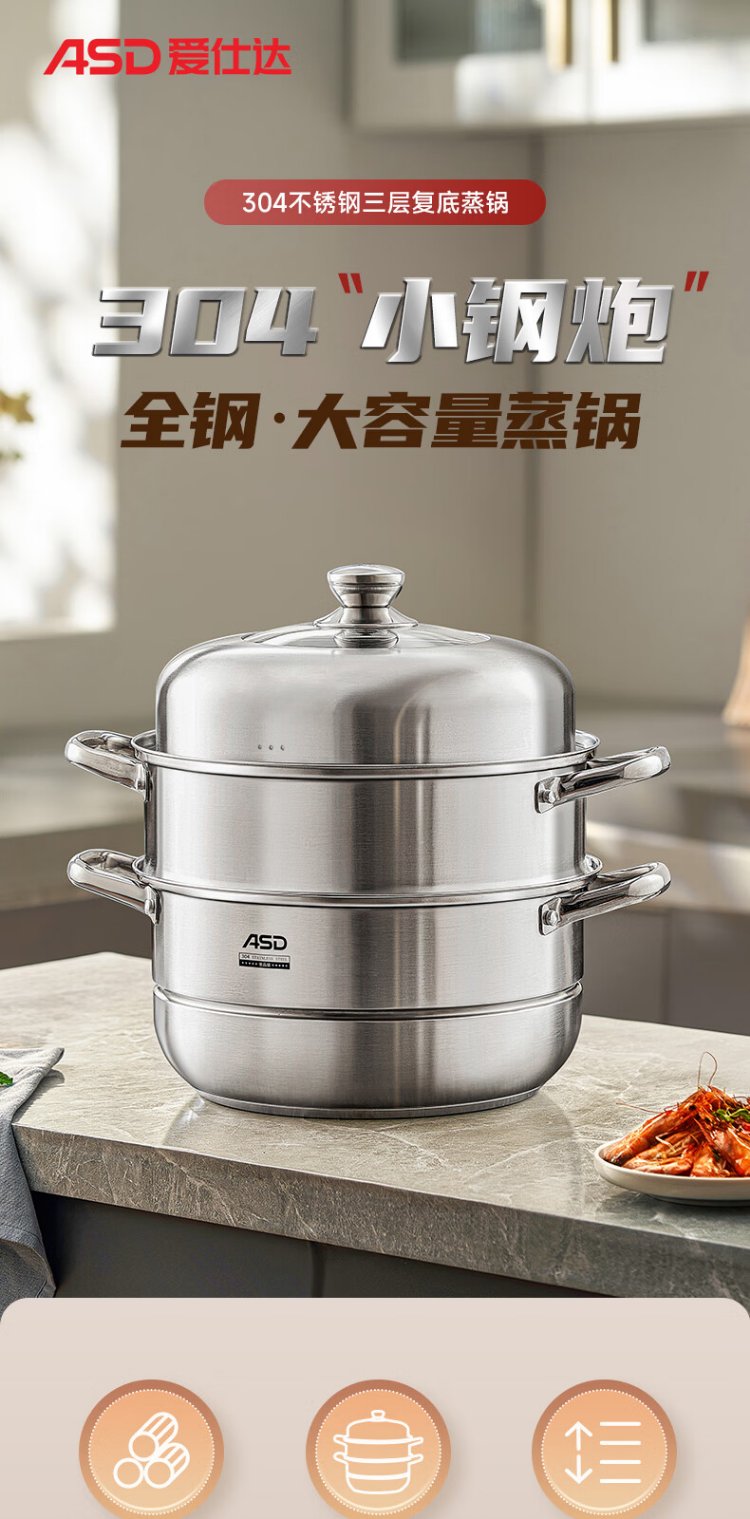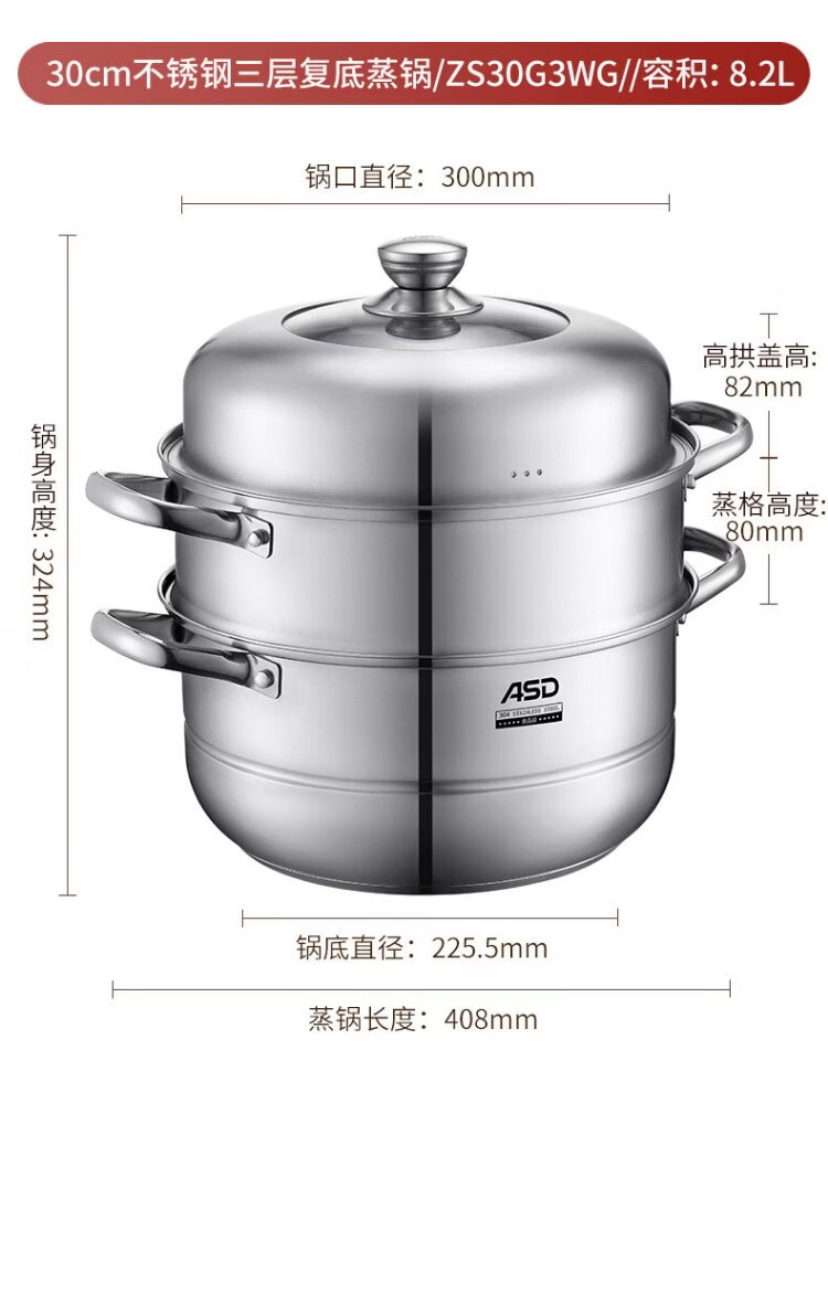 ASD steamer 304 stainless steel three-layer household steaming and stew pot large capacity 30CM double-layer steamer gas universal G3