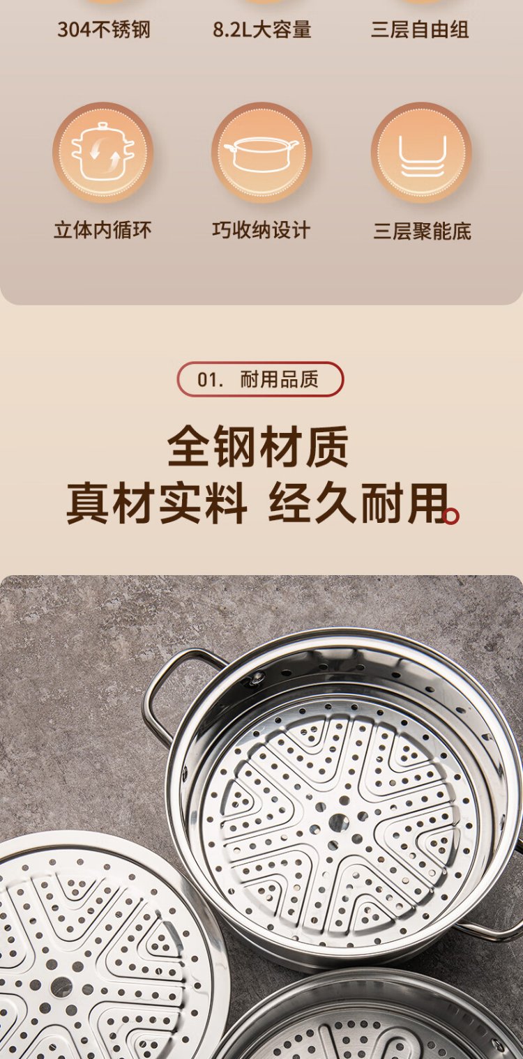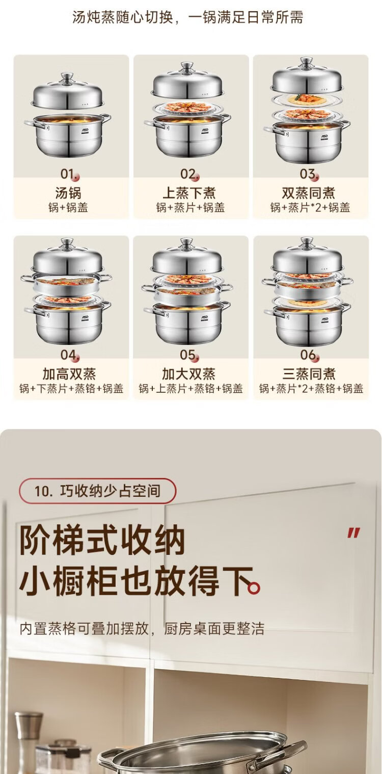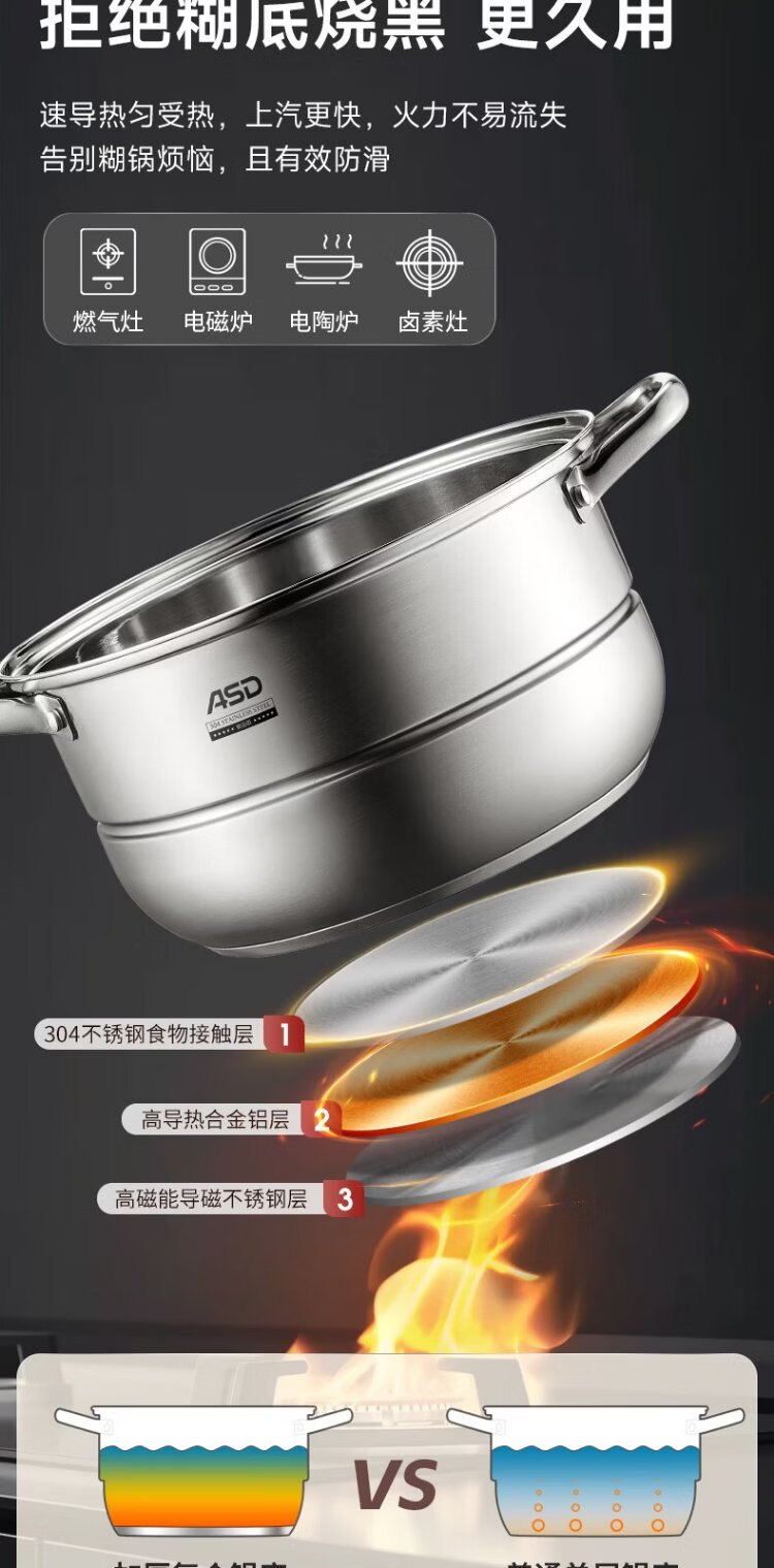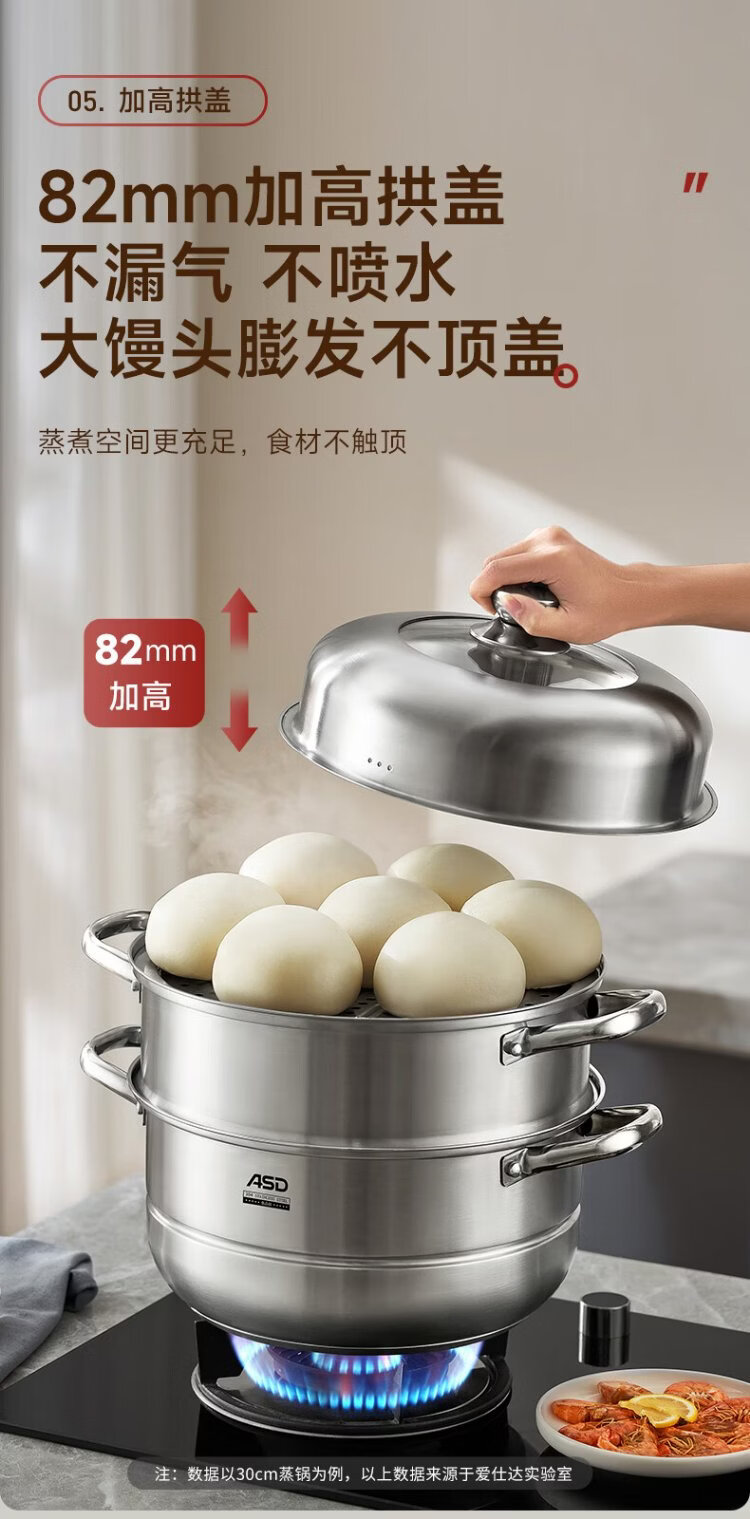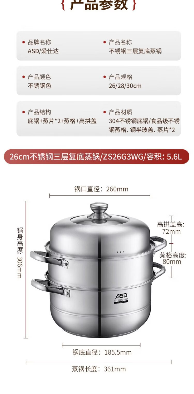 ASD steamer 304 stainless steel three-layer household steaming and stew pot large capacity 30CM double-layer steamer gas universal G3