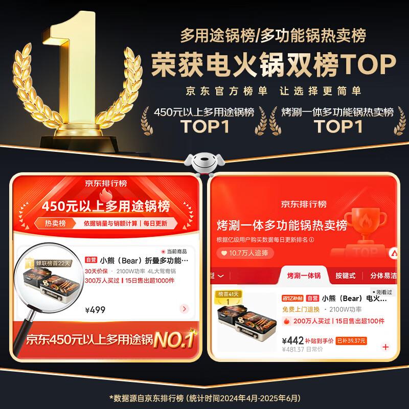 Bear (Bear) electric hot pot electric cooking pot hot pot special pot Yuanyang pot multi-functional folding grilled shabu-in-one grilled fish pot household 5-8 people barbecue pot E22W1 stacking pot 1.0