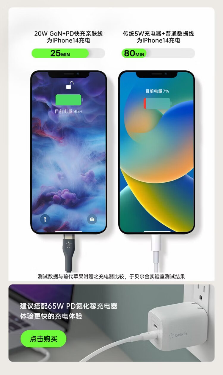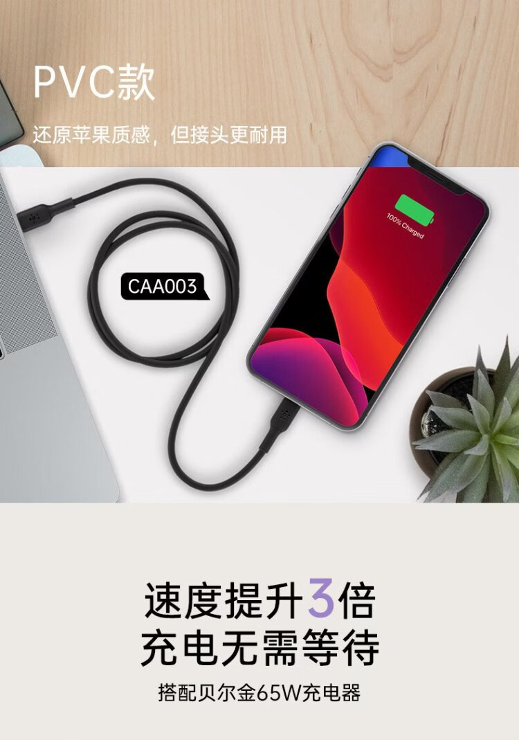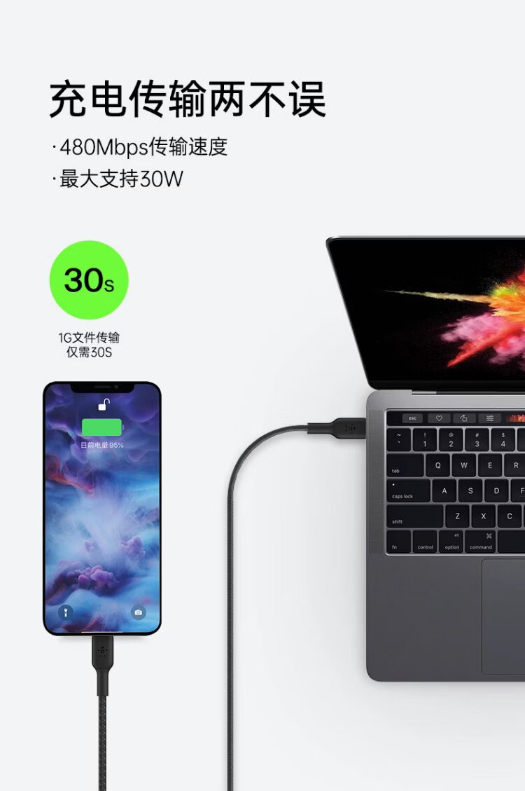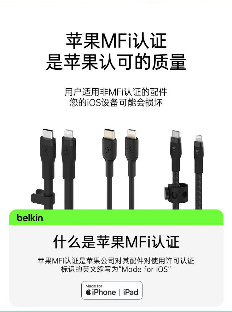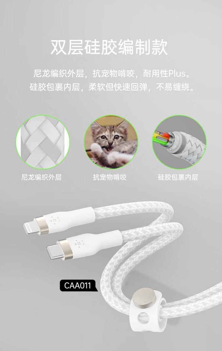 Belkin (BELKIN) Apple data cable PD fast charging Type-C to Lightning charging cable MFi certified iPhone mobile phone charging cable 1 meter white braid CAA004