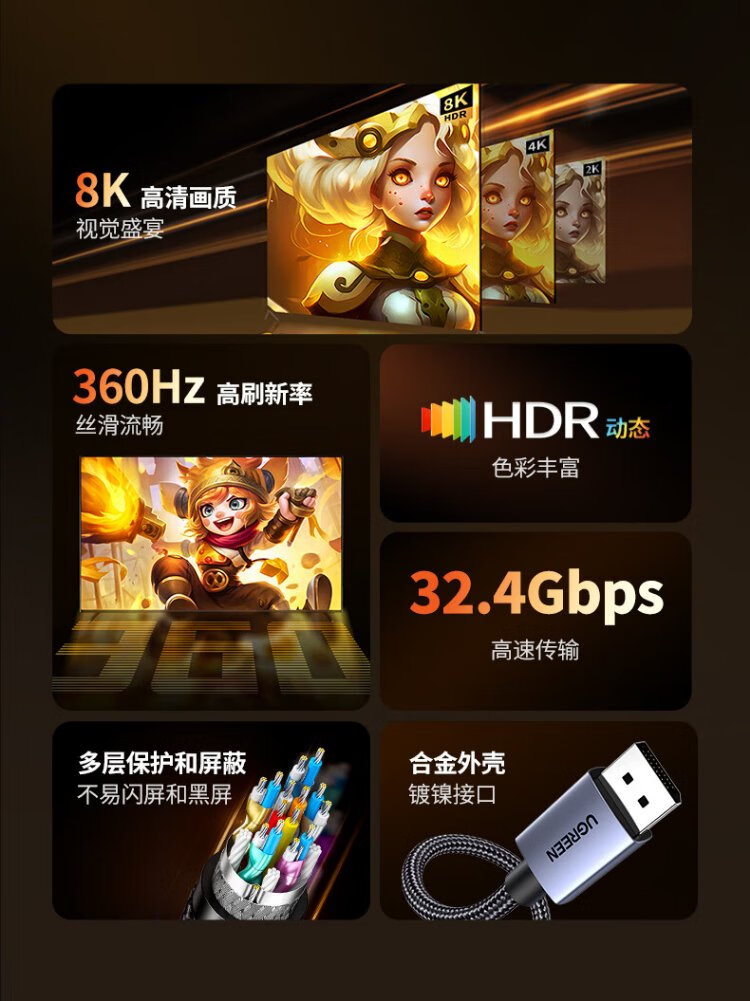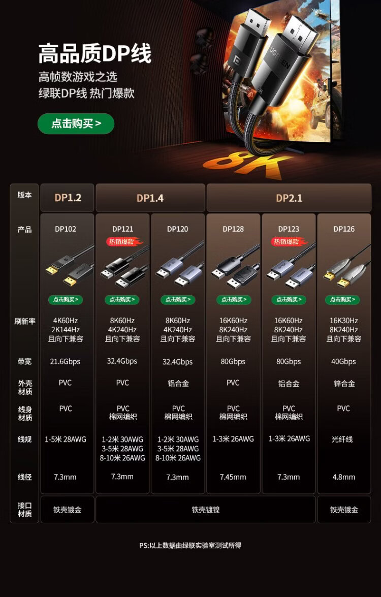 Greenlink DP cable version 1.4 8K HD 4K/2K240Hz DisplayPort suitable for computer graphics card to monitor e-sports video cable 2 meters compatible with DP1.2 25905