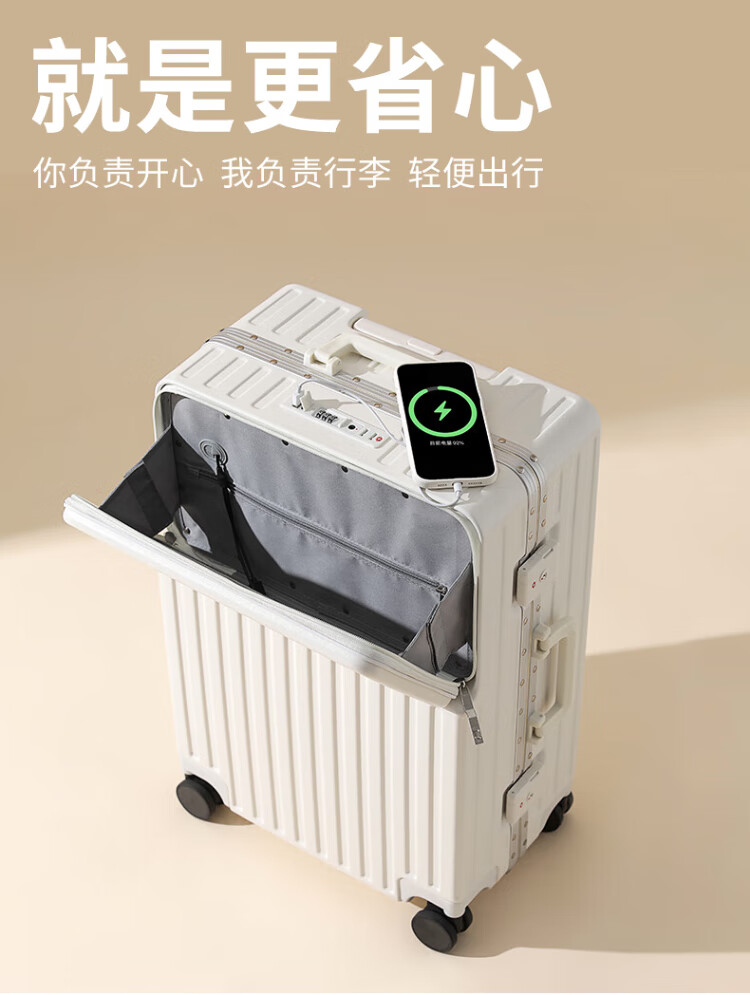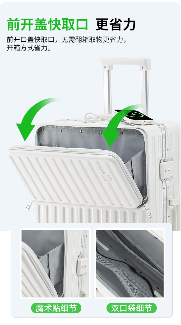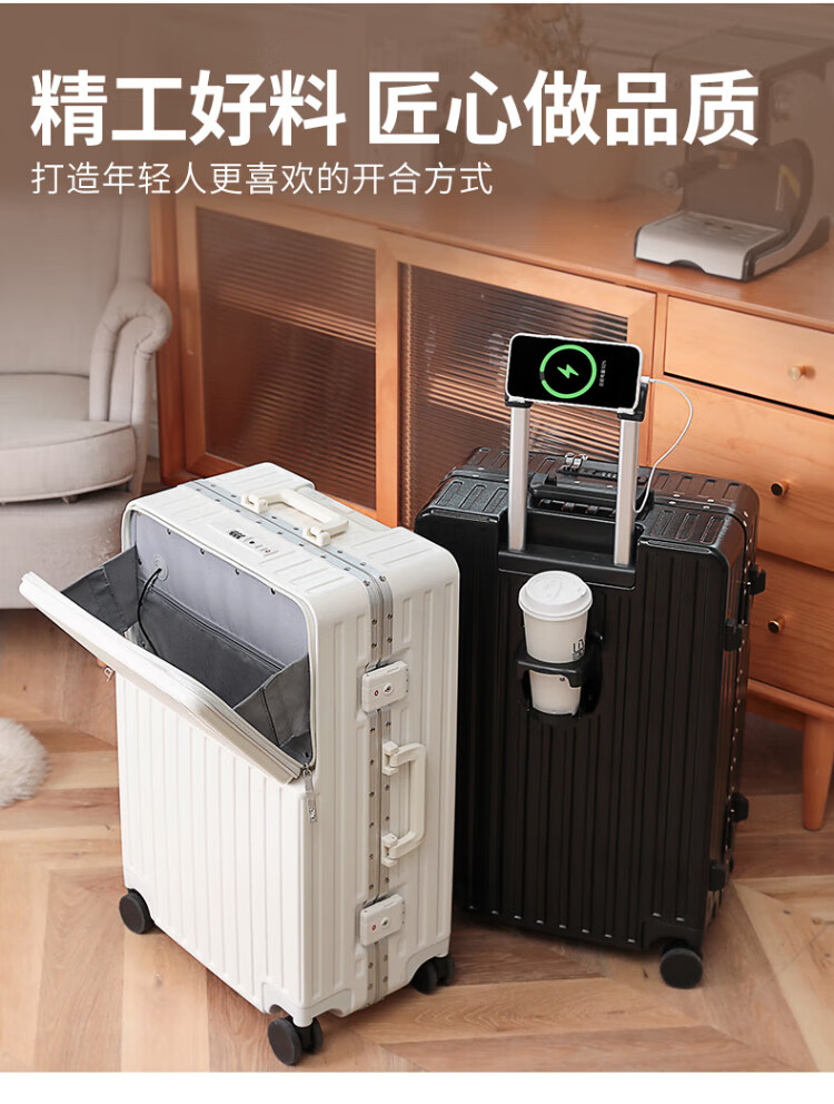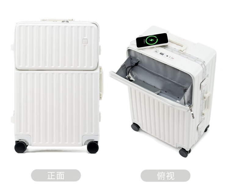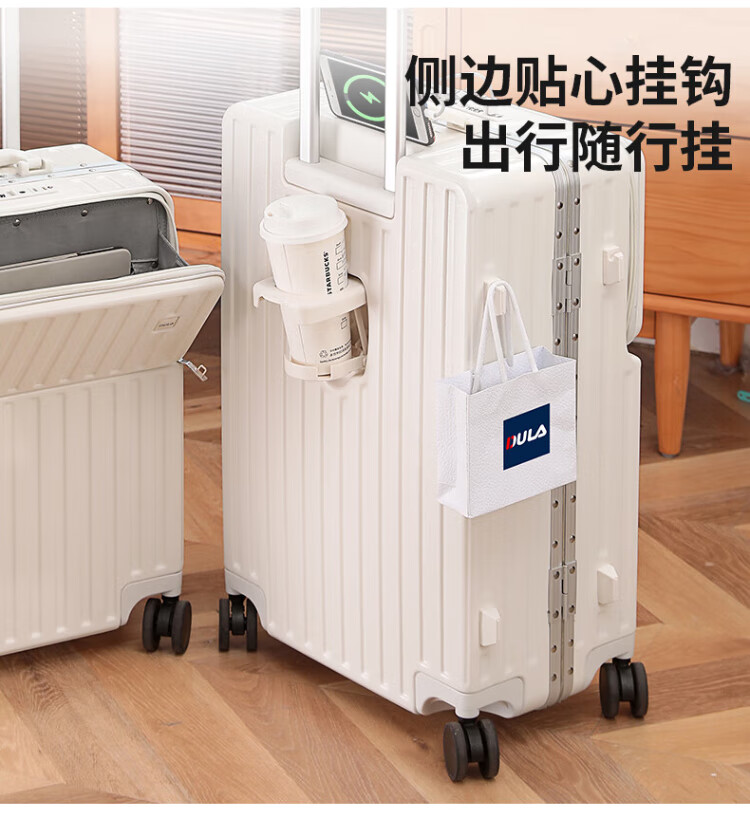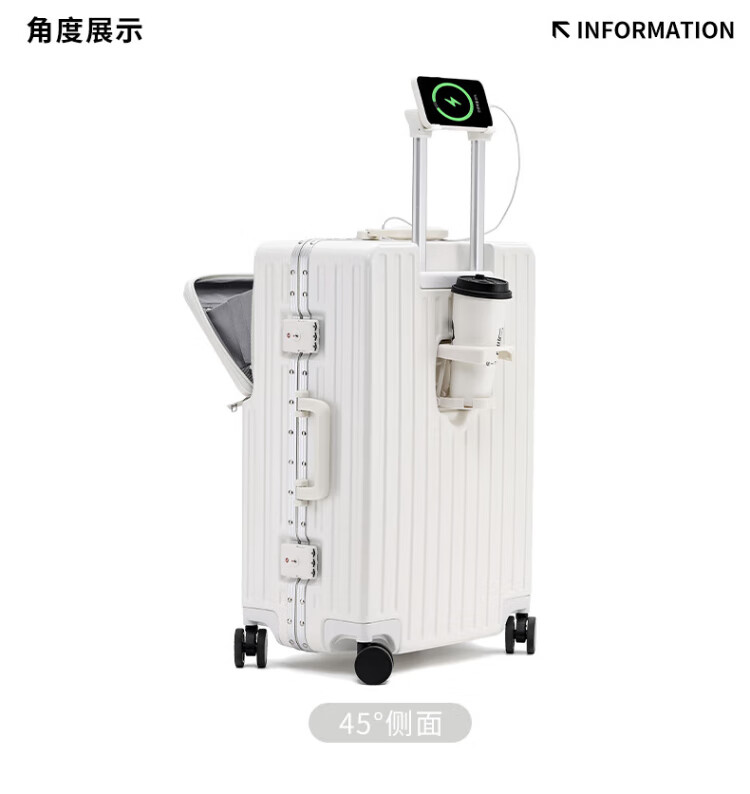 DULA aluminum frame front opening cup holder suitcase trolley case USB charging suitcase password box Haoyue White 24 inches