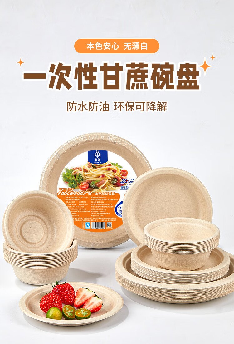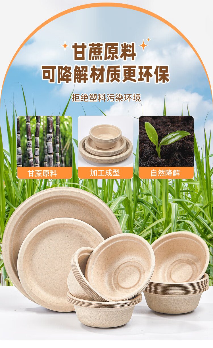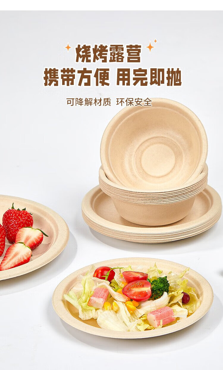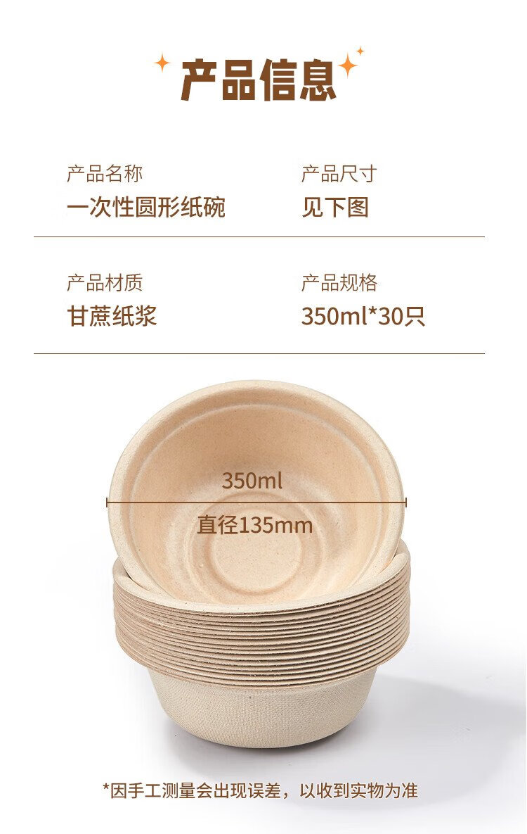 SHUANG YU sugarcane pulp paper plate paper bowl disposable tableware waterproof and oil-proof natural color degradable round bowl 350ml 30 pieces