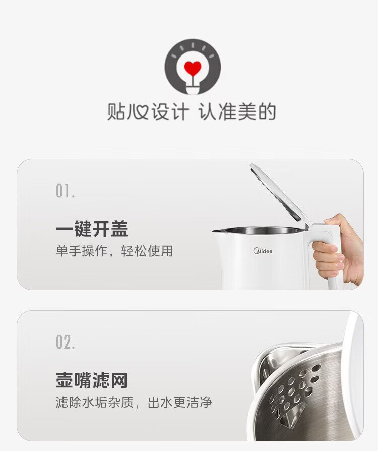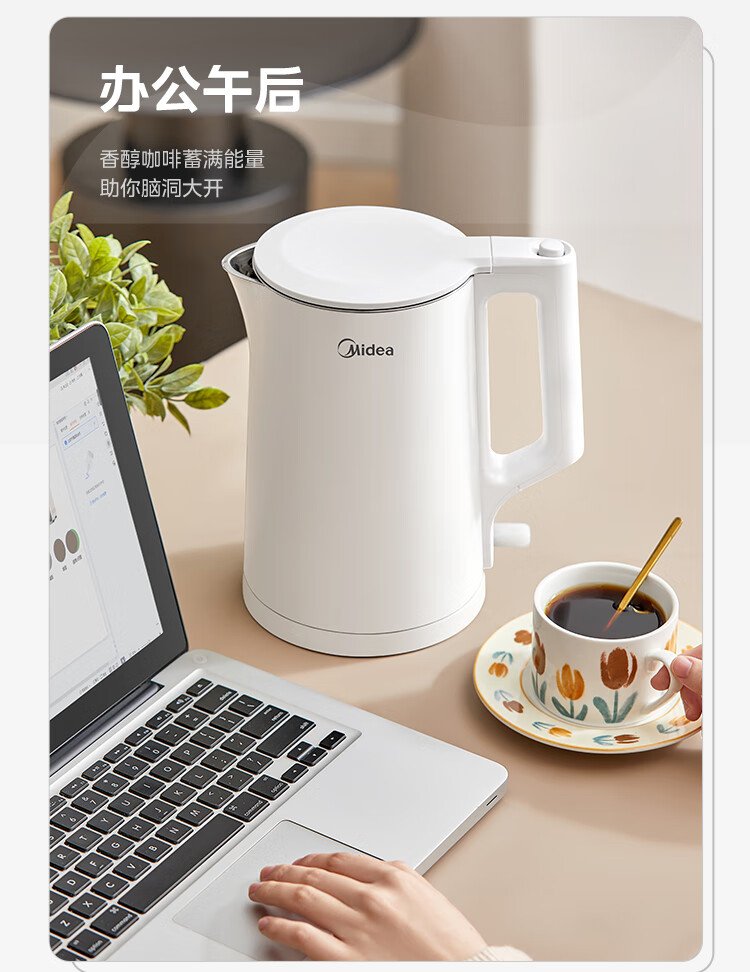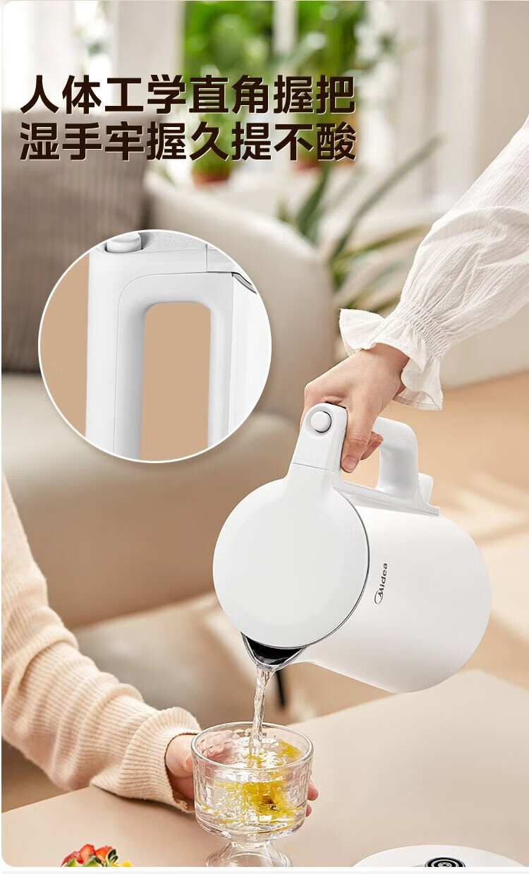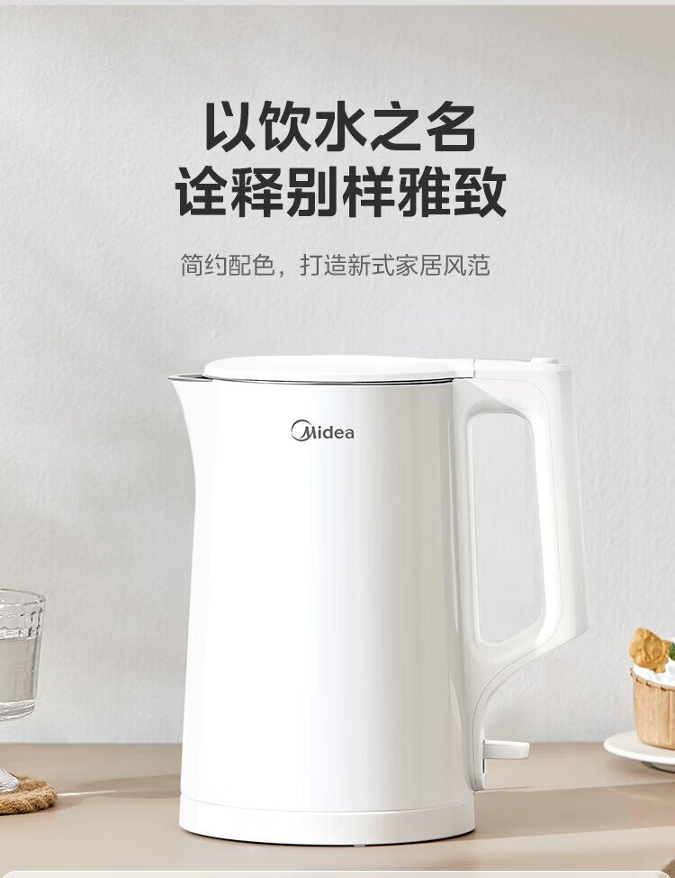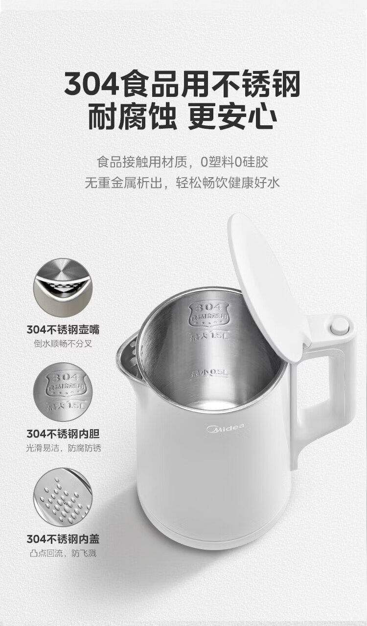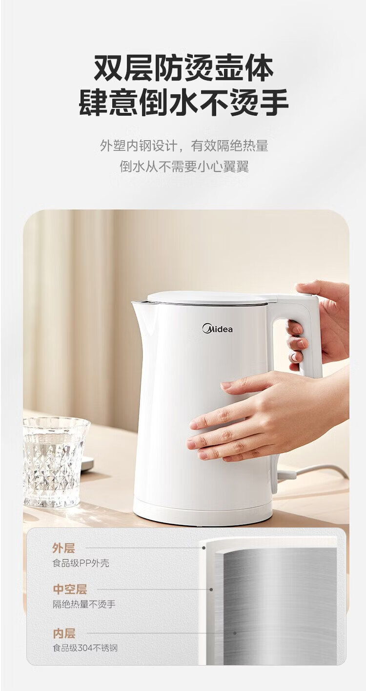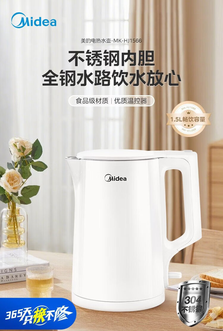Midea electric kettle household kettle small capacity 0 coating food grade 304 stainless steel double layer anti-scald all steel seamless 1.5L capacity 1566