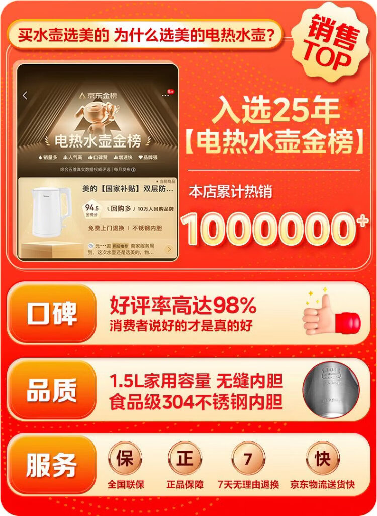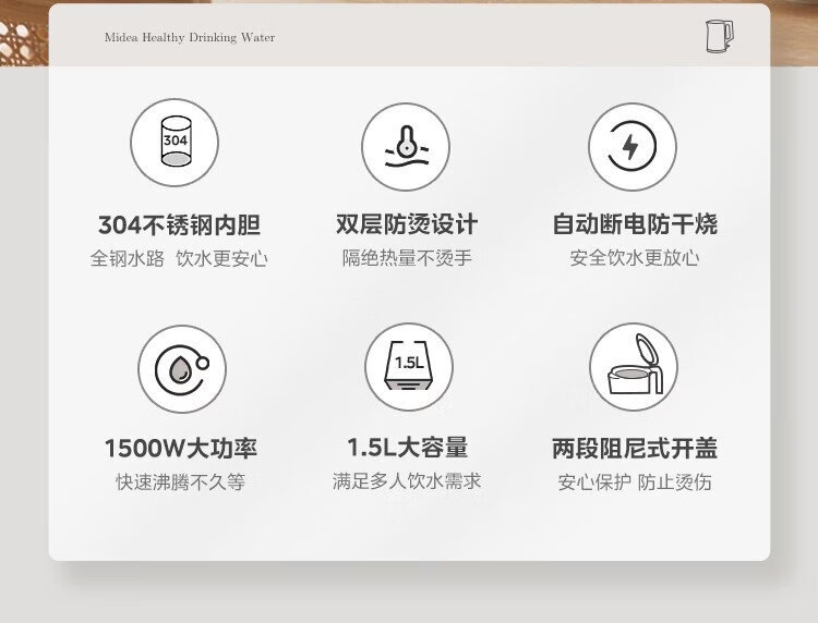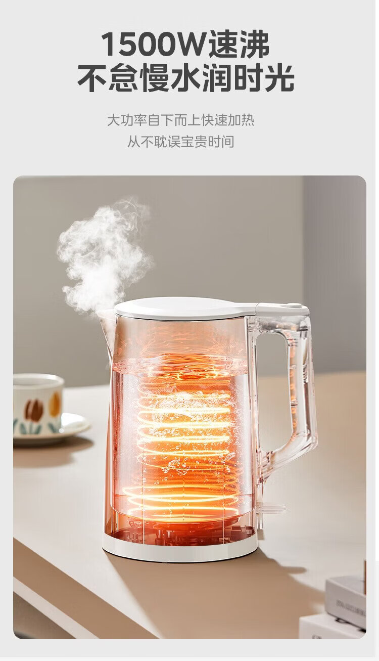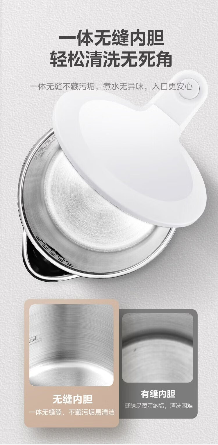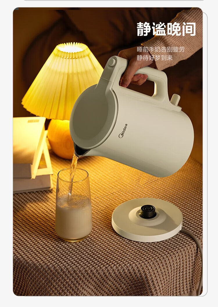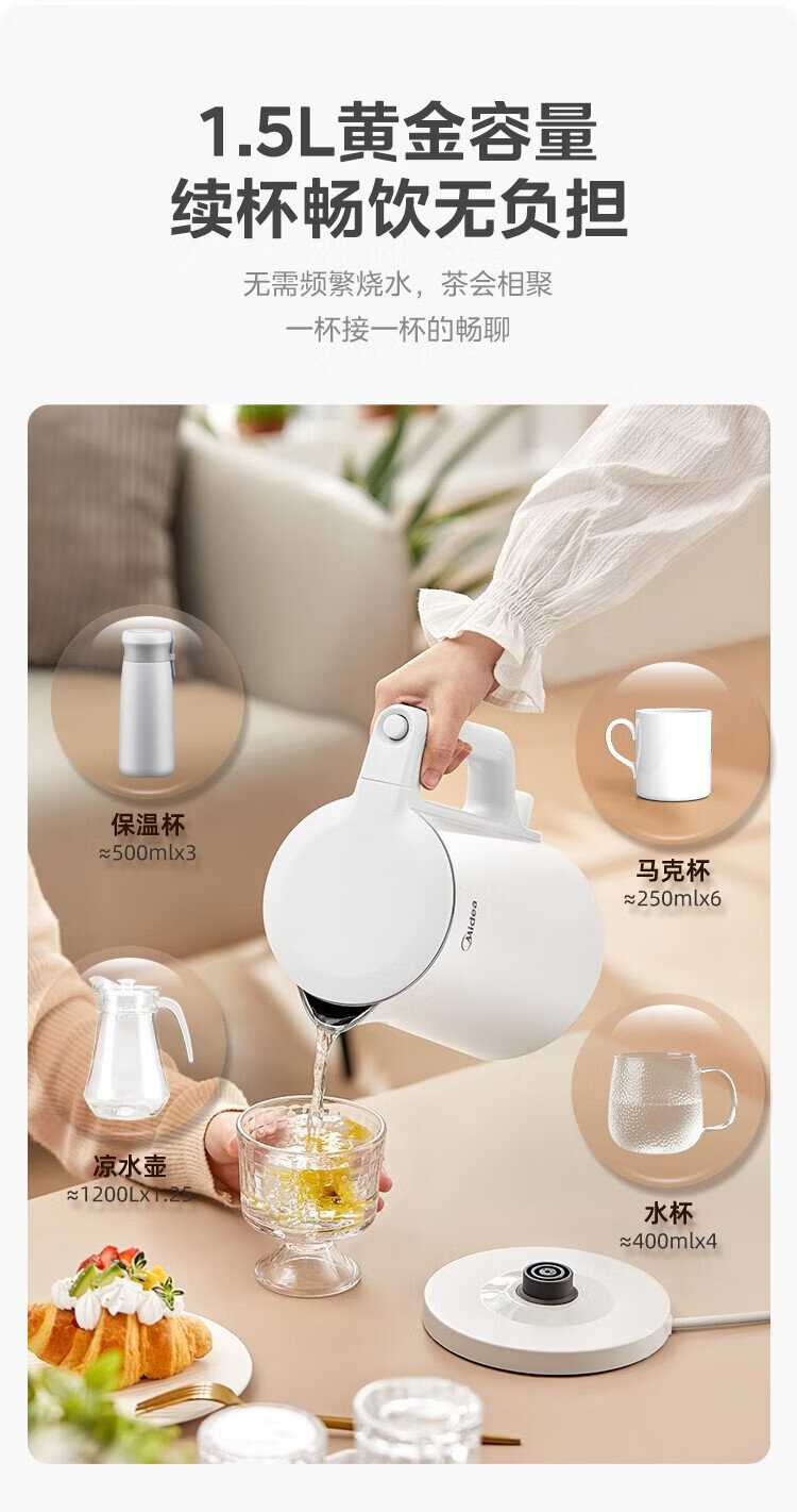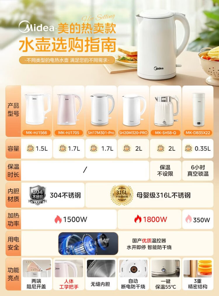Midea electric kettle household kettle small capacity 0 coating food grade 304 stainless steel double layer anti-scald all steel seamless 1.5L capacity 1566
