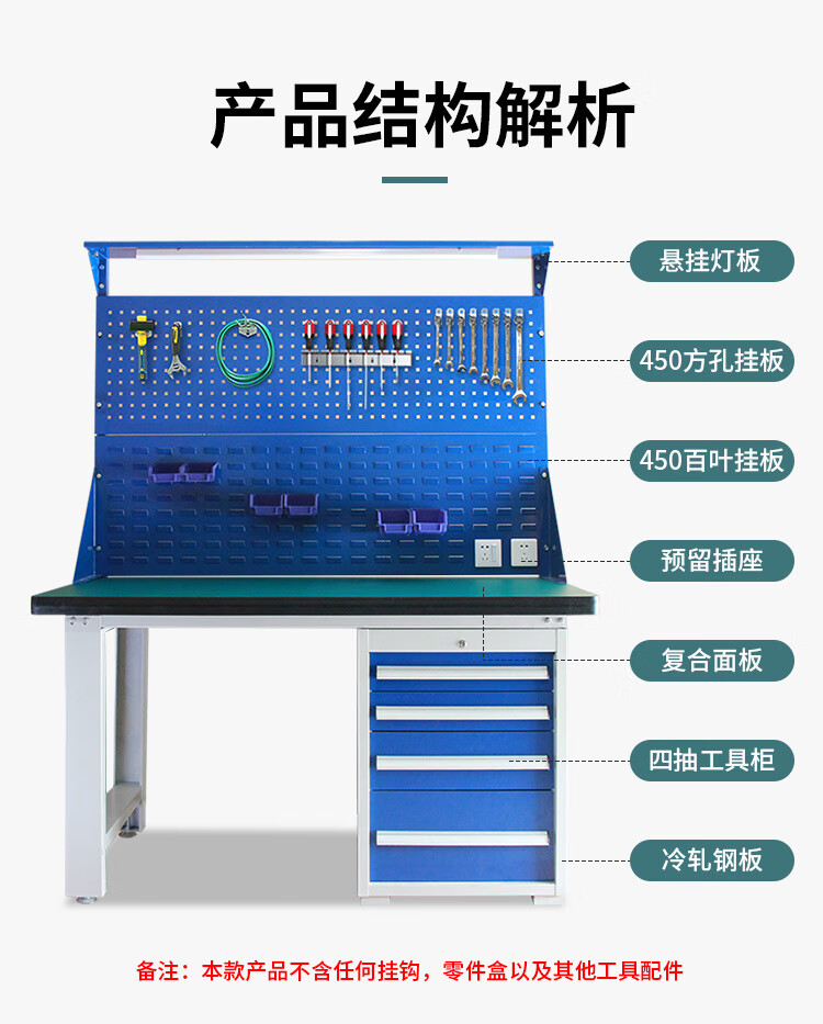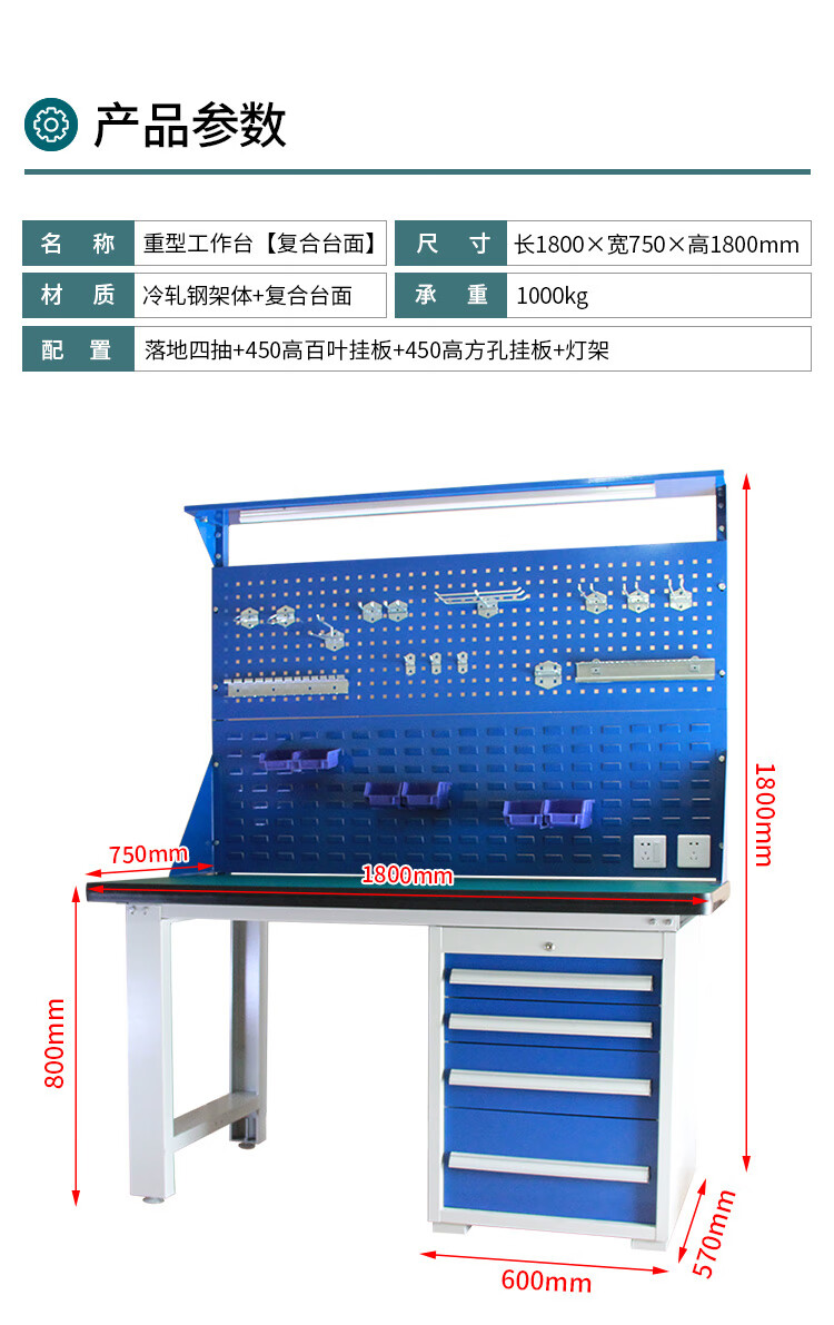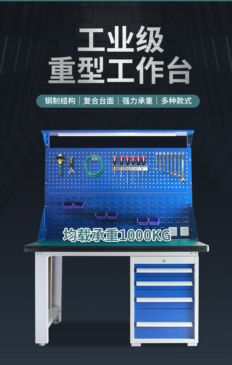 Huizhen heavy-duty workbench workshop fitter bench assembly maintenance table operating table 1.8 meters long side four drawers double hanging plate HV723 can be customized
