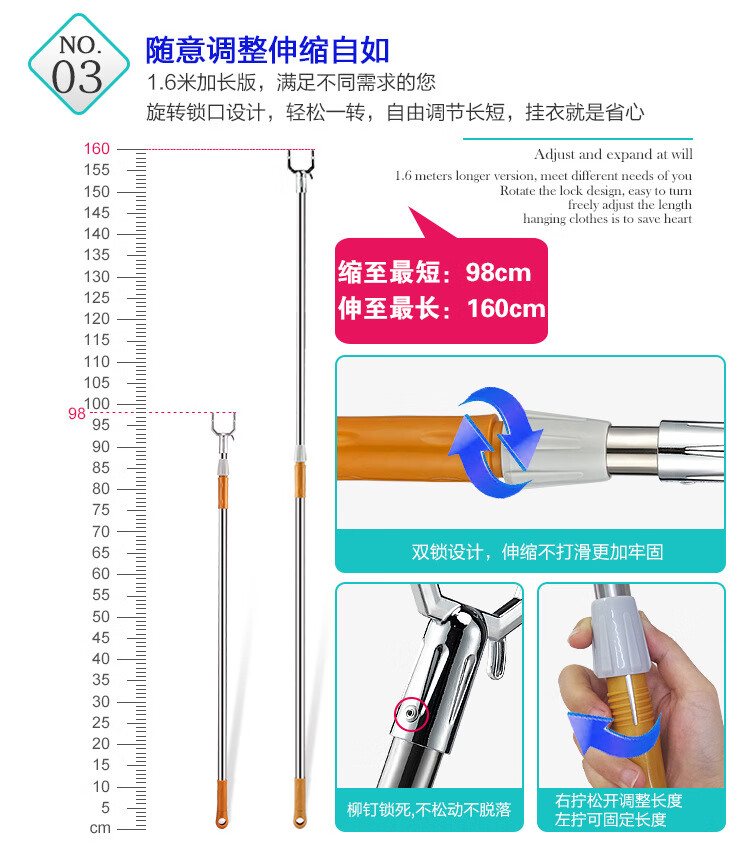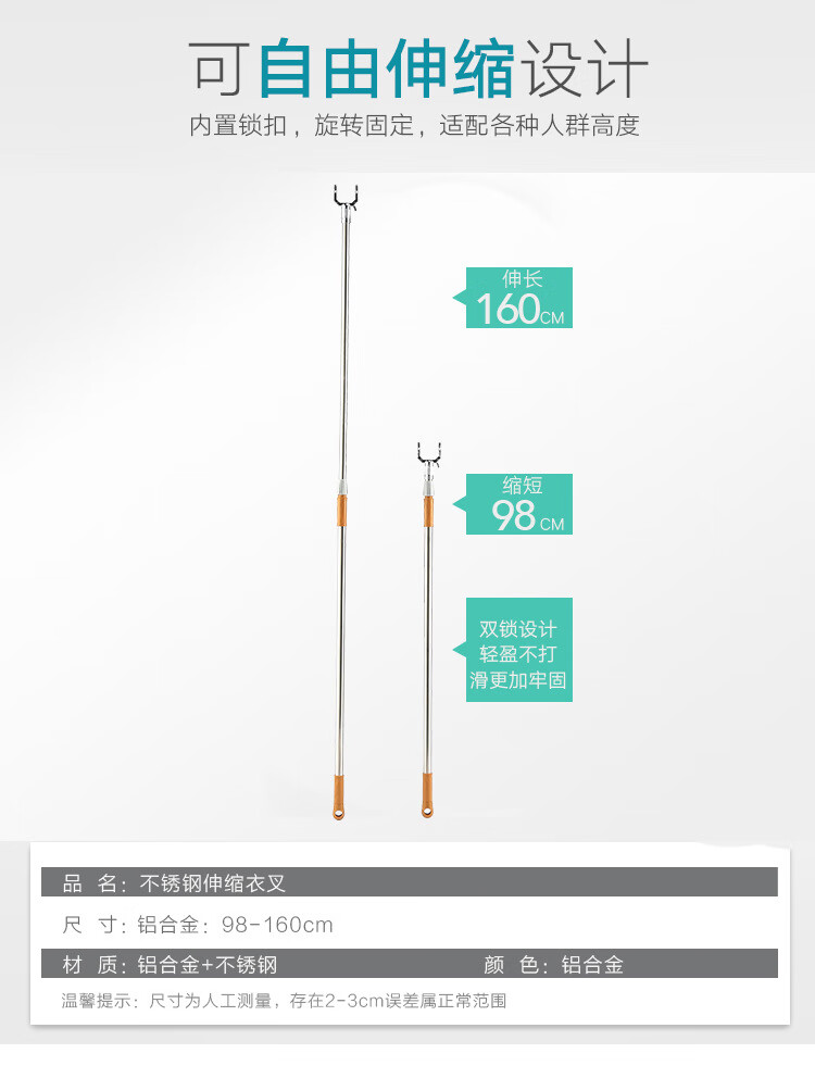 Jinguluo Retractable Clothes Fork 1.6m Alloy Clothes Fork Clothes Rod Aluminum Alloy Extended Telescopic Clothes Drying Fork KBT-38