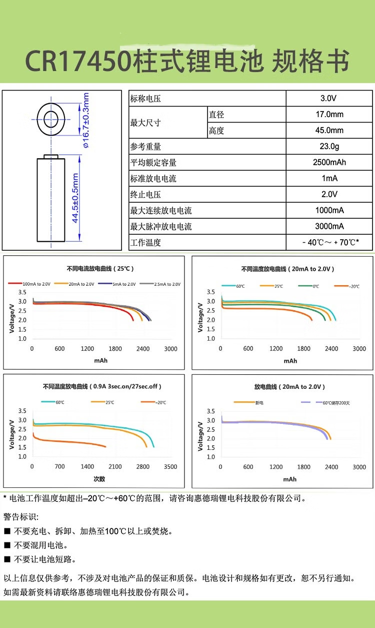 Ouhuayuan CR17450 smart instrument indicator light 3.0V compass direction instrument safety device smoke detector battery flat head