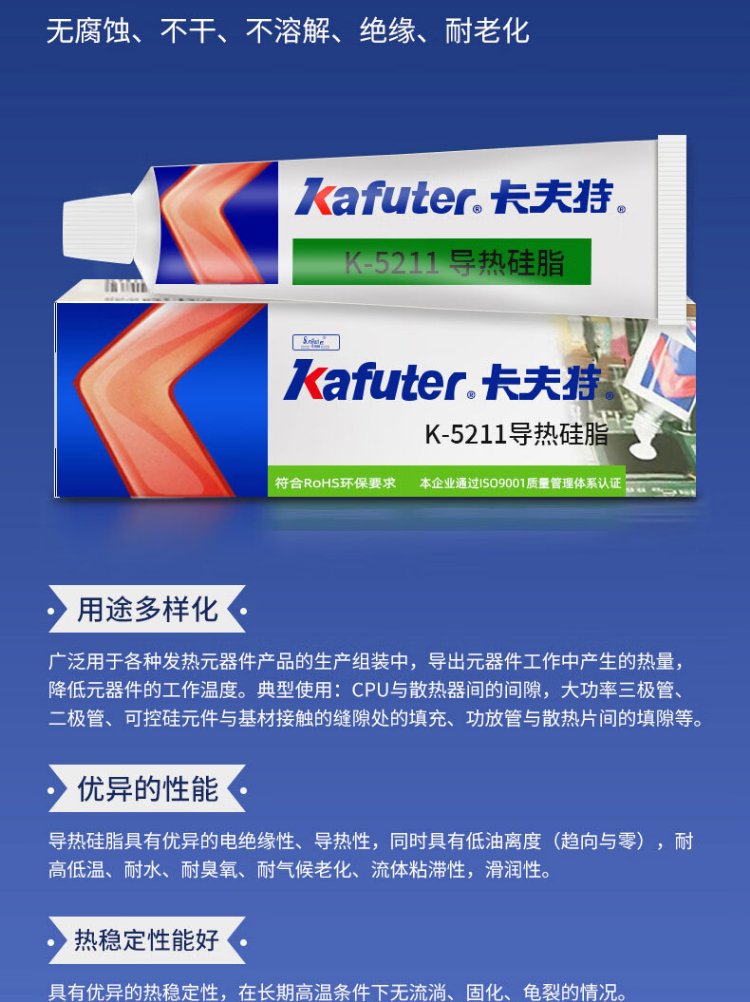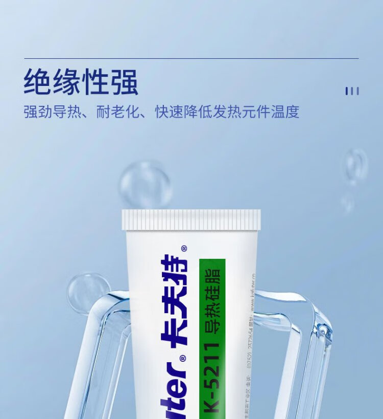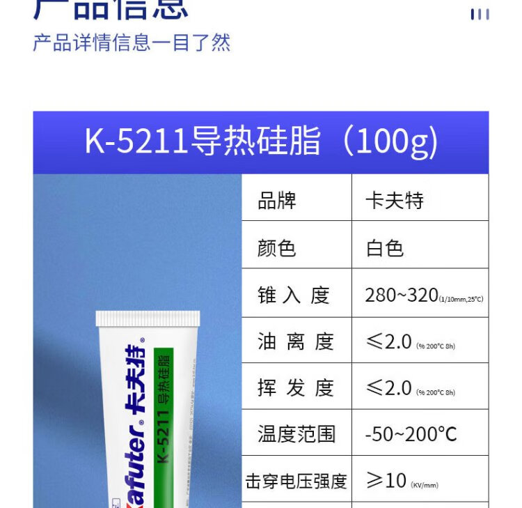 Kafter thermal conductive silicone grease K-5211 for electronic components, electrical appliances, furnaces and mobile phones, non-curing, high temperature resistant, insulating and waterproof, thermal conductivity 1.2, white, 100g