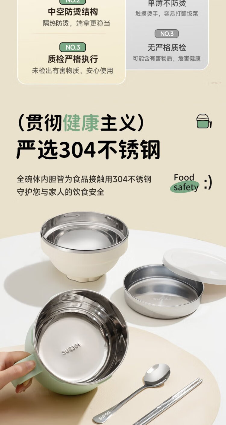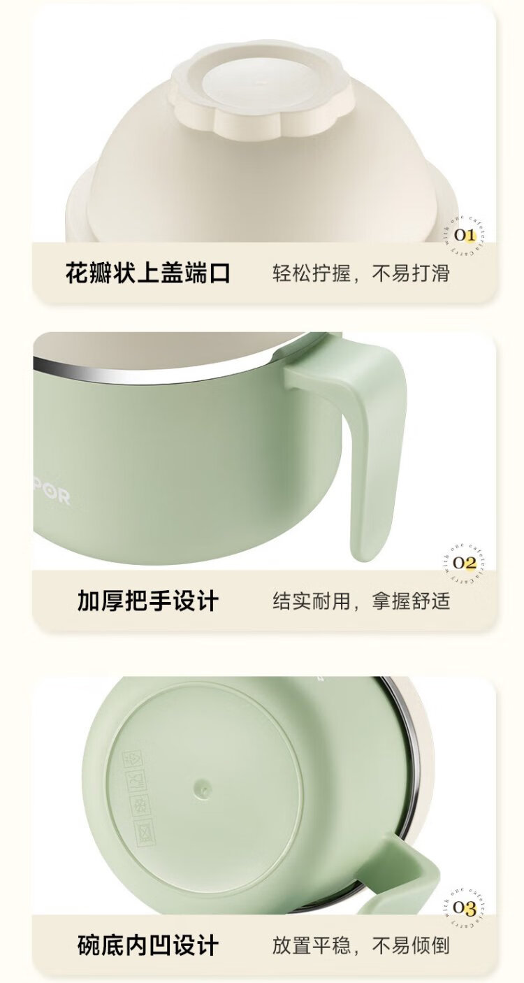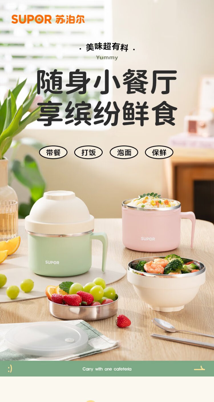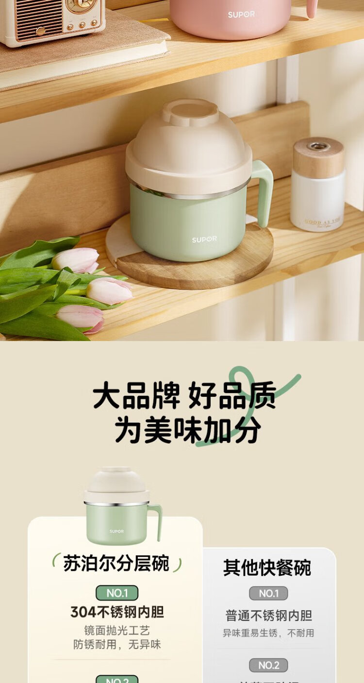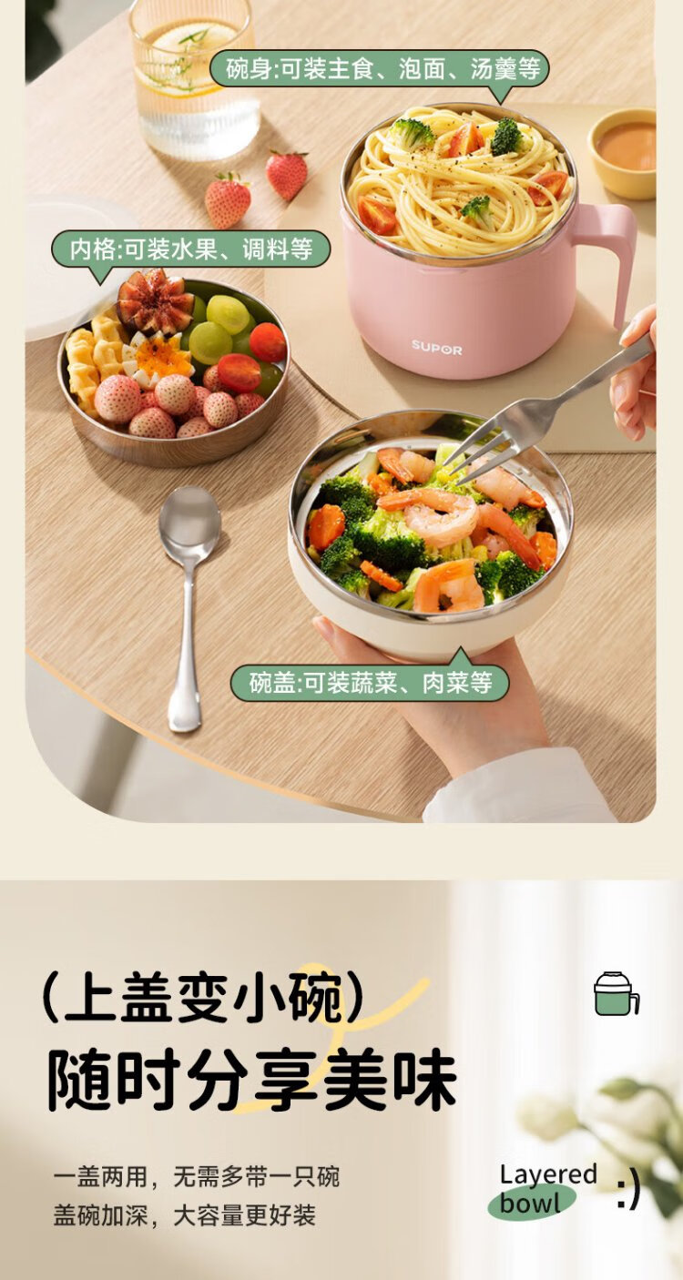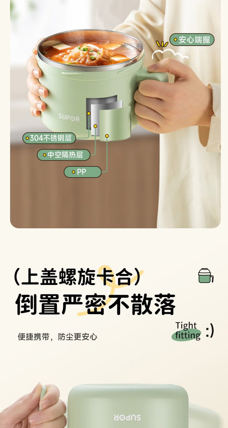Supor student insulated lunch box children's 304 stainless steel instant noodle bowl with lid men's and women's canteen fast food cup