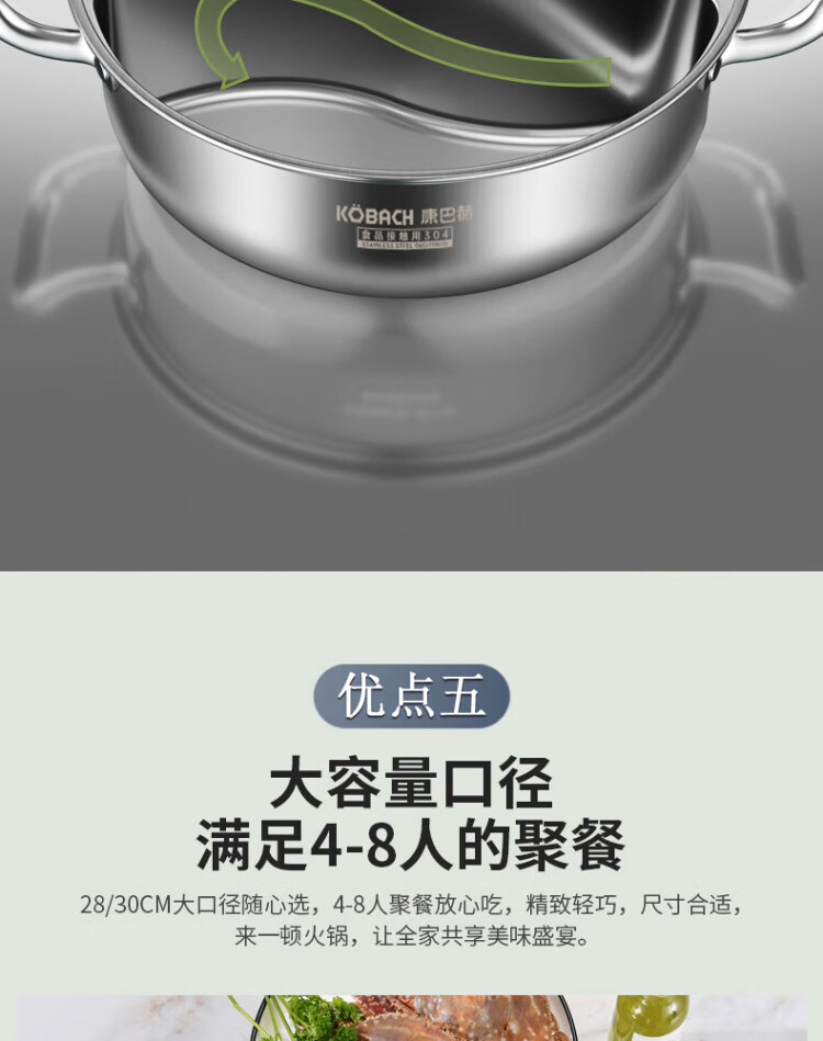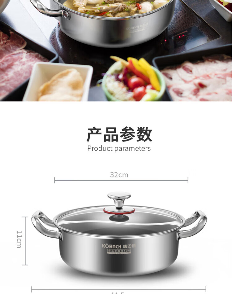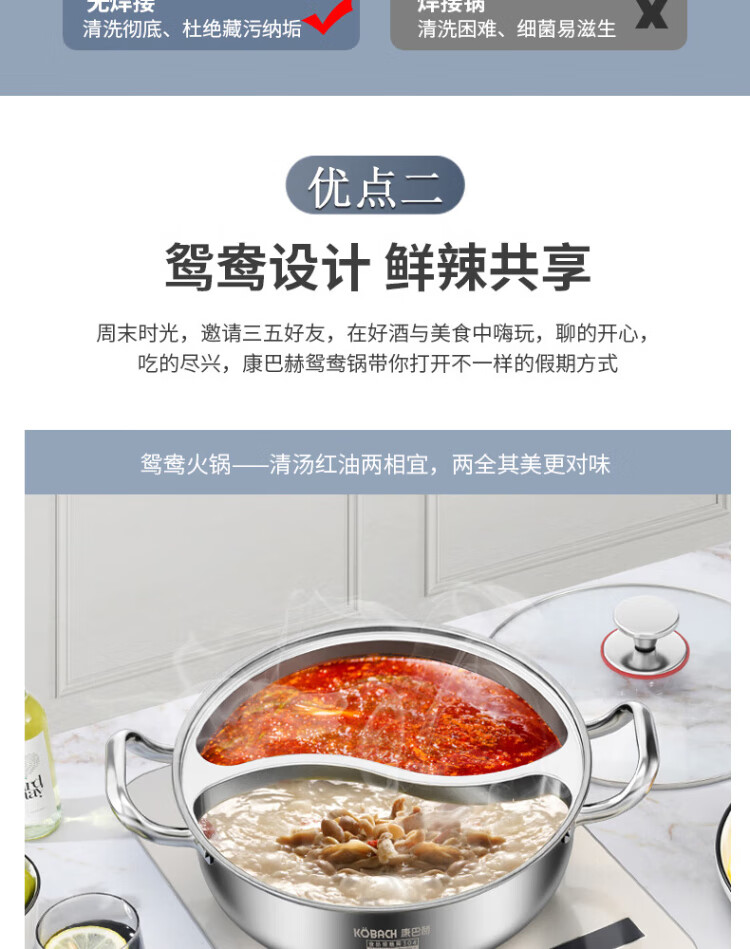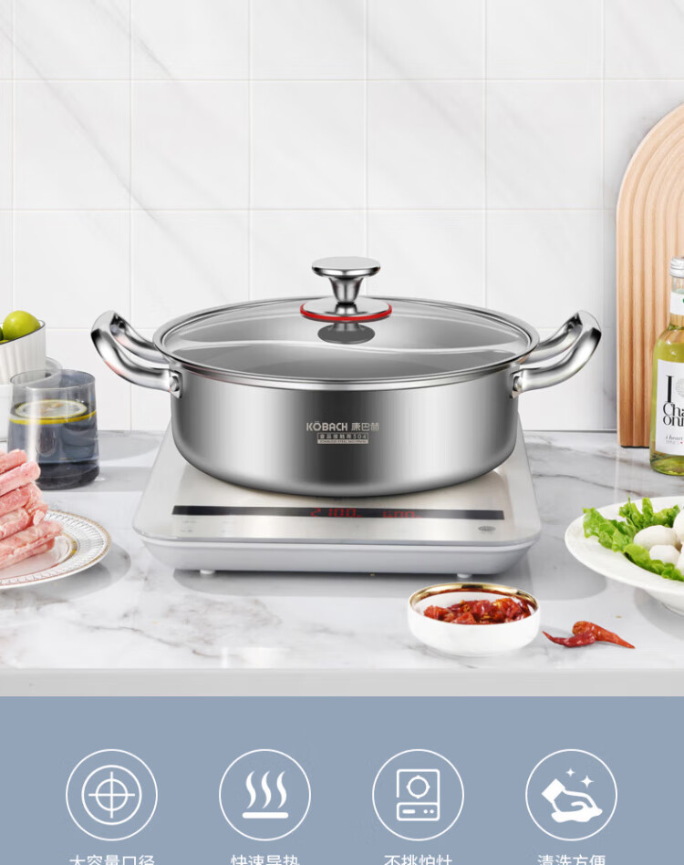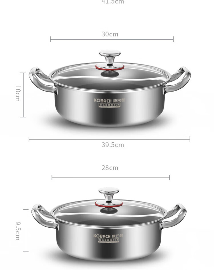 Kobach (KOBACH) 304 stainless steel hot pot, mandarin duck pot, dual-purpose pot, thickened multi-bottom hot pot pot, multi-functional soup pot, shabu-shabu pot