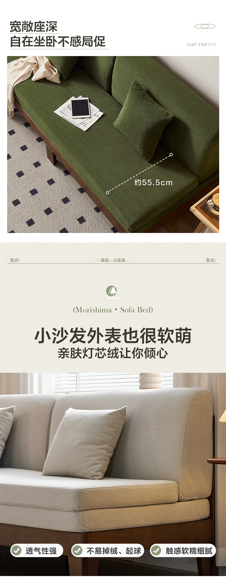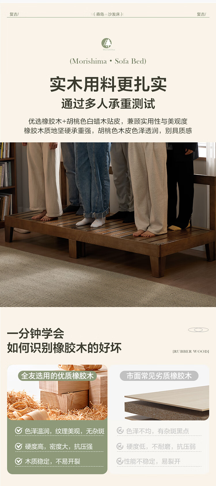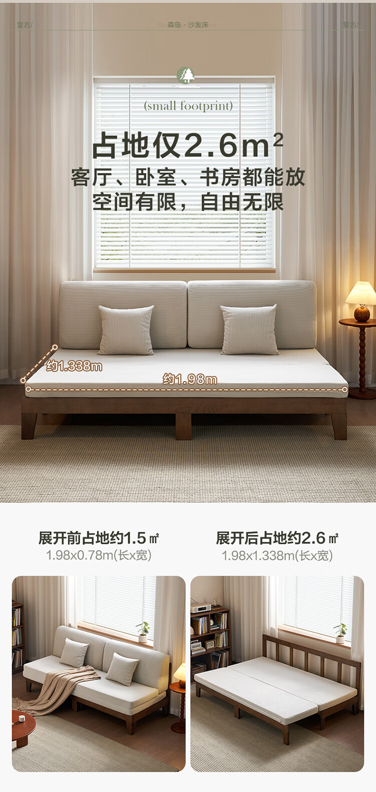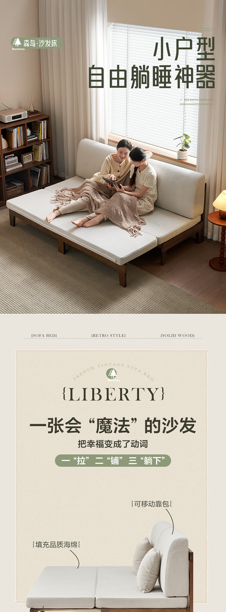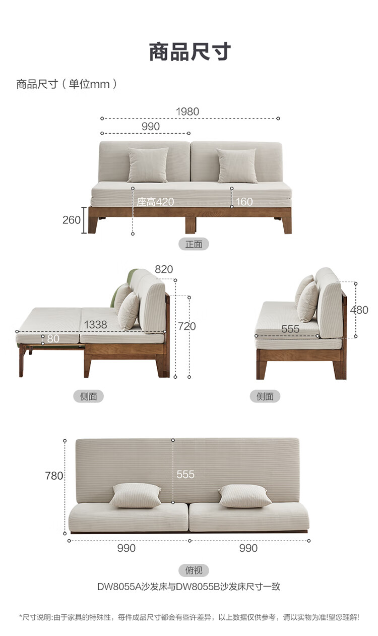 Quanyou Home Cream Style Solid Wood Frame Double Sofa Small Apartment Bedroom Living Room Two-in-One Folding Sofa Bed