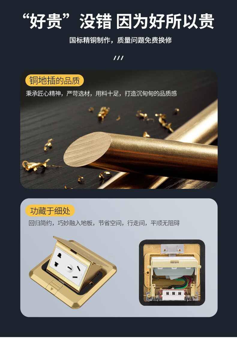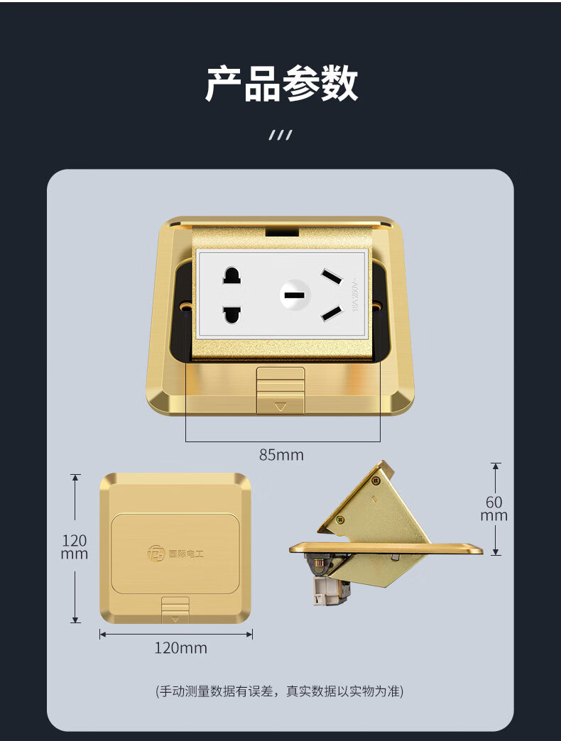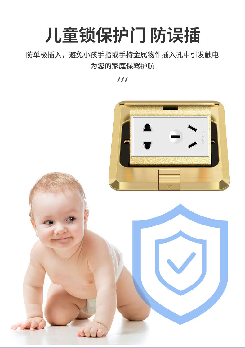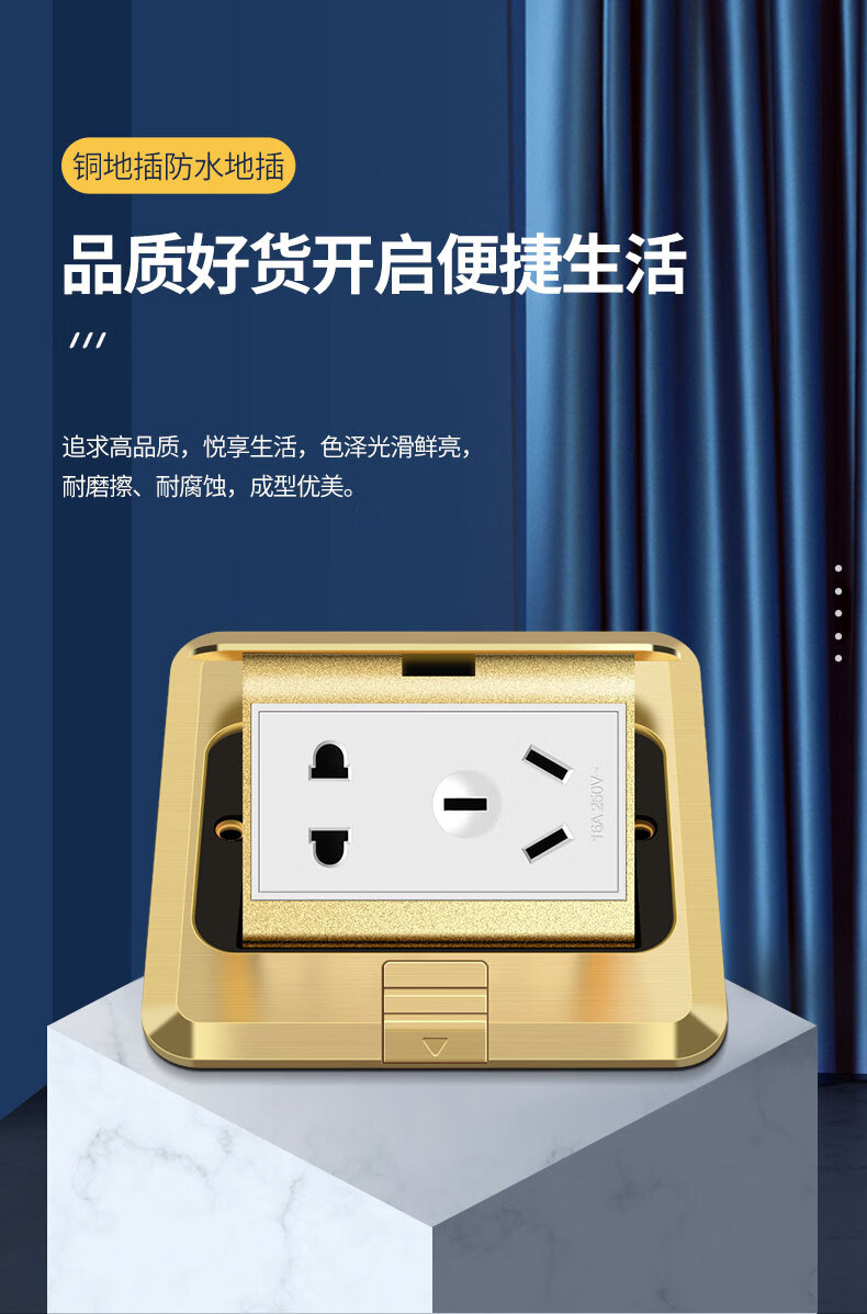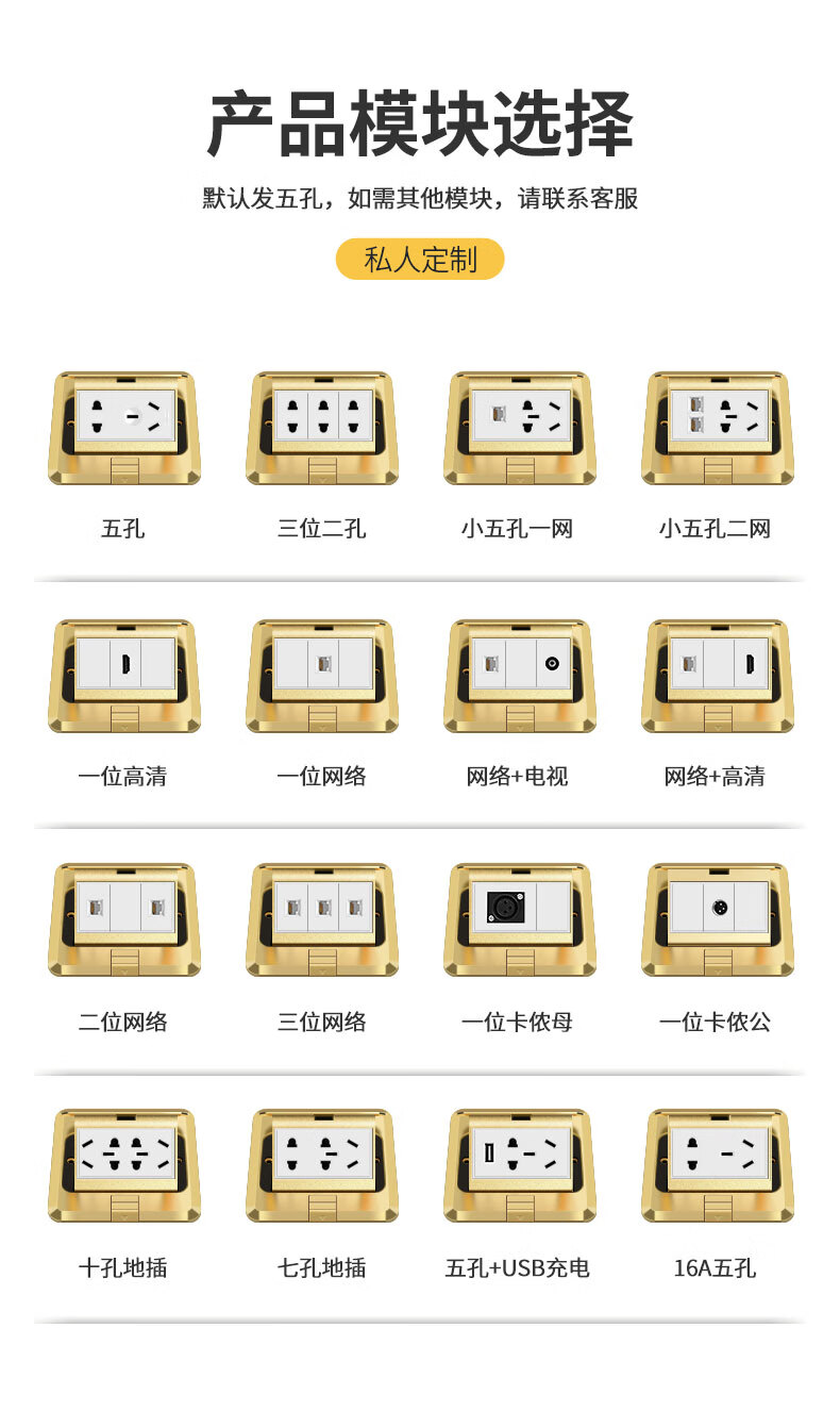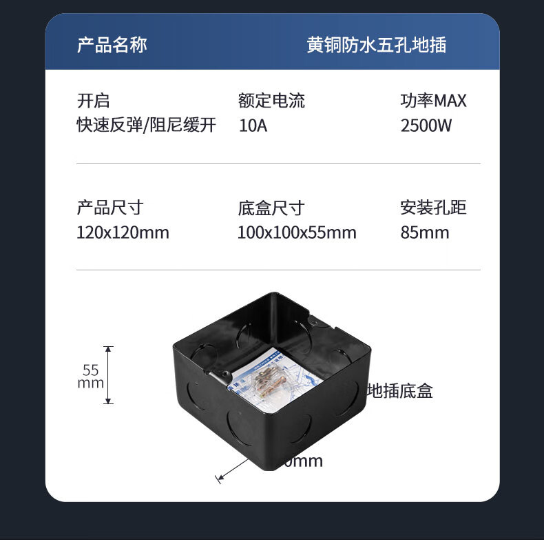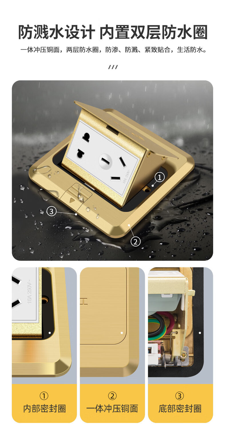 International electrical site socket copper ground plug anti-splash water damping slow pop-up ultra-thin ground socket strong and weak current combination copper ground plug-five holes (10A)