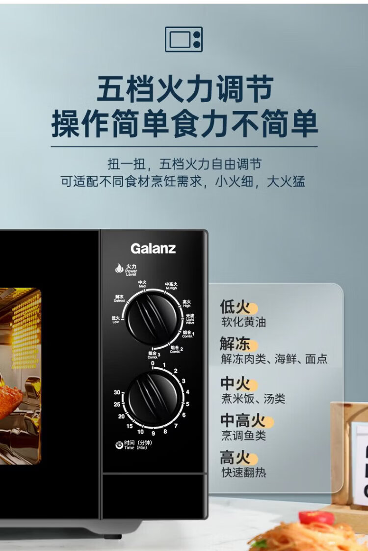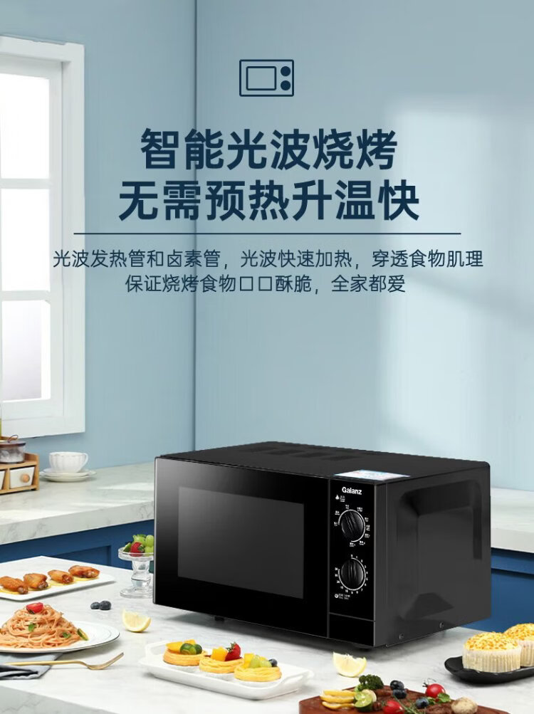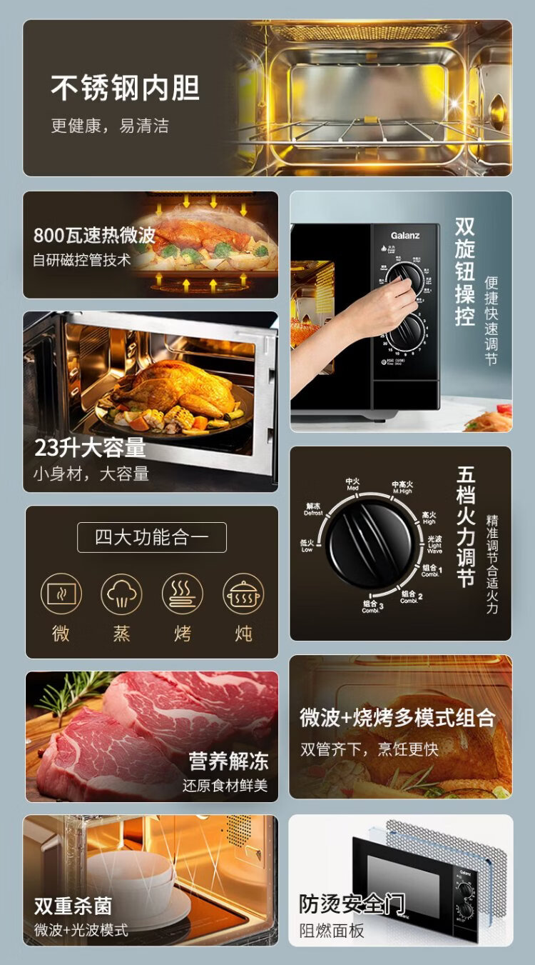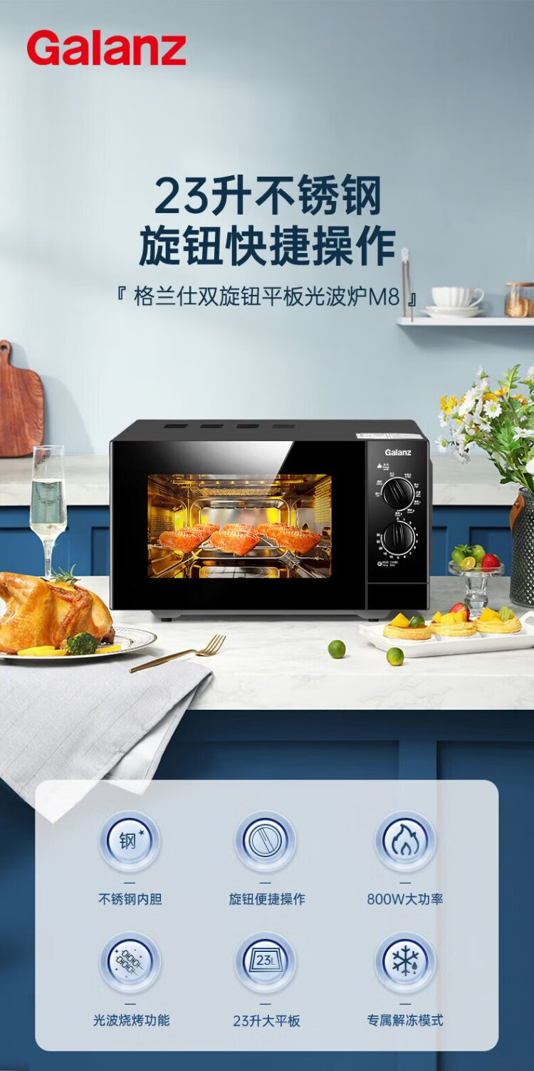 Galanz microwave oven all-in-one machine flat stainless steel liner 23 liters large capacity household light wave oven mechanical knob easy to operate G80F23SP-M8 (S0)