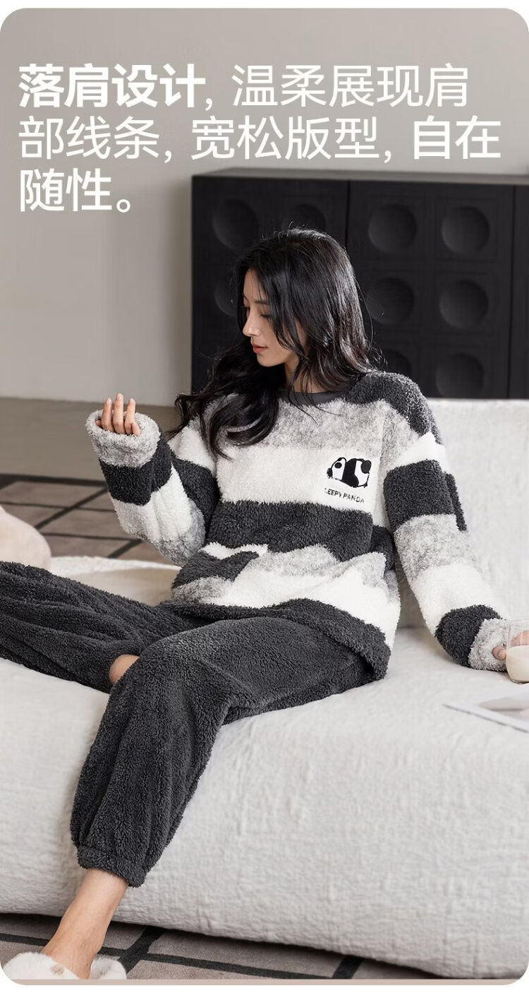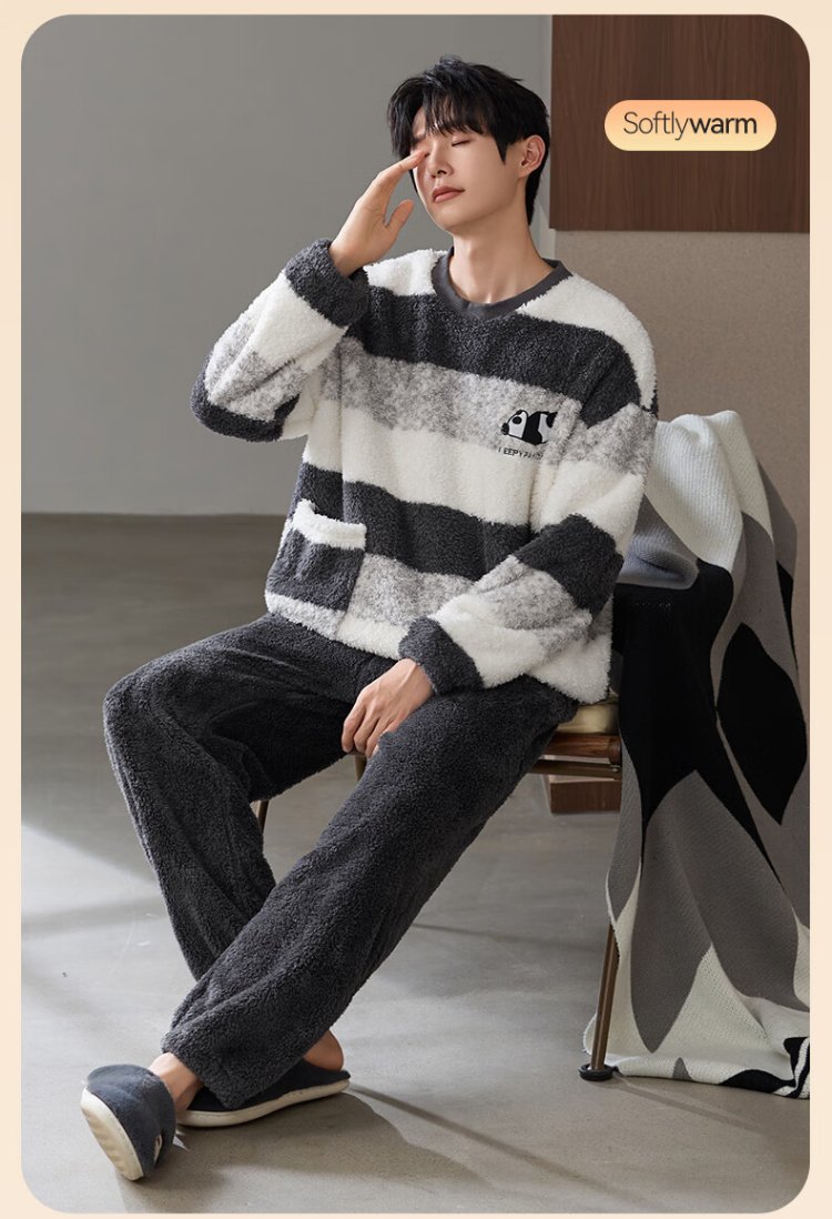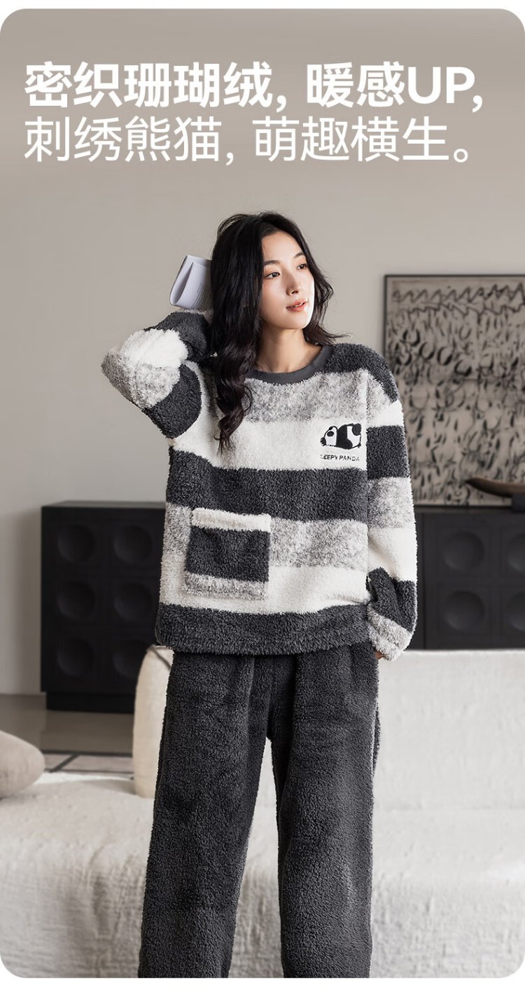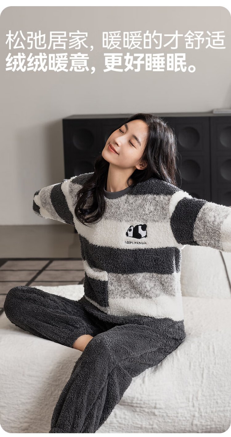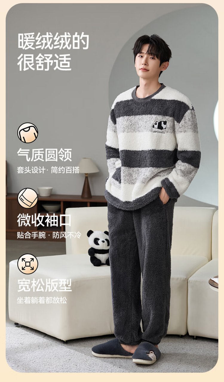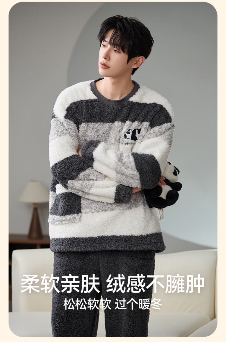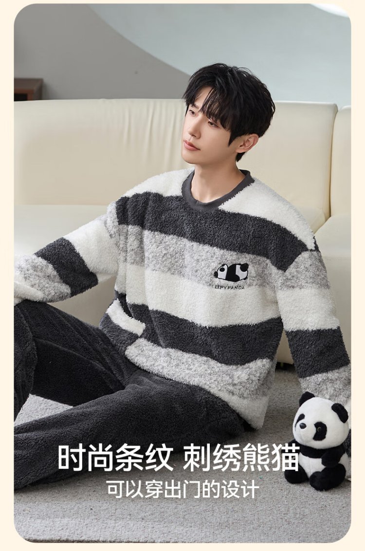 Catman Striped Coral Velvet Couple Pajamas Men's Autumn and Winter Panda Velvet Thickened Men's Warm Home Clothing Literary Style
