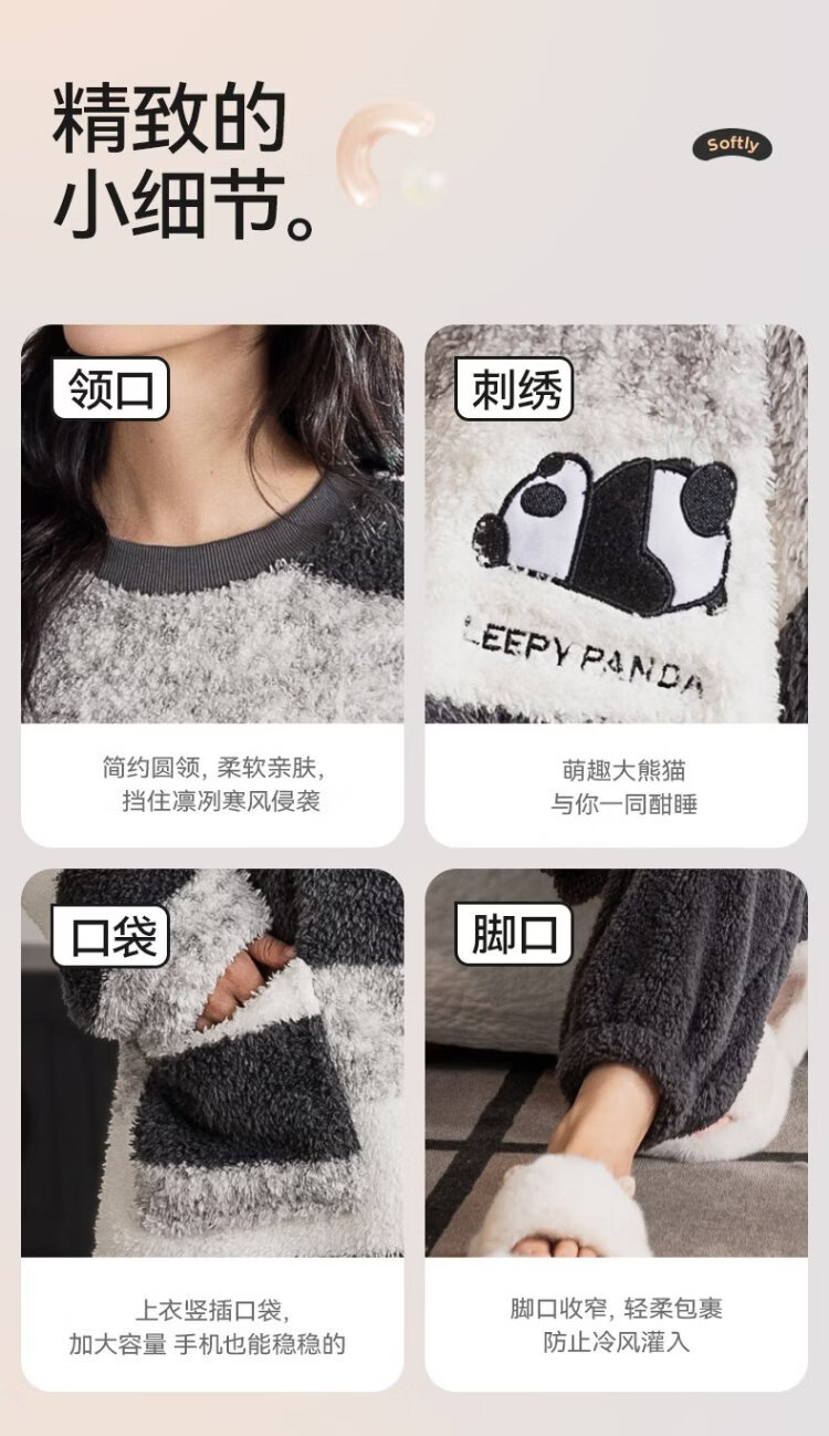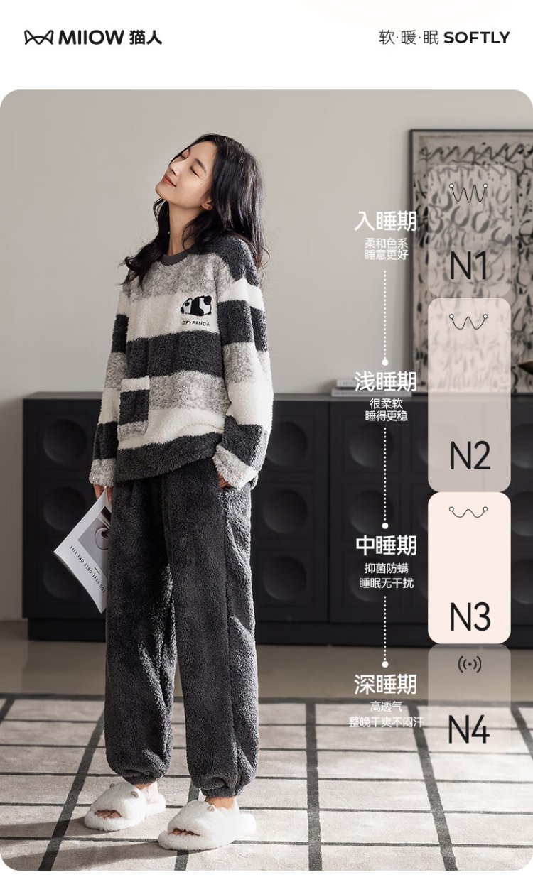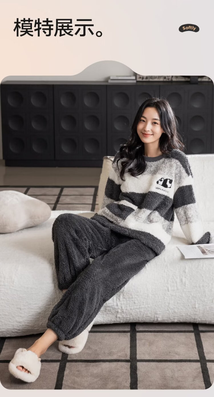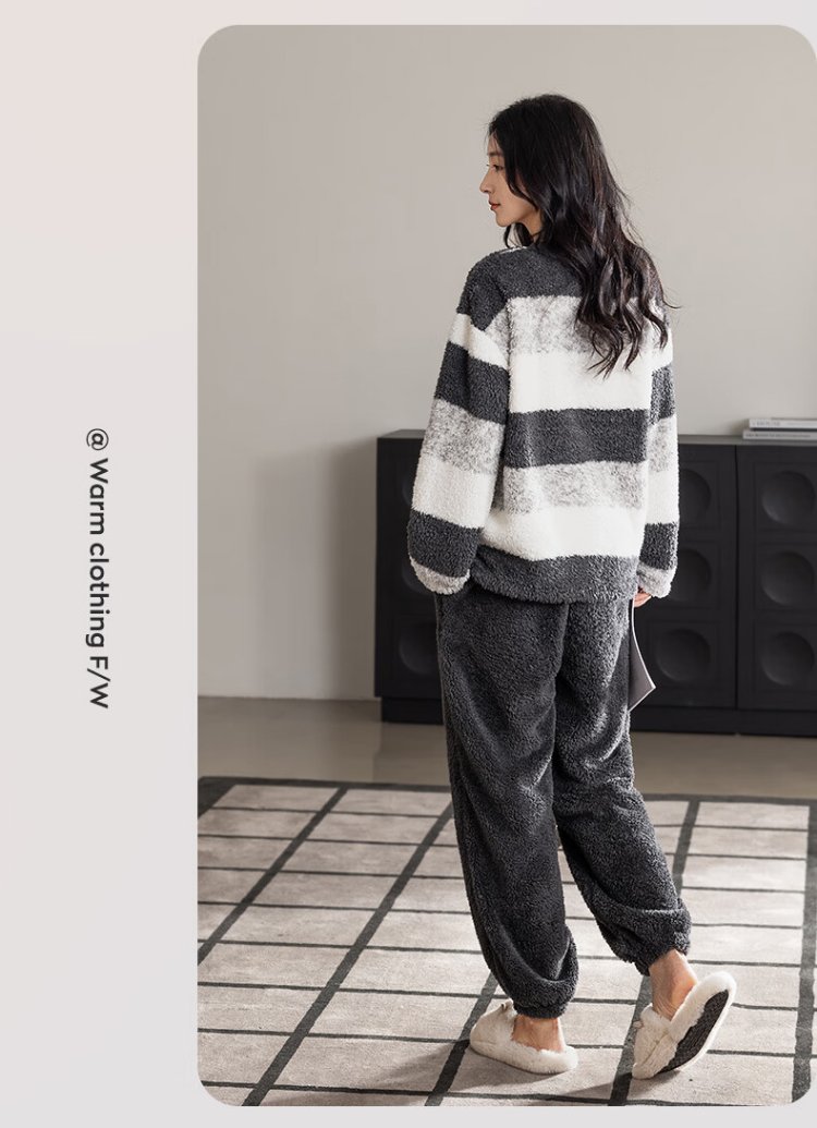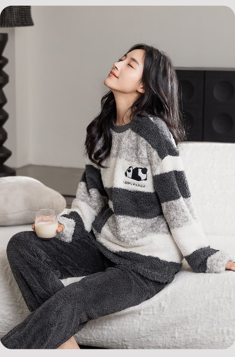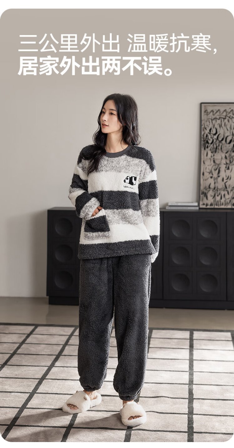 Catman Striped Coral Velvet Couple Pajamas Men's Autumn and Winter Panda Velvet Thickened Men's Warm Home Clothing Literary Style