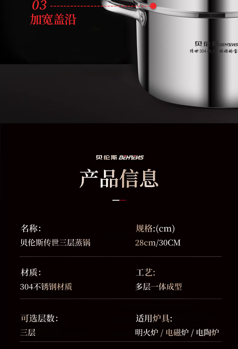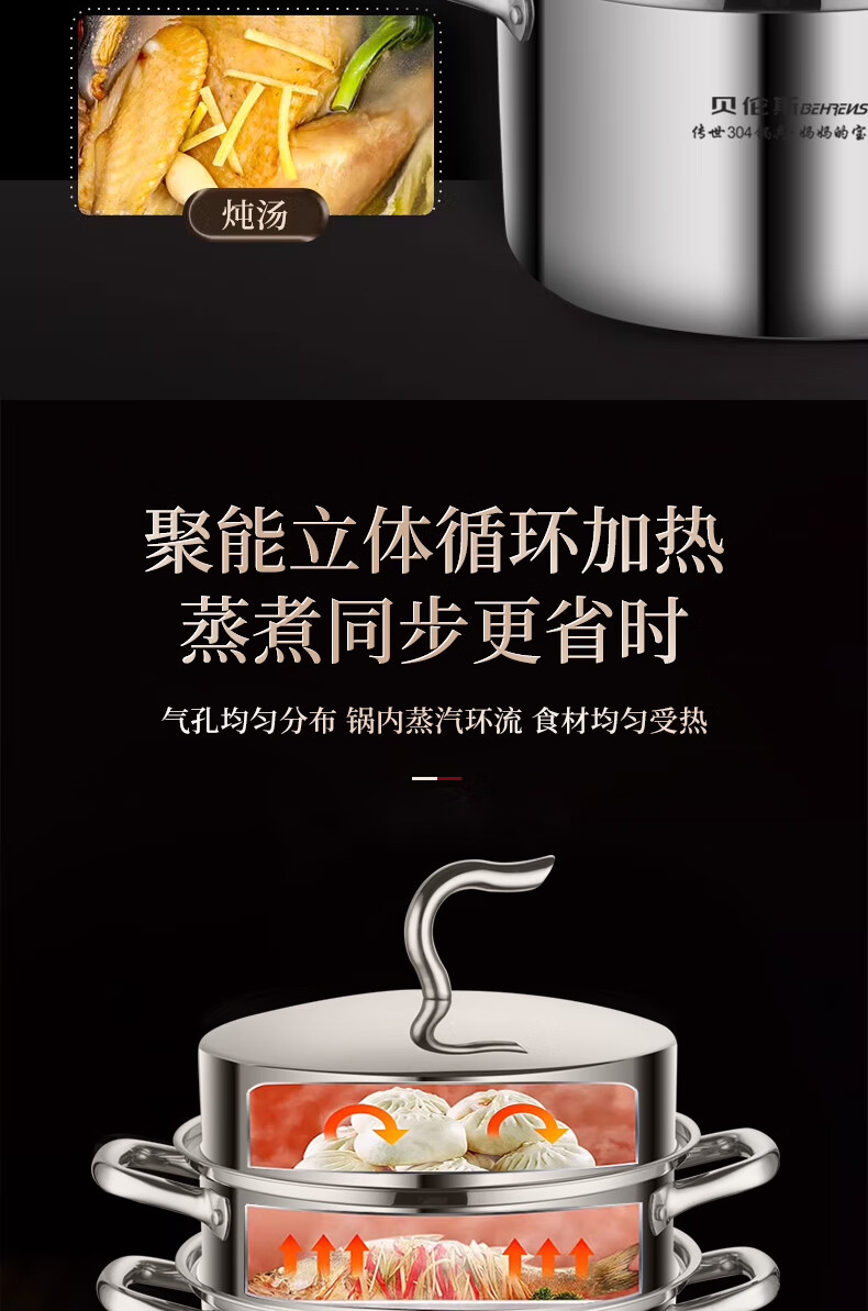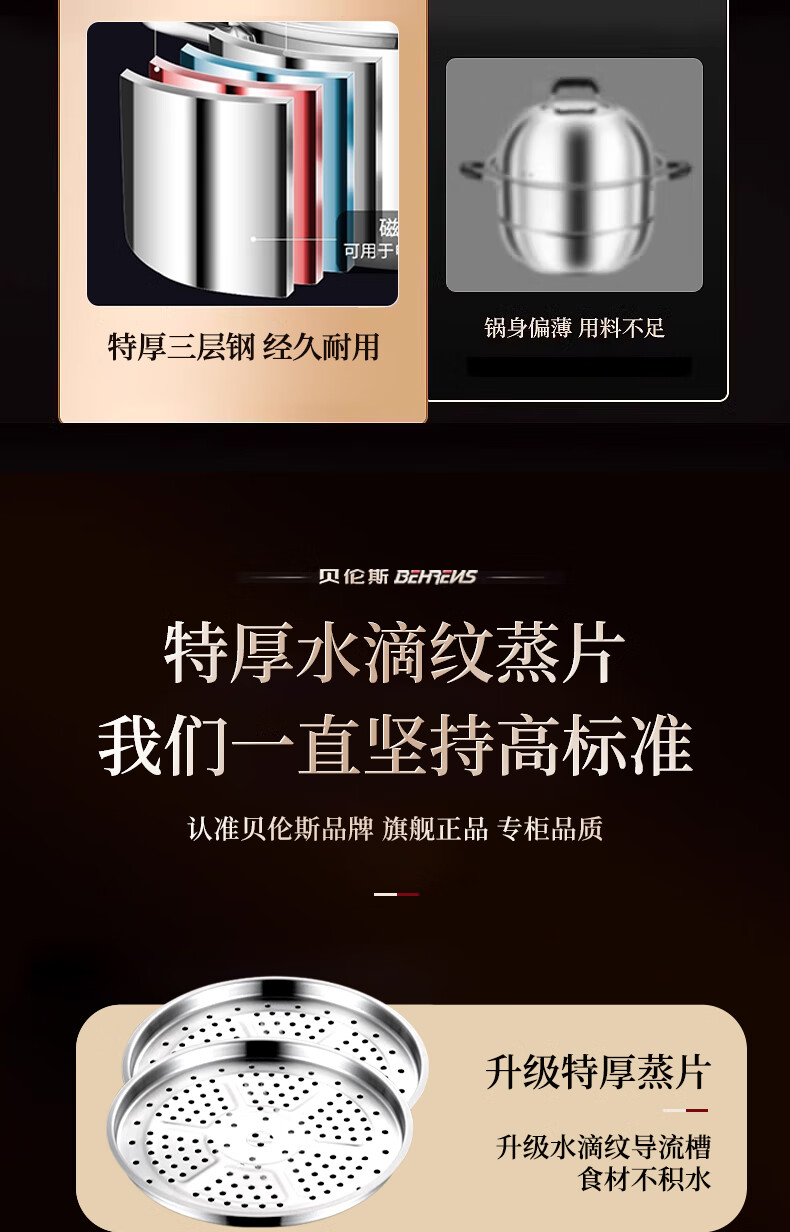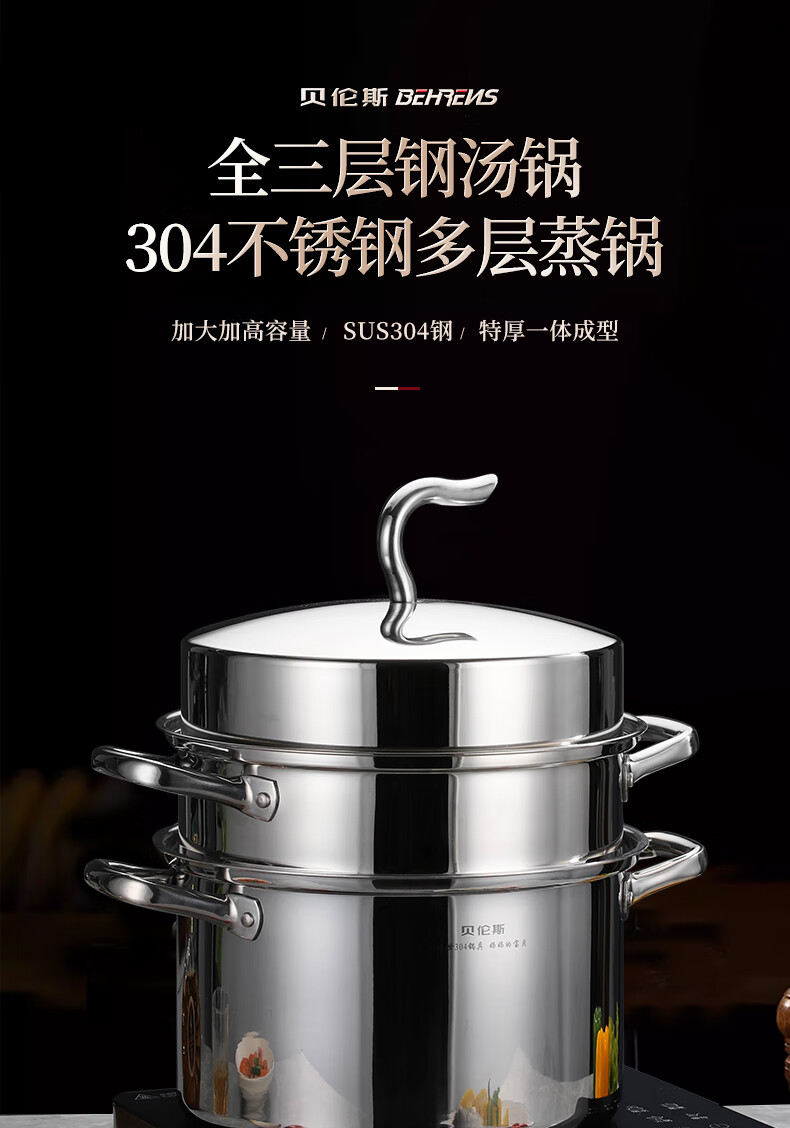 Behrens 304 stainless steel steamer gas stove induction cooker steamed buns steamer home steaming dual-purpose thickened three layers
