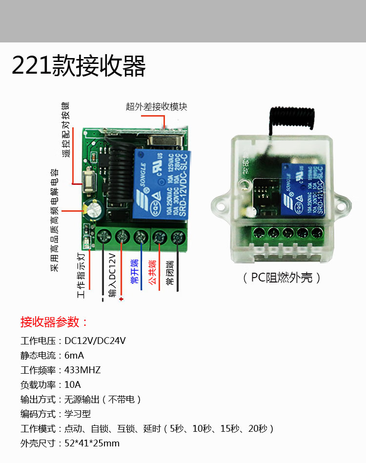 Shahu DC 12V wireless remote control switch 221B DC12V receiver comes with a black two-button remote control (live output)