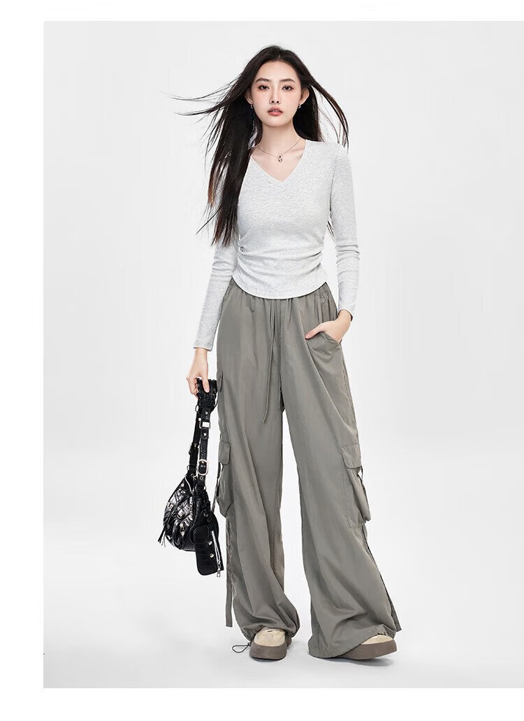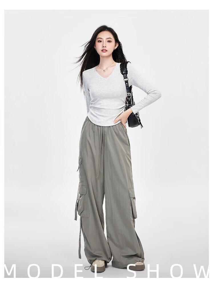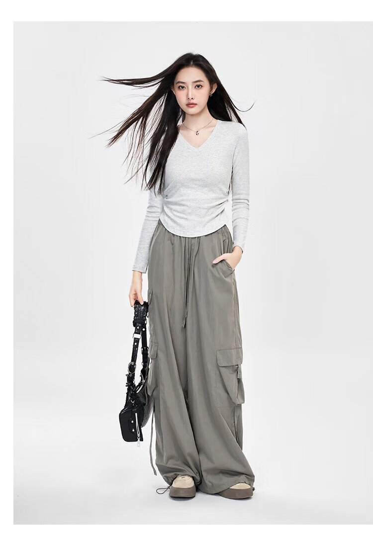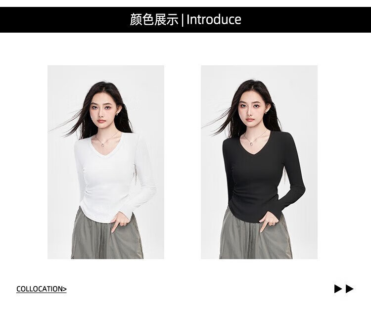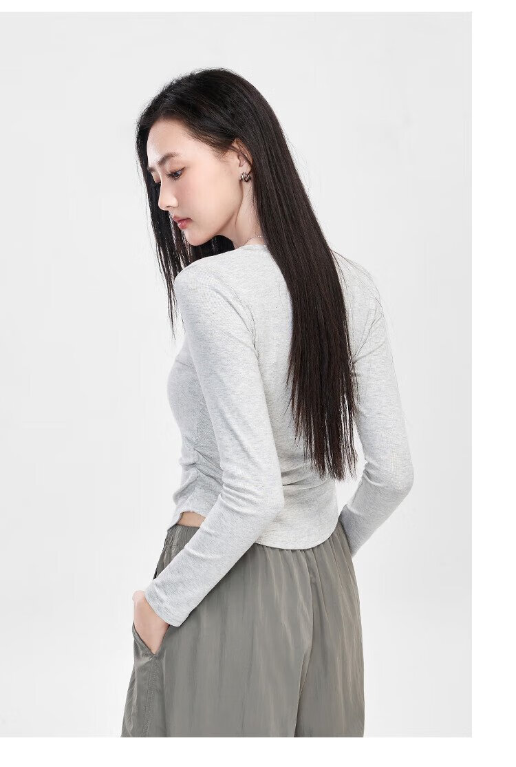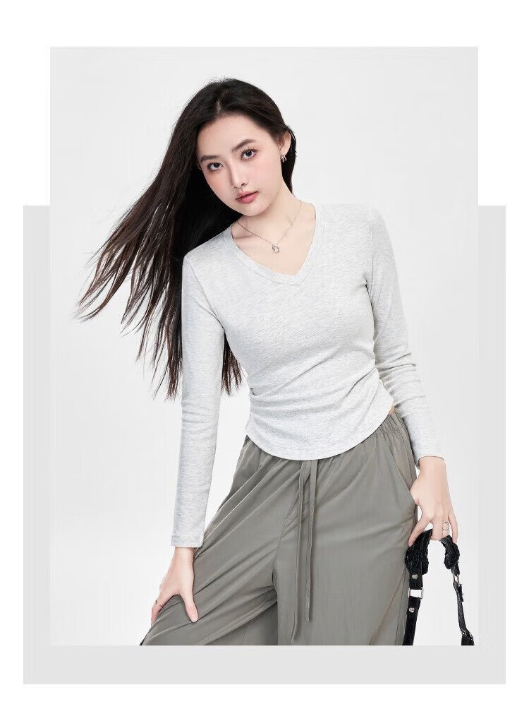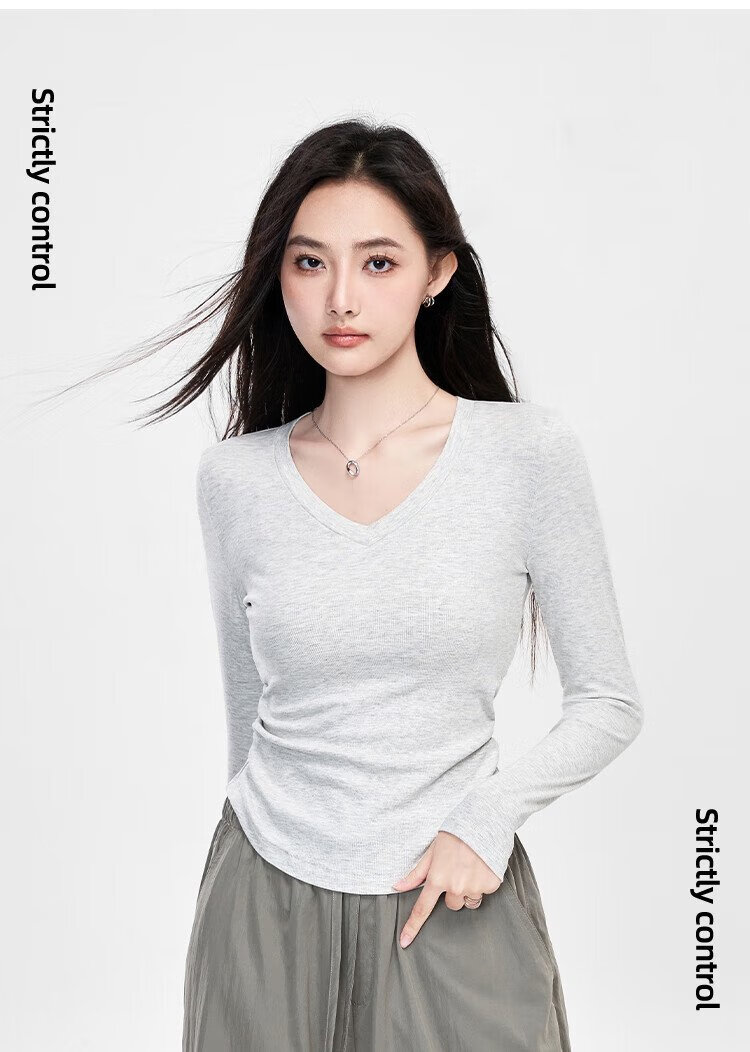 NOMENOMe long-sleeved t-shirt women's new V-neck pleated inner t-shirt slim right shoulder bottoming shirt white M