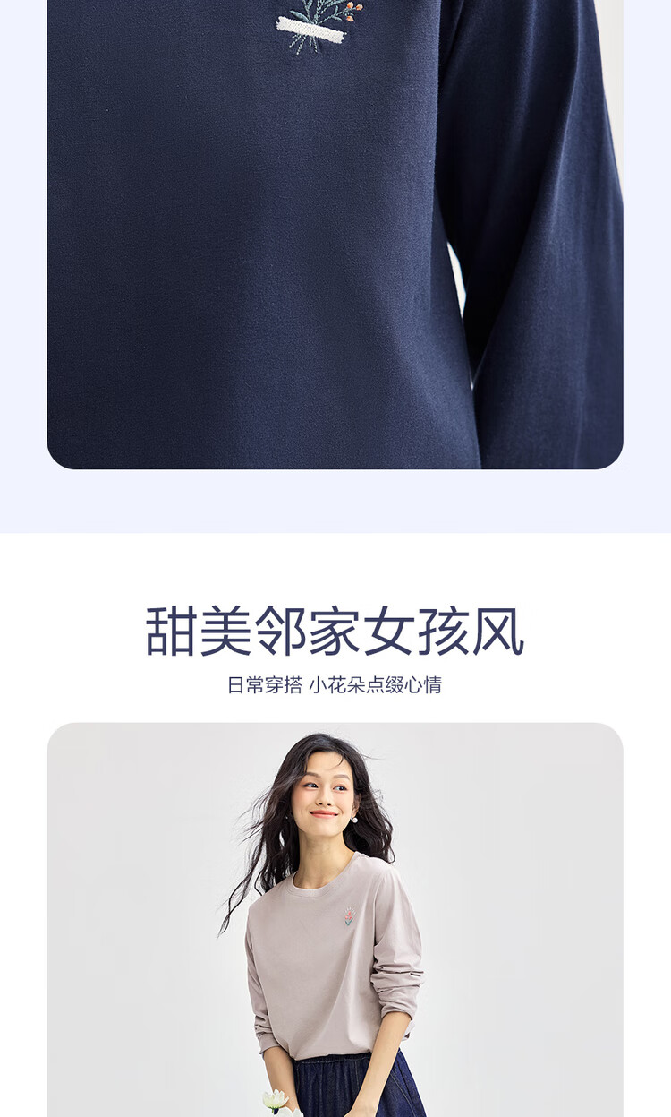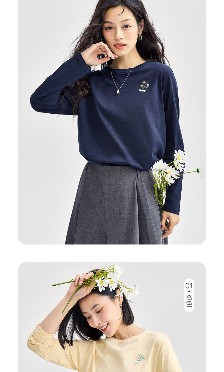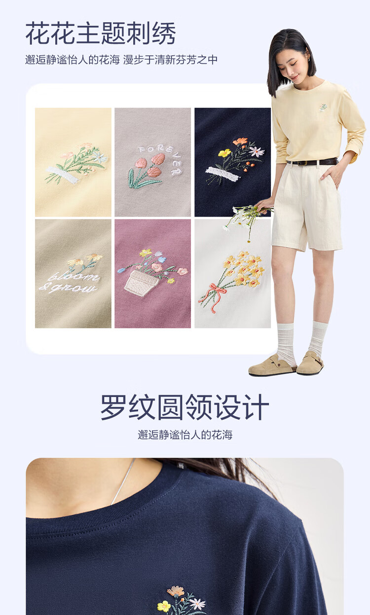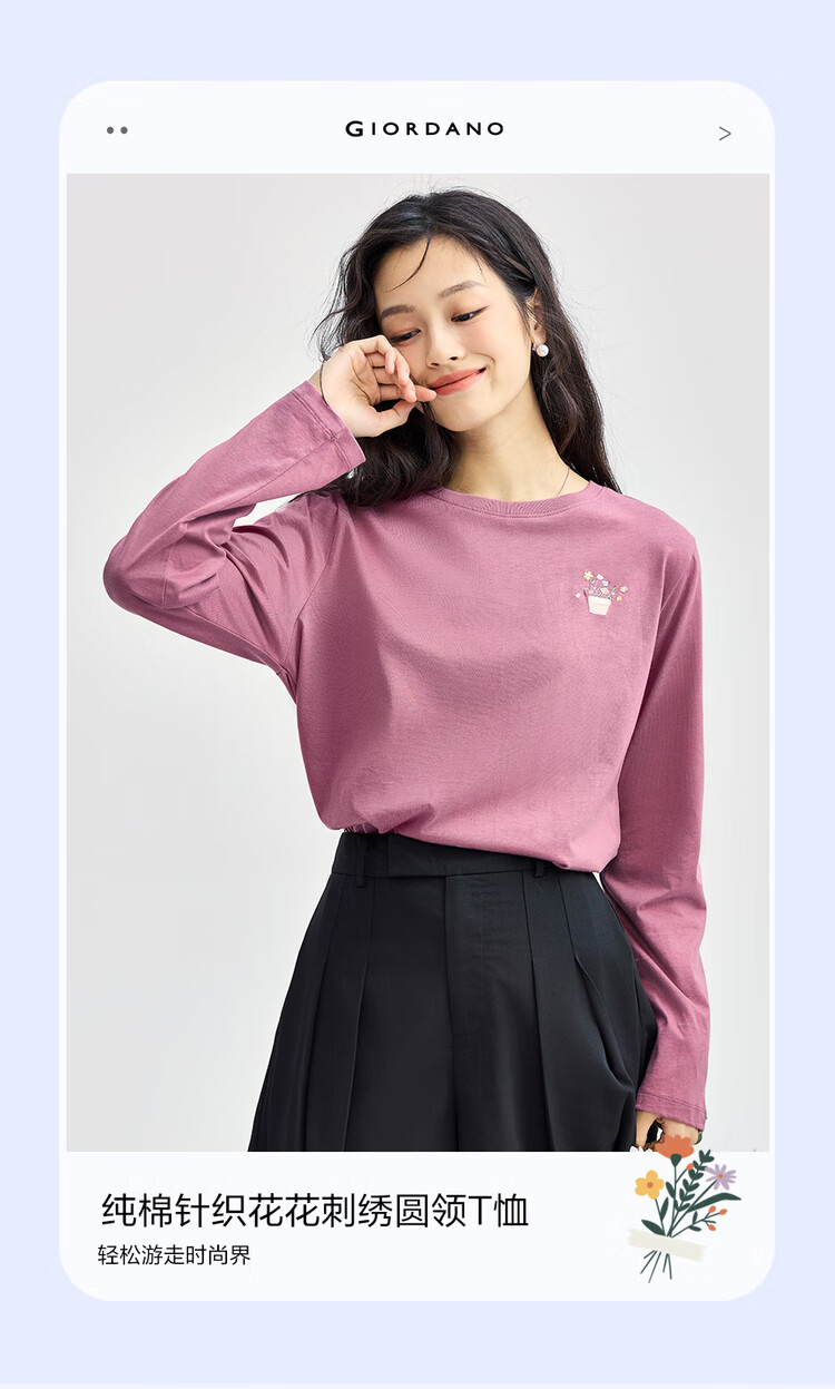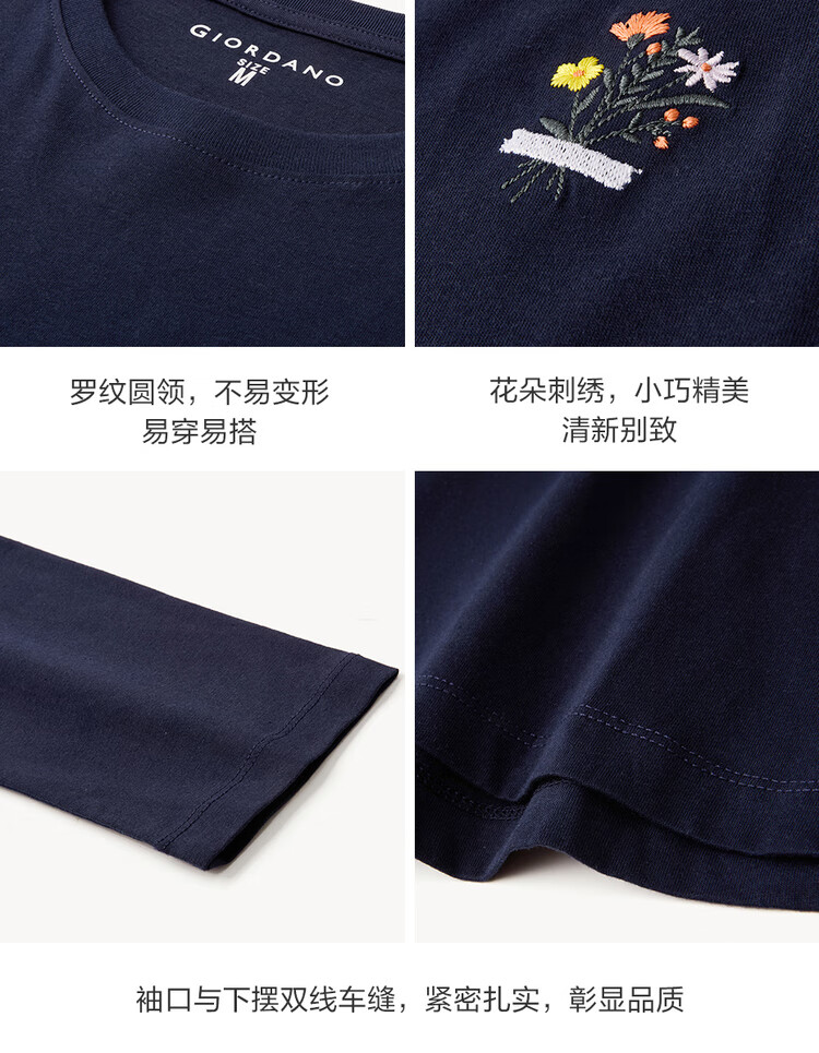 Giordano long-sleeved T-shirt women's pure cotton bottoming shirt sweet flower embroidered round neck pullover 13324792
