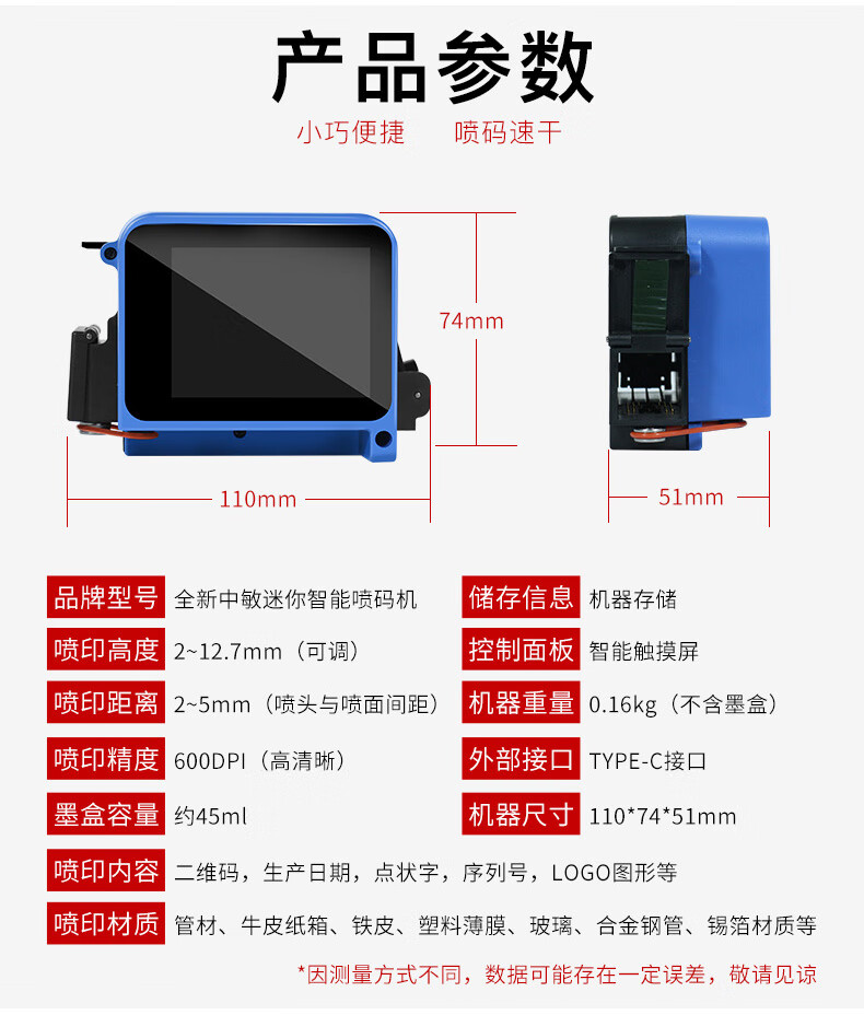 Zhongmin mini handheld mini inkjet printer fully automatic small coding machine prints production date smart coder label food plastic packaging bag can bottle bottom QR code