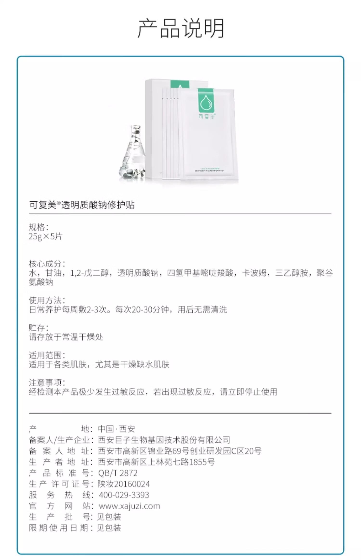 5 pieces of Kefumei sodium hyaluronate repair patches moisturize and moisturize the skin