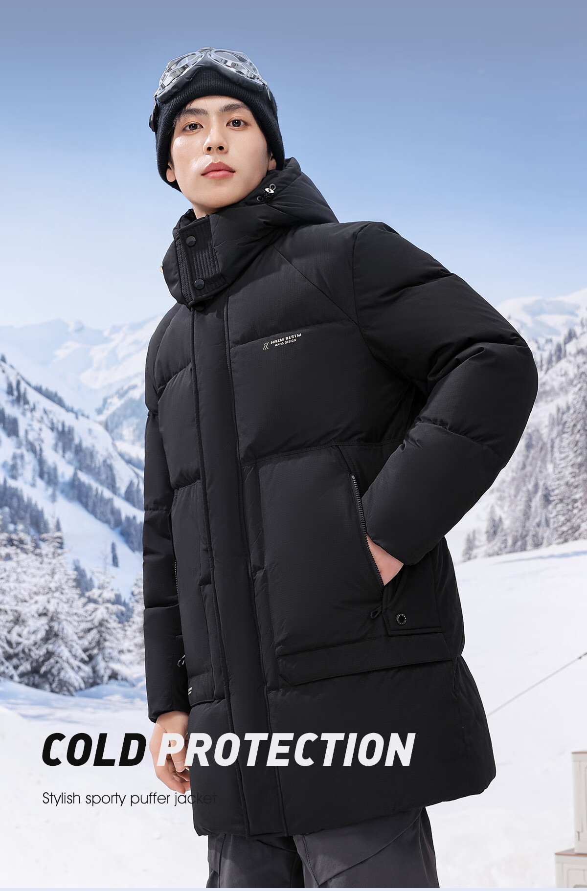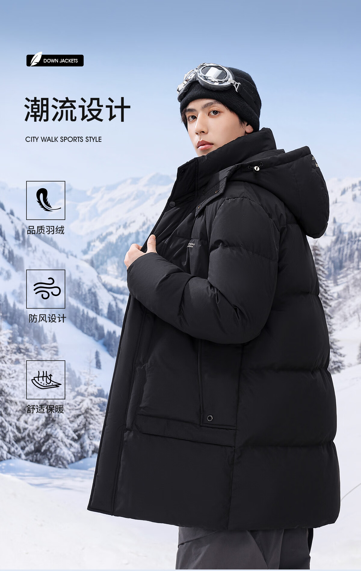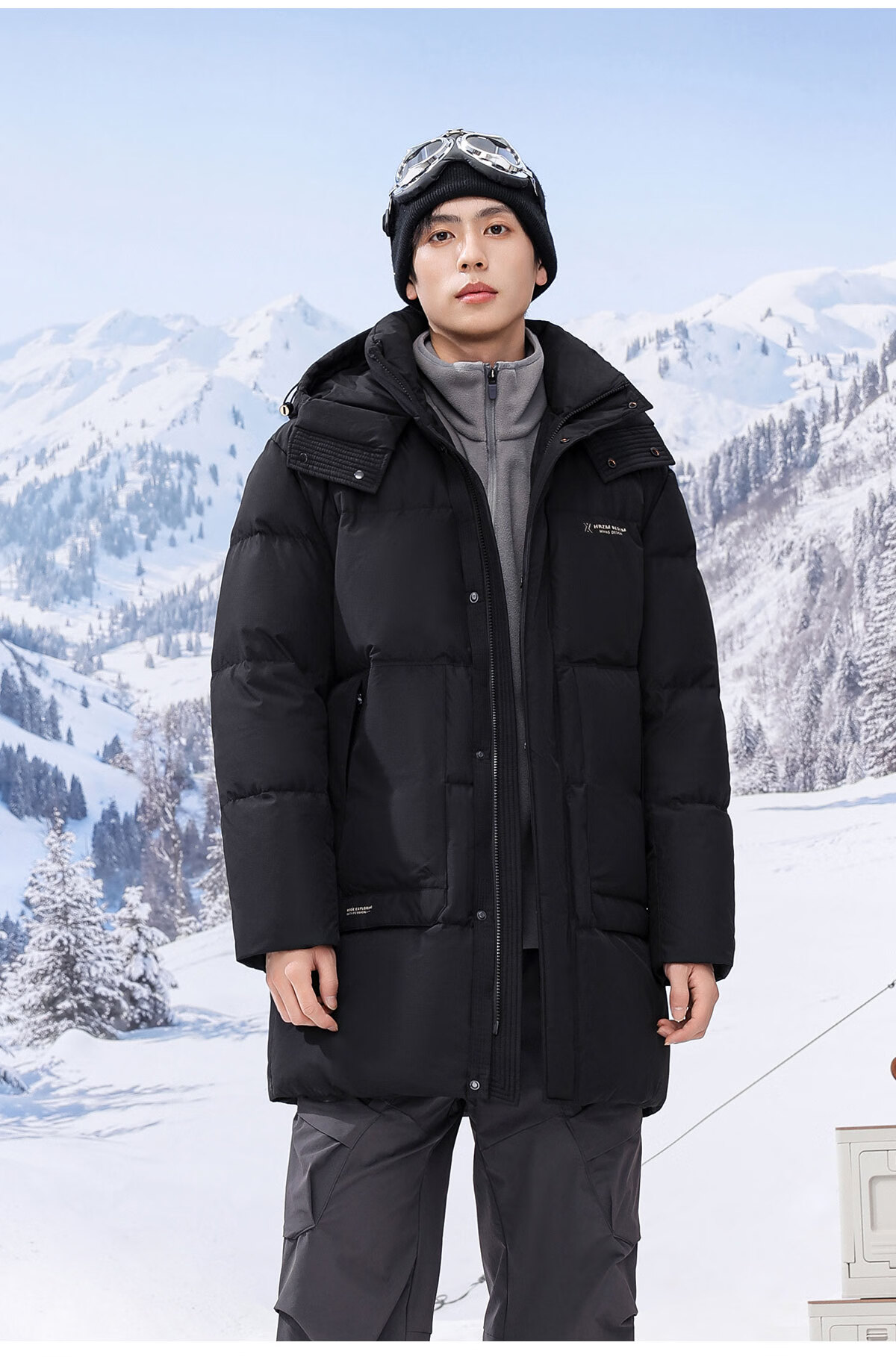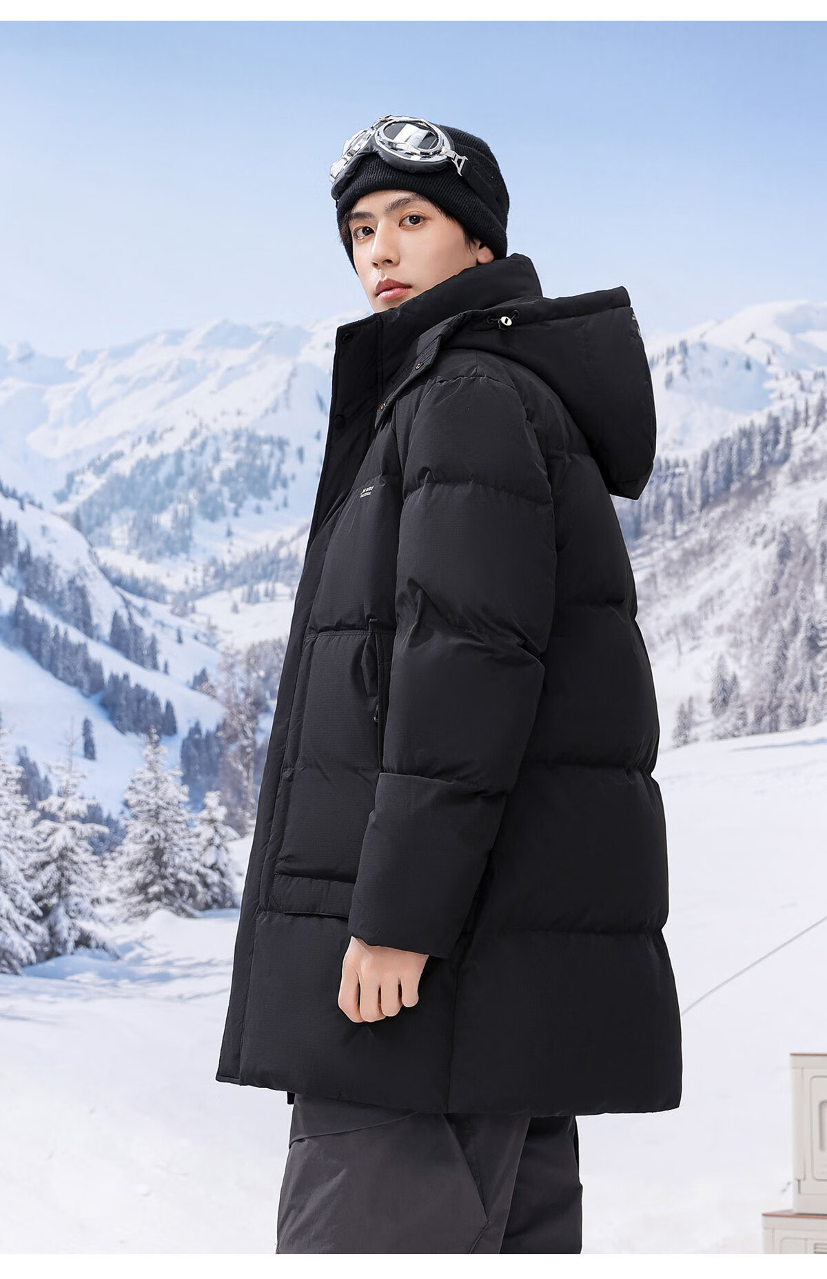 Flying in the Snow Men's Mid-Length Down Jacket 2025 New Letter Printed Hooded Fashionable Warm Jacket Gemstone Black XL