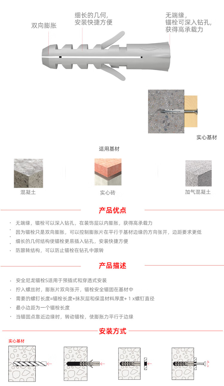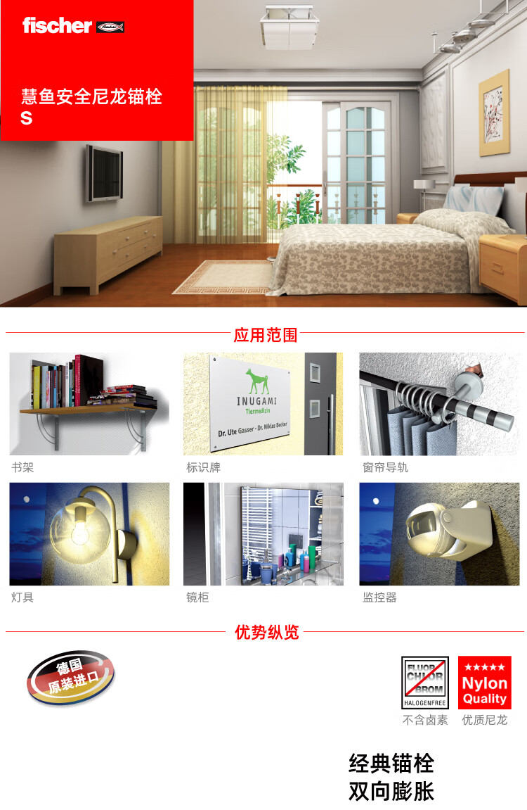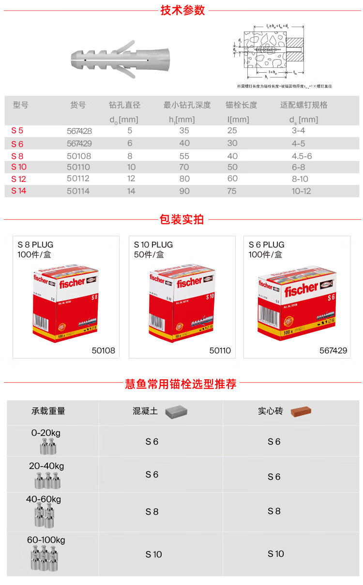 Fischer safety nylon expansion screw S series concrete solid bricks original imported boxed S6x30 single tube boxed 100 pieces 567429