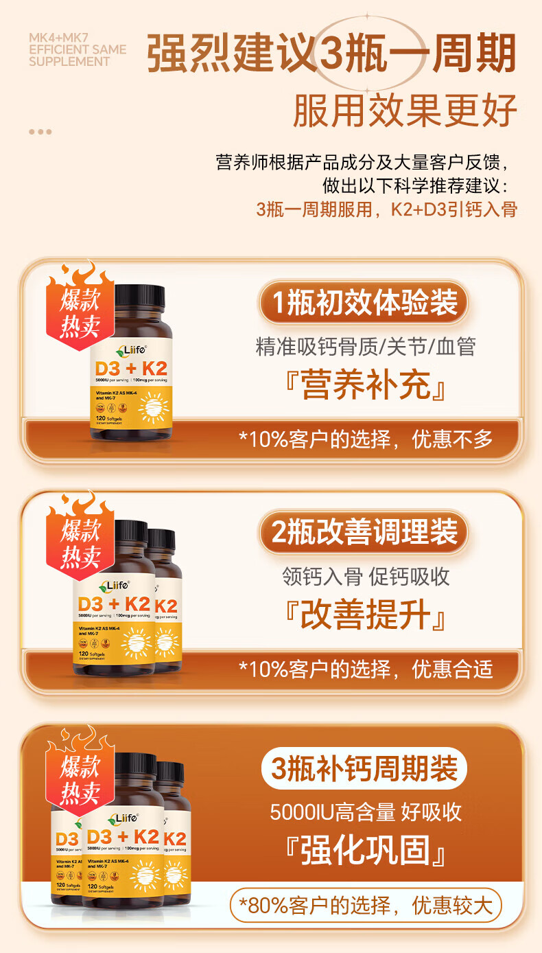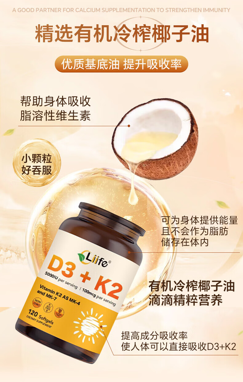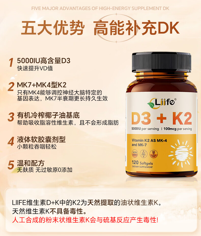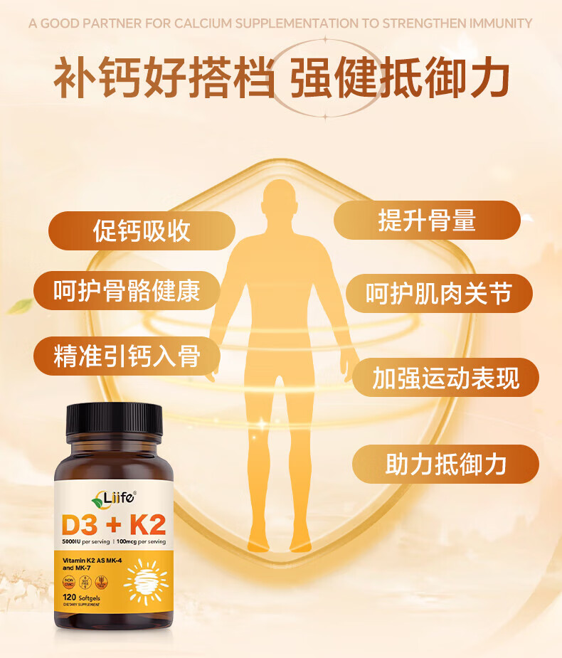 Liife US imported sunshine vitamin D3+K2 capsule bottle 5000IU two plus magnesium three-in-one MK7 adult 120 capsules