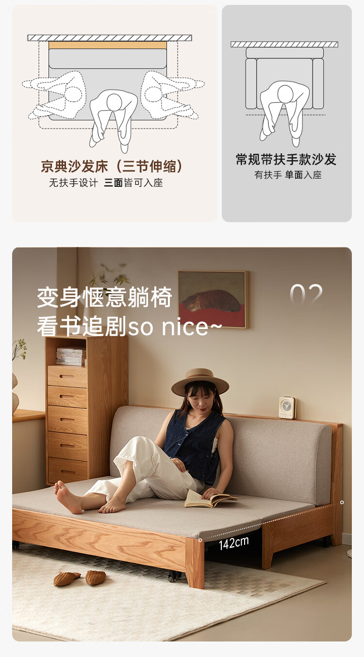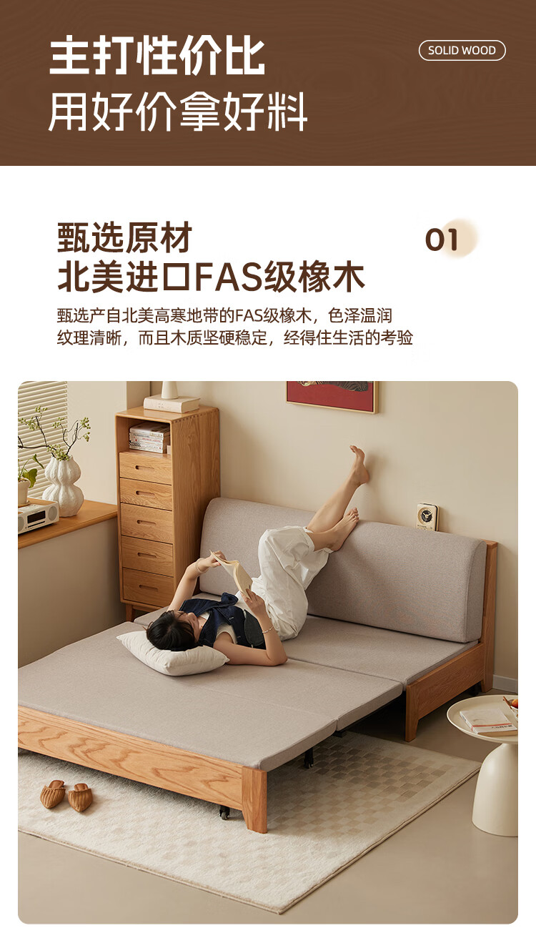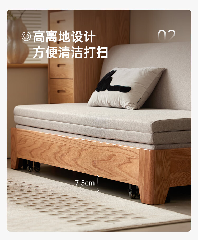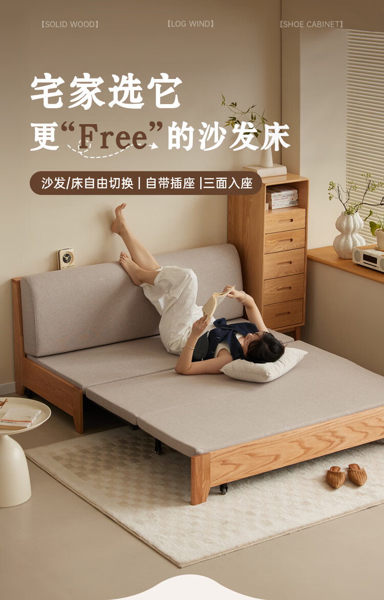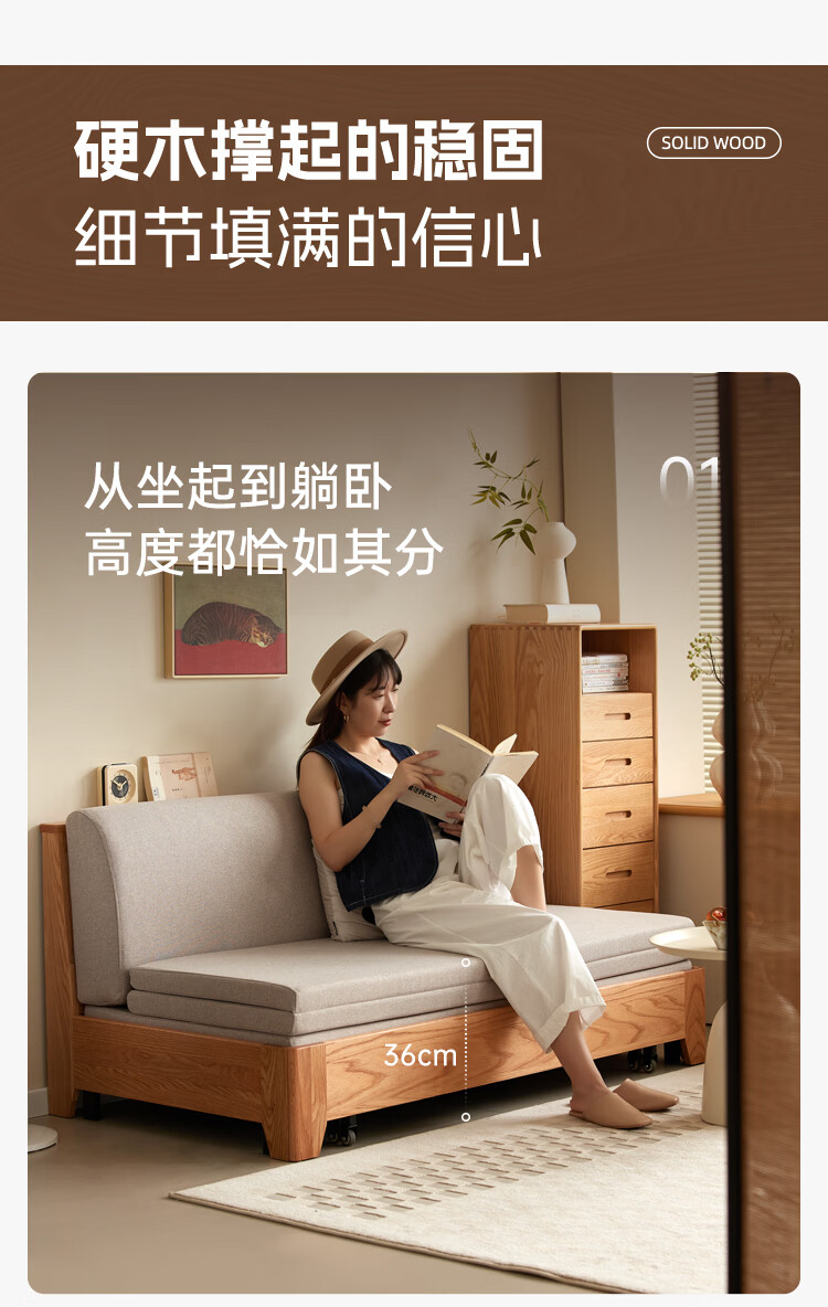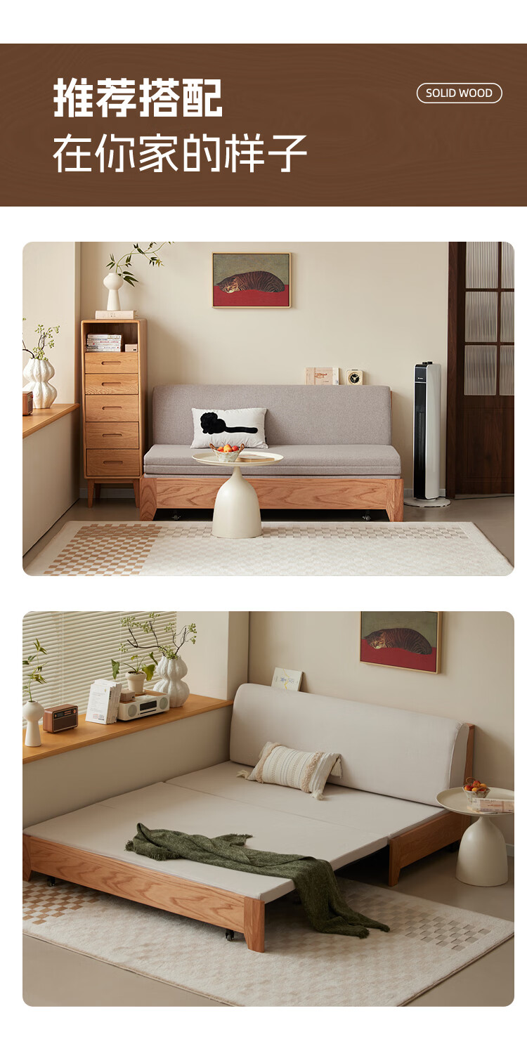 Original element modern simple solid wood sofa bed small apartment multi-functional folding 1.2m light beige N1067